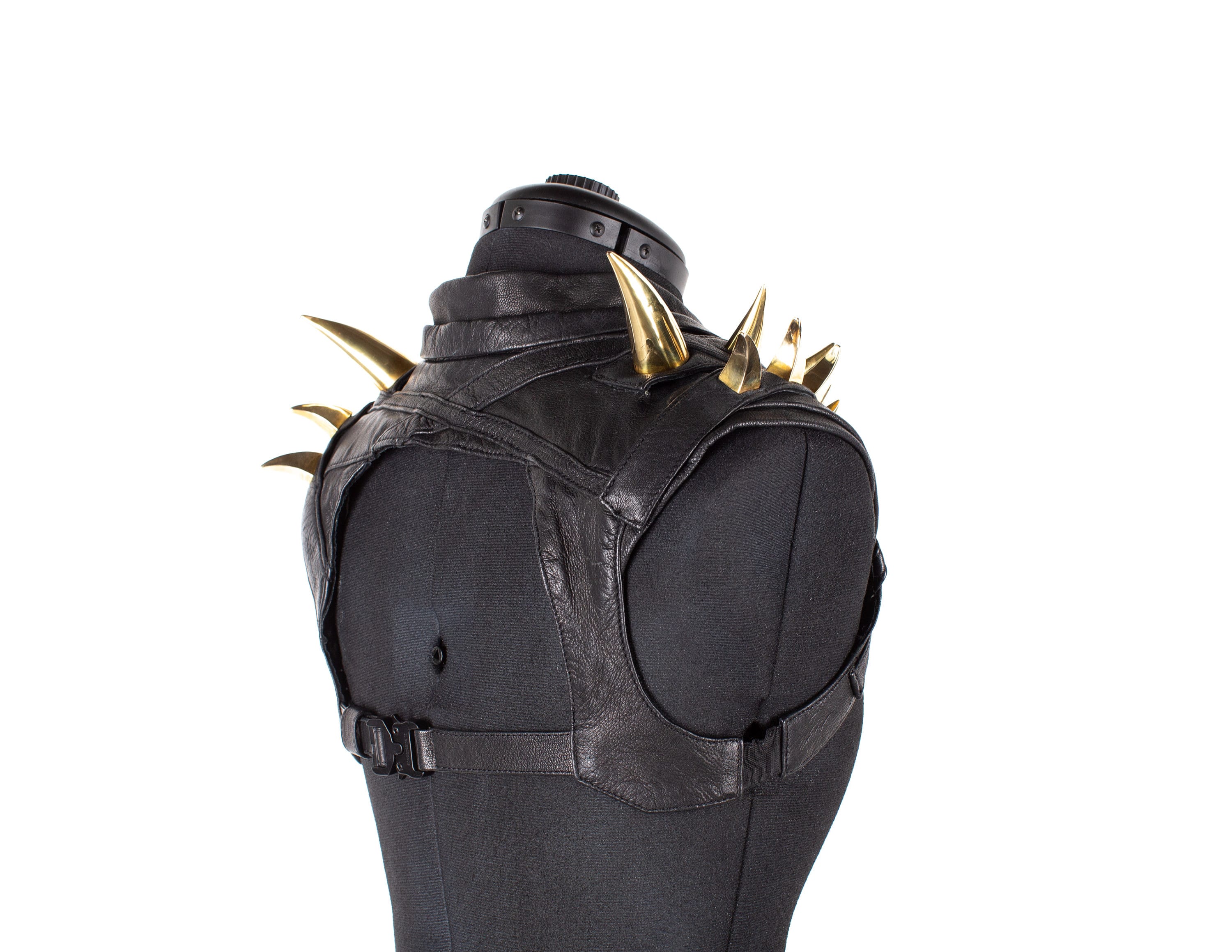 A cropped chest plate made of black leather, accented with dimensional metal plates and modular gold spikes that Double as epaulettes.