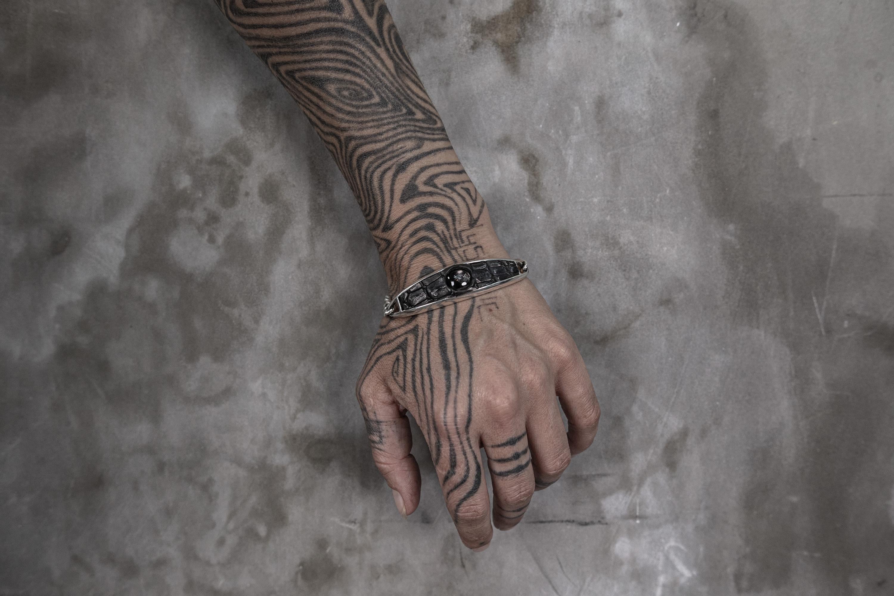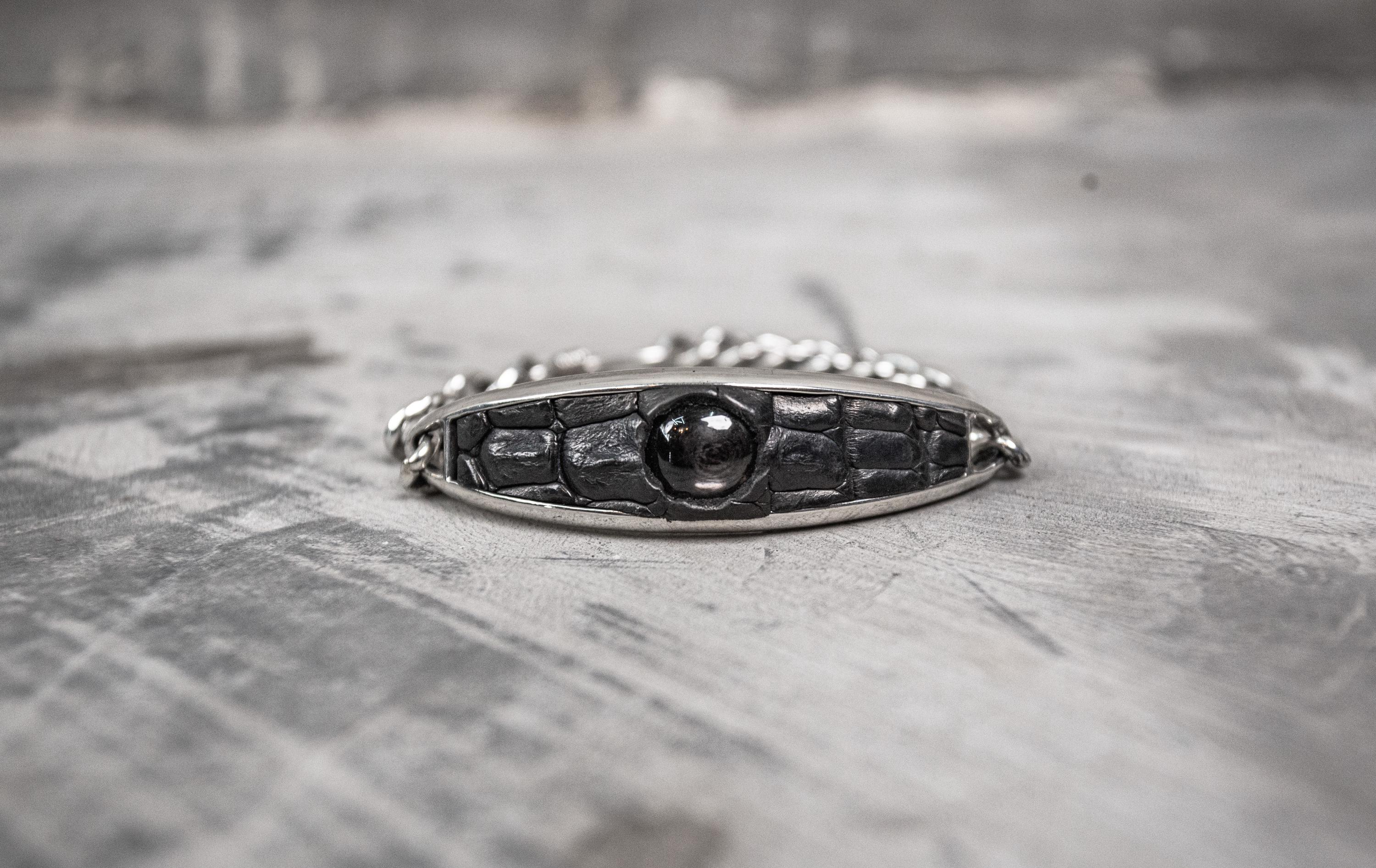 This sterling silver bracelet features a hypersthene stone set into black crocodile scale-patterned leather set in silver. The hypersthene displays a subtle metallic shimmer beneath its deep charcoal surface, catching light with a smooth, almost liquid sheen that adds depth without excess shine.