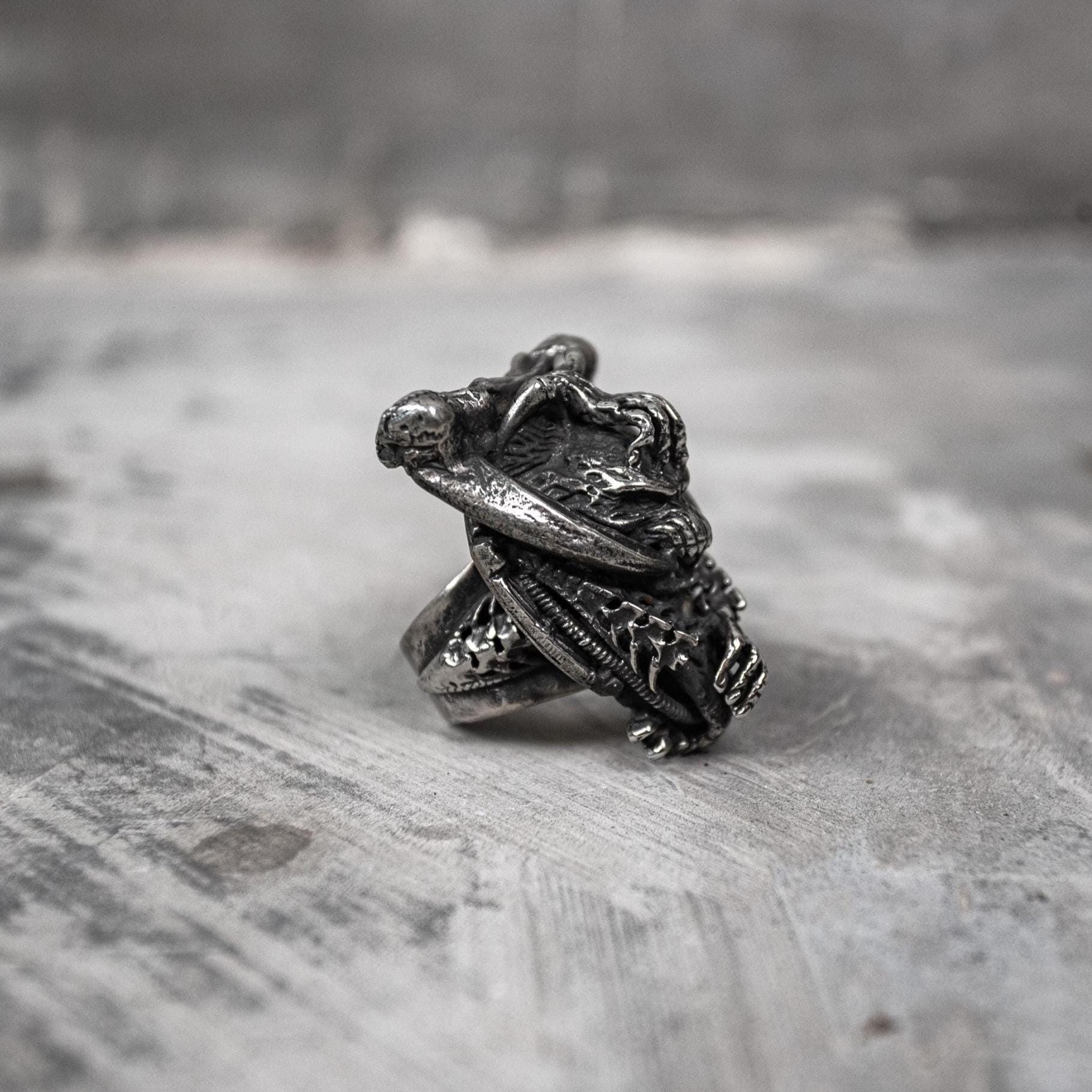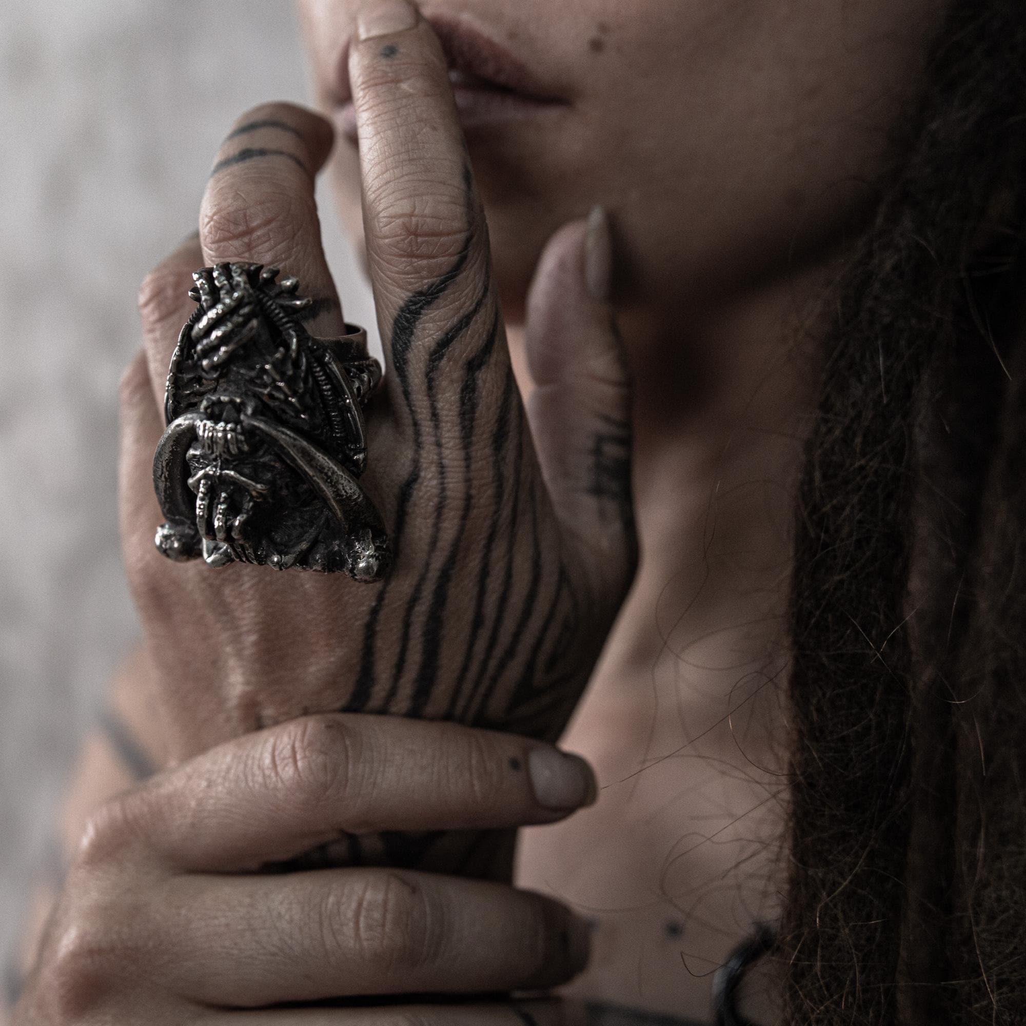 The Demon Beast Ring merges dark fantasy with industrial craftsmanship — a sculpted hybrid of nature and machine. Featuring a beast like creature encased within sweeping horn-like structures that wrap around it like a cage, this design evokes both power and confinement. The ring’s body is crafted from German silver, chosen for its ability to hold deep oxidized black line details that enhance every intricate ridge and curve. A solid sterling silver band anchors the design, providing balance, strength, and comfort.