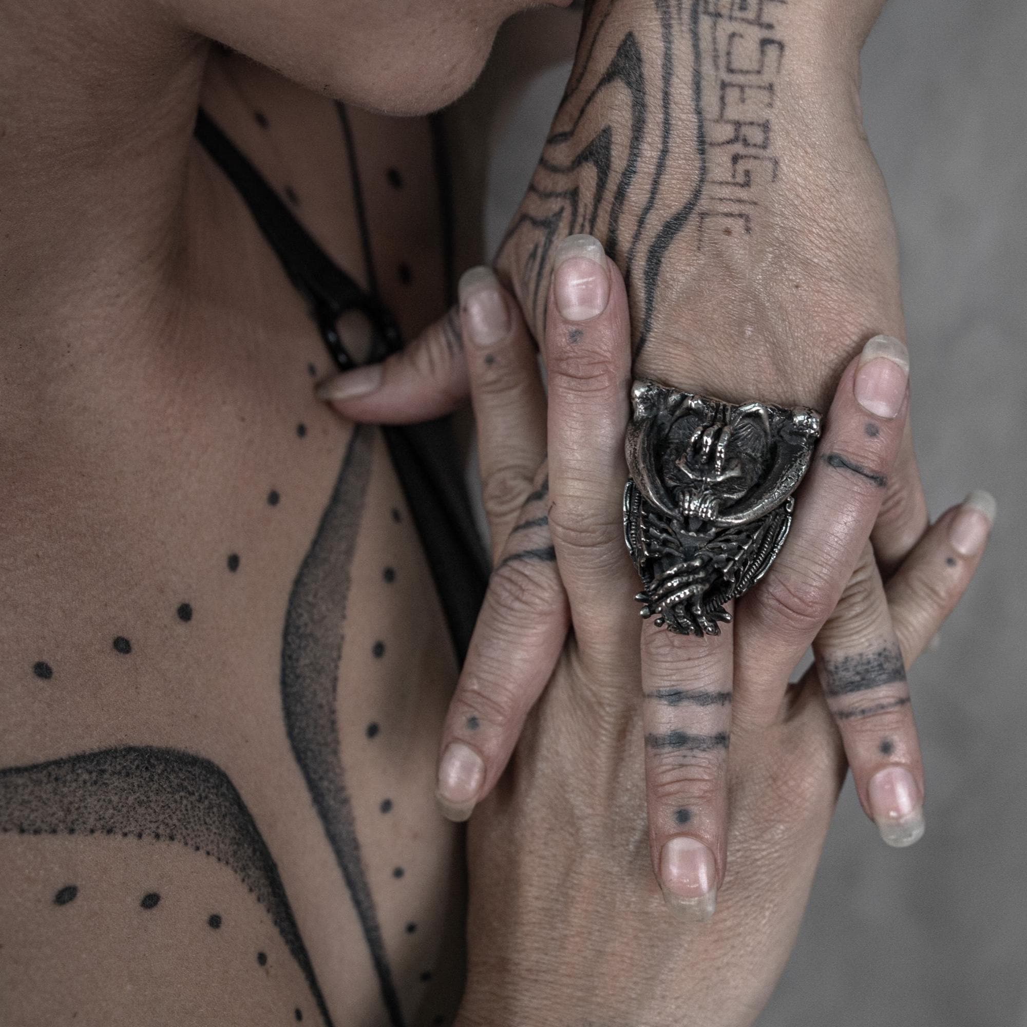 Inspired by gothic art and biomechanical sculpture, this piece channels the energy of transformation — fusing organic anatomy with metallic precision. The encircling horns represent both protection and restraint, embodying the tension between chaos and control.