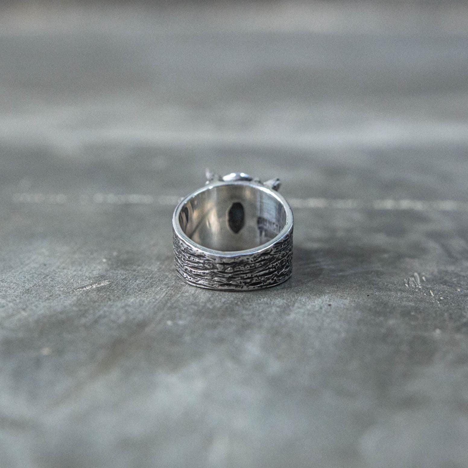 Bold turquoise statement ring featuring a rugged crown bezel and wide textured sterling silver band. This handcrafted piece showcases a vibrant turquoise stone with natural veining, set in a crown-inspired bezel. The oxidized 925 sterling silver band adds contrast and enhances the stone’s bold look.