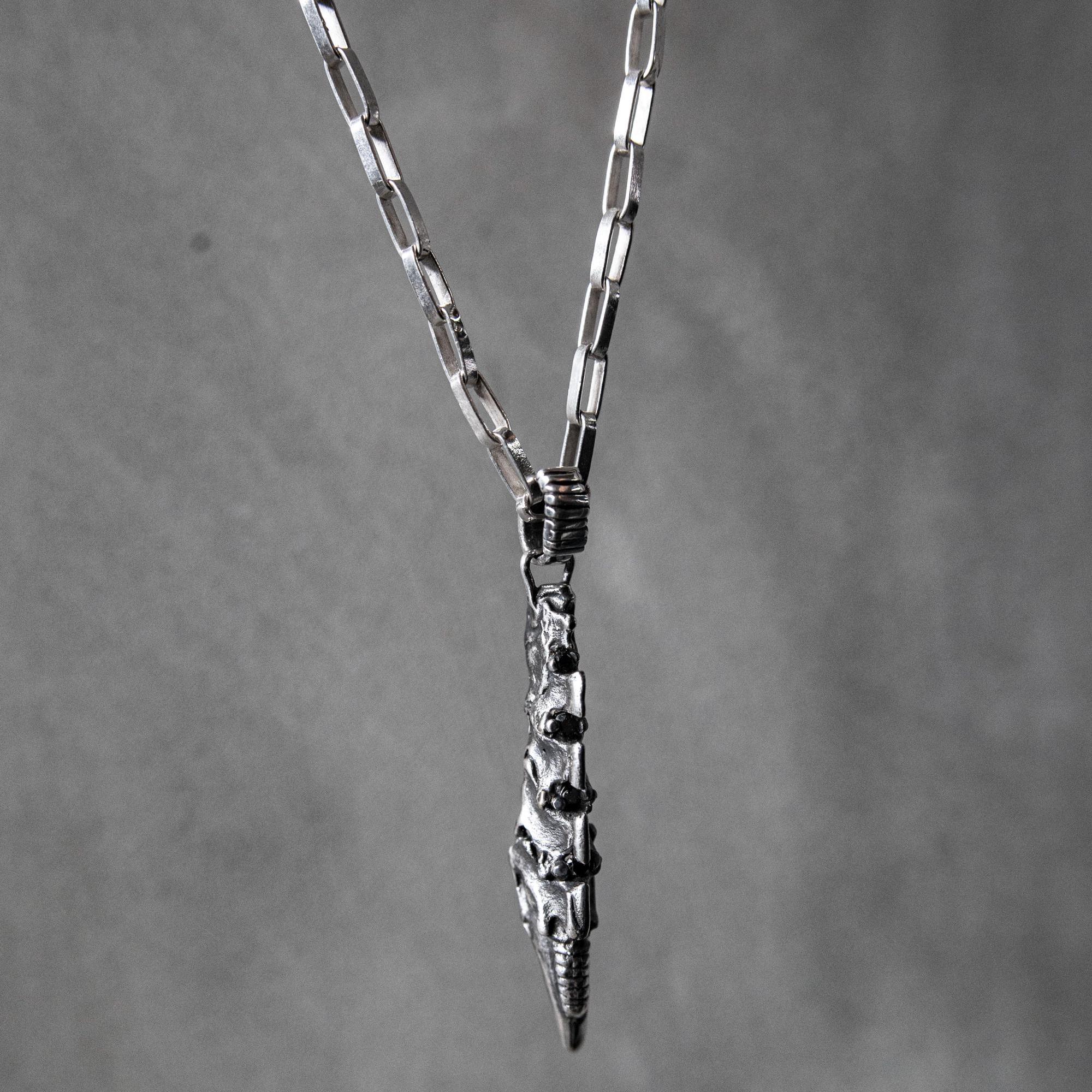 This necklace features a 925 sterling silver biomechanical spine pendant inspired by Giger-style organic machinery and skeletal architecture. Each vertebra is set with a reclaimed black diamond, giving the piece a dark, subtle shimmer that moves down the spine. The form tapers into a fang-like point, blending anatomical structure with industrial minimalism. It hangs from a solid 21.5" (54 cm) sterling silver chain, creating a bold unisex piece designed for everyday wear.