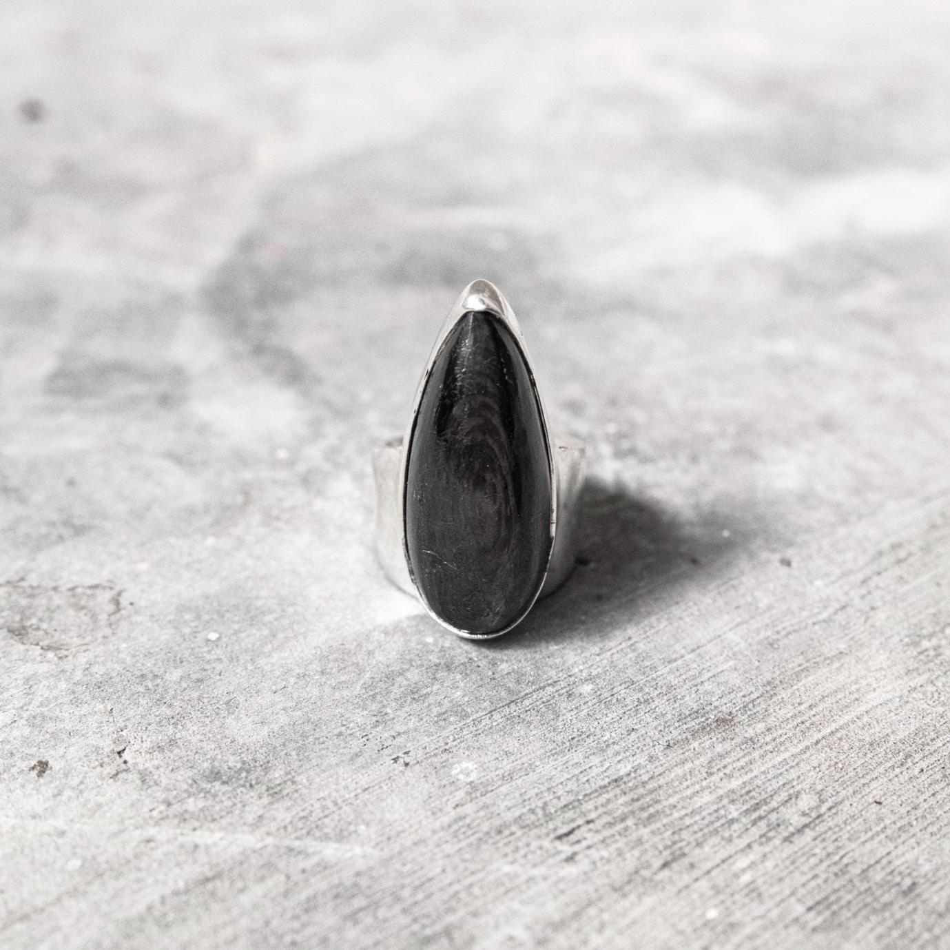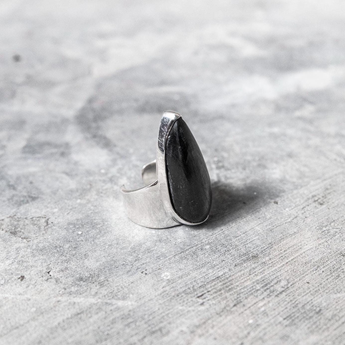 A modern alternative statement ring made to be worn in two ways: at the tip of the finger like a fingernail claw, or as a traditional ring at the base of the finger. The open-back design allows the band to flex, letting you choose your size and fit. Set with natural hypersthene, each stone flashes with a silky metallic shimmer that shifts as you move — a phenomenon so unique that photos never fully capture its depth in person.