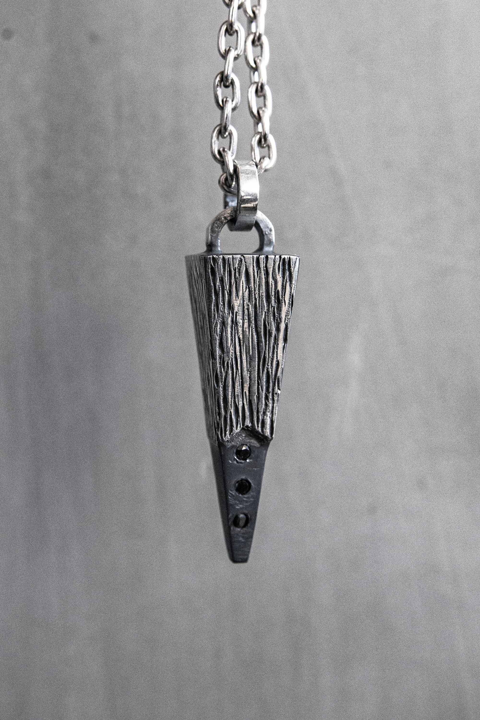 The pendant is handcrafted from 925 sterling silver, shaped into a clean spike form with a tapered profile. Each reclaimed diamond is individually set into oxidized silver and framed with hand-textured detailing. Because every stone and pendant is finished by hand, slight variations make each necklace unique.