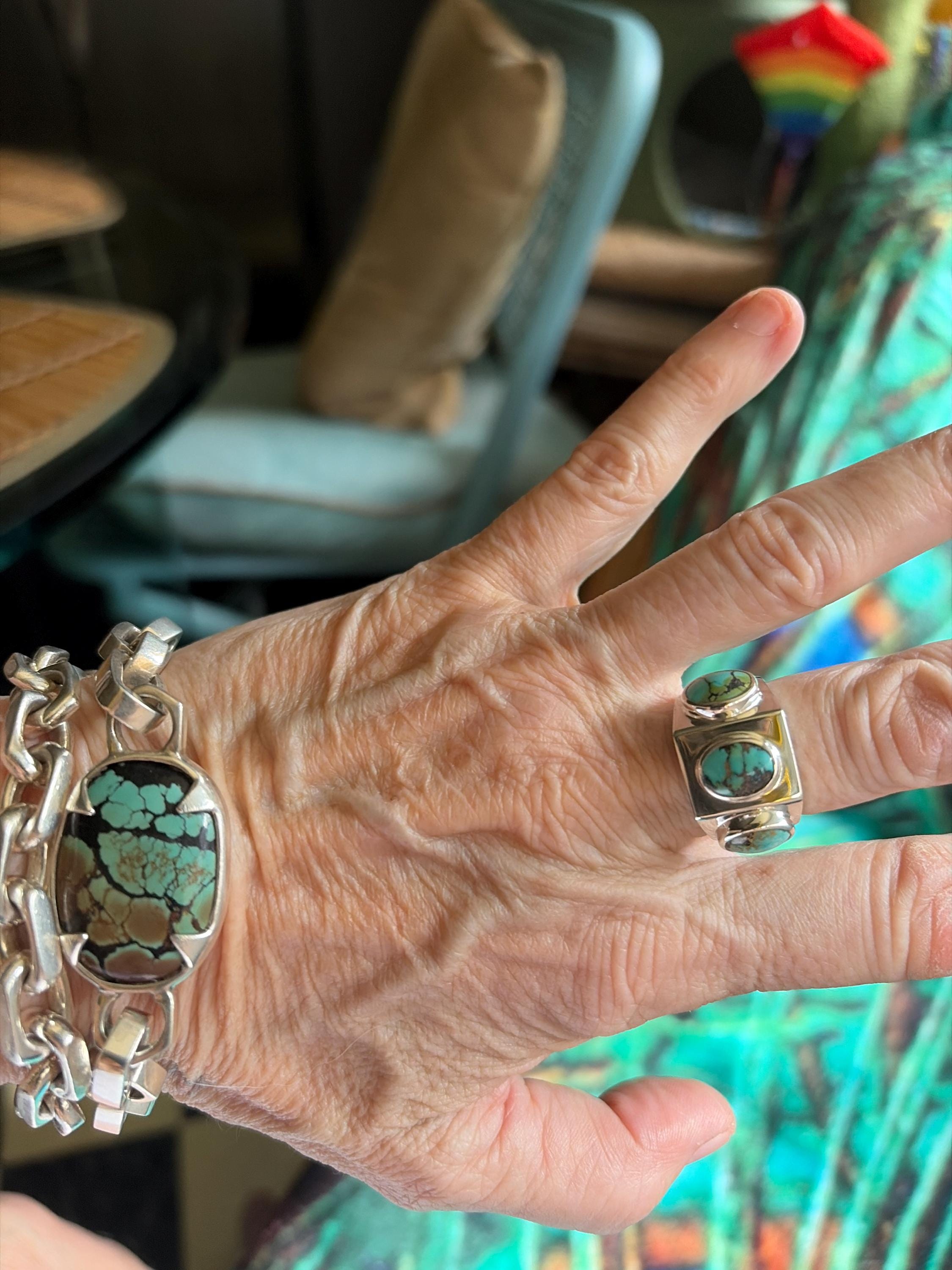 Three stone turquoise ring with a clean structured setting and bold design with modern simplicity. This handcrafted piece features three vibrant turquoise cabochons arranged in a sleek, symmetrical silver setting. The wide, polished sterling silver band creates a refined silhouette that highlights the stones’ natural blue-green hues and unique veining. The three-stone design carries symbolic meaning, often representing balance, harmony, and the connection between past, present, and future, adding both style and significance.