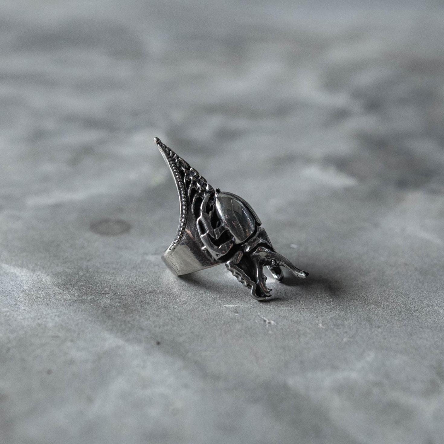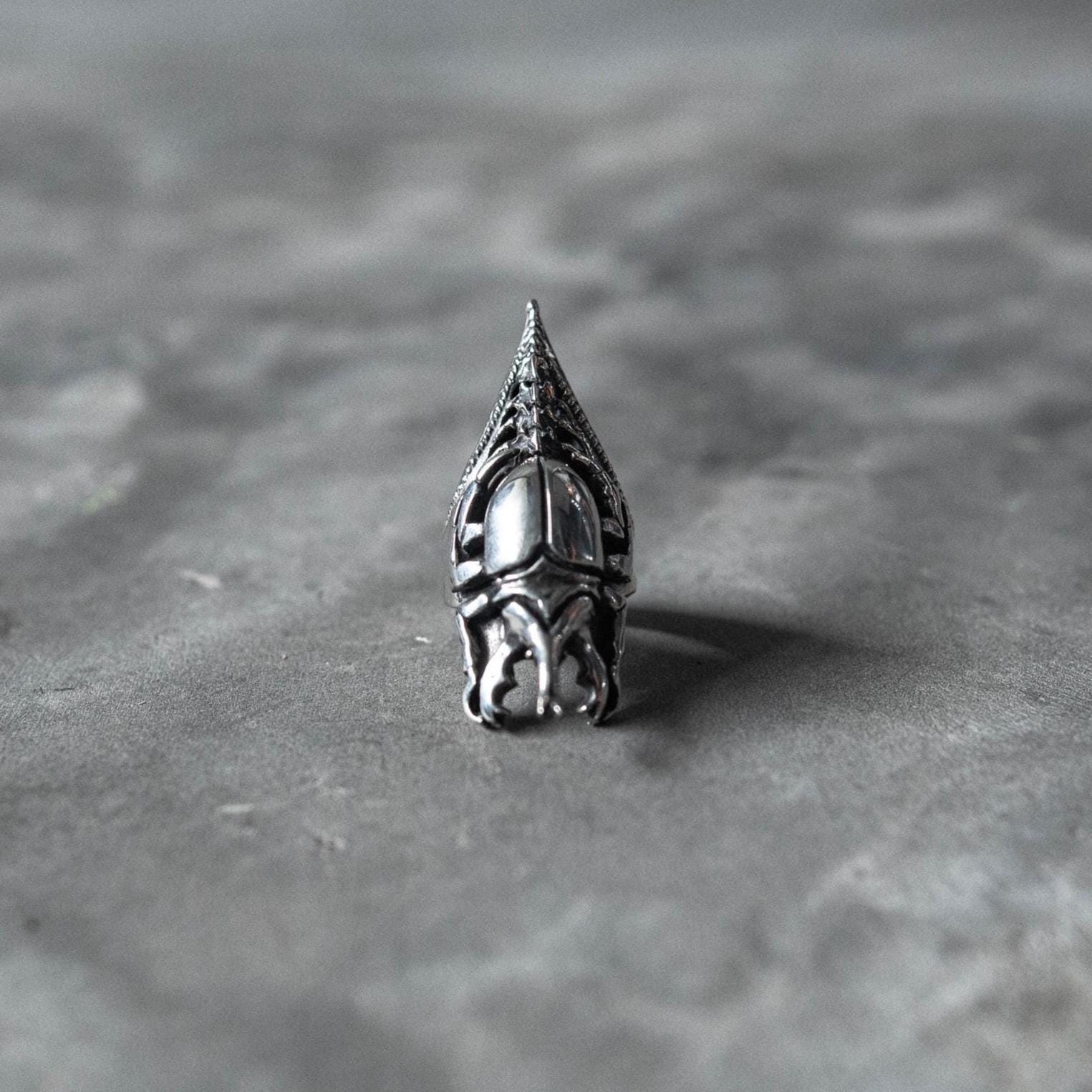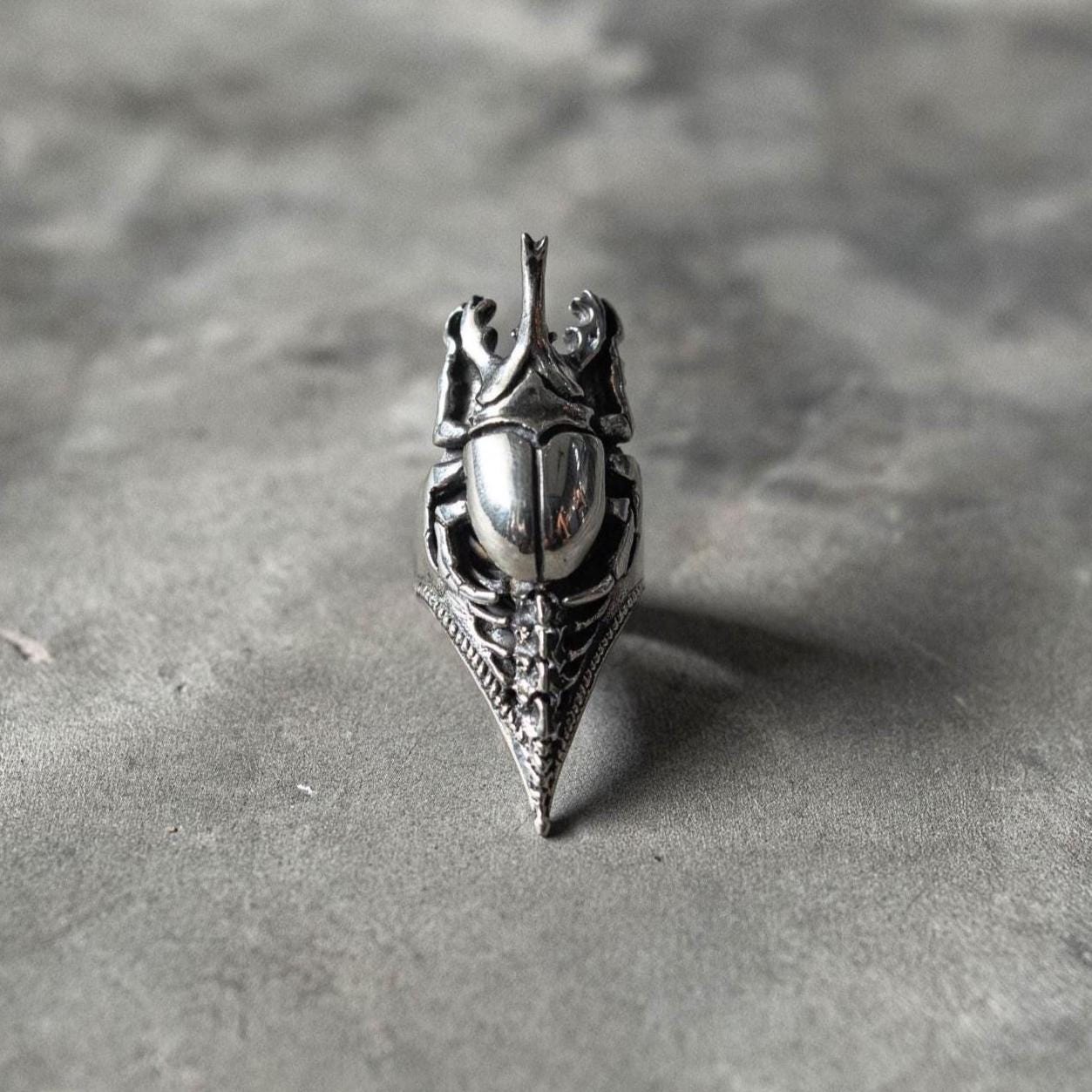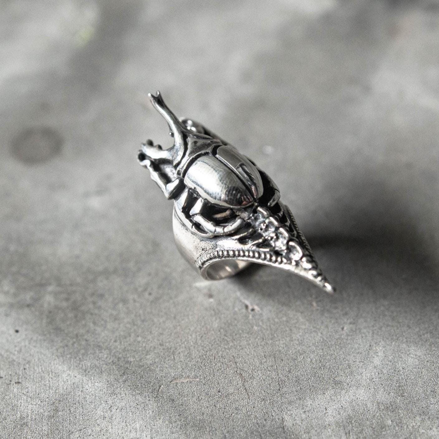 The Scarab Spine Ring merges ancient symbolism with futuristic craftsmanship — a bold fusion of gothic, biomechanical, and Egyptian-inspired design. Featuring a sculpted German silver scarab beetle with dark oxidized detailing for maximum contrast, the ring is set on a 925 sterling silver band shaped like a spine and clawed tail. Every curve and joint captures the tension between life and decay, nature and machine — a wearable relic that feels both primal and otherworldly.
