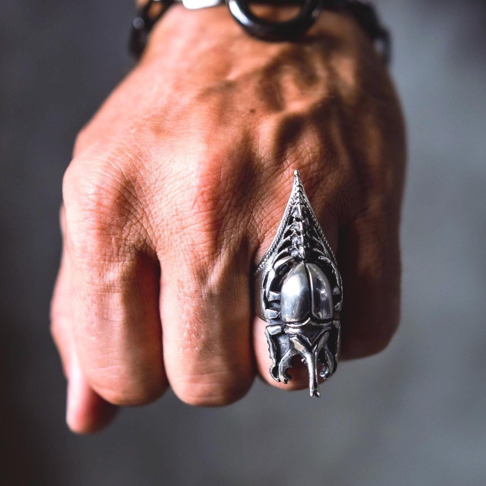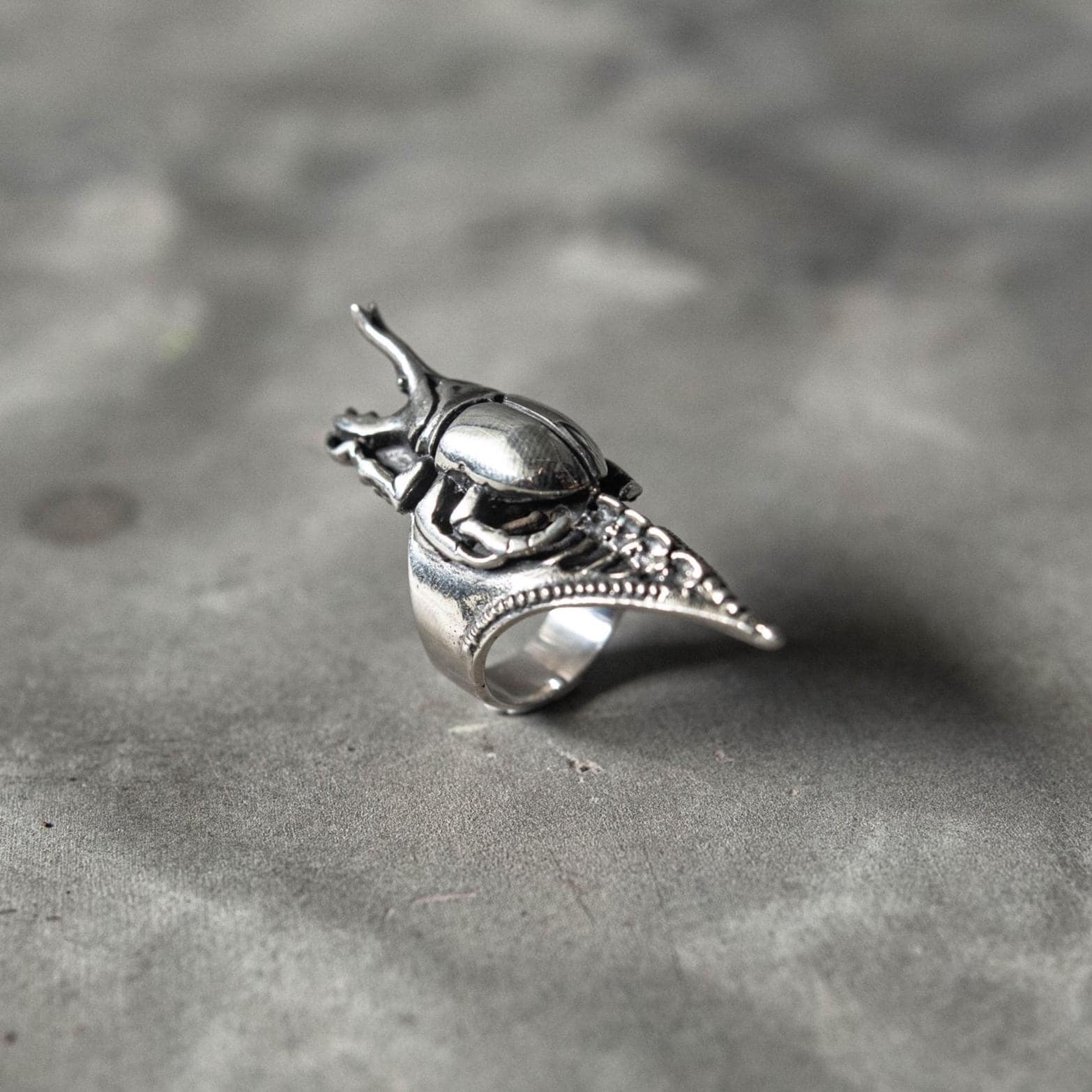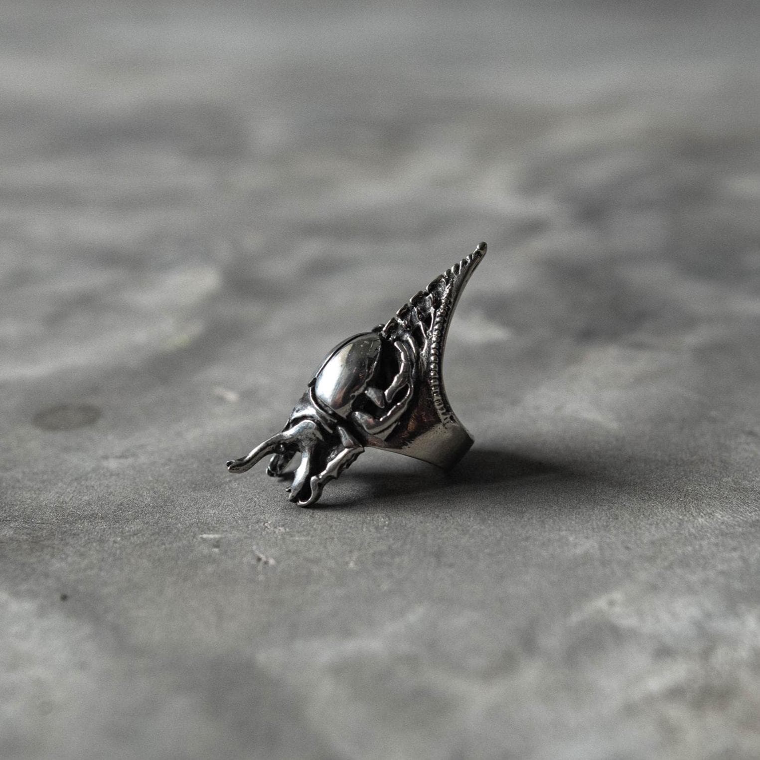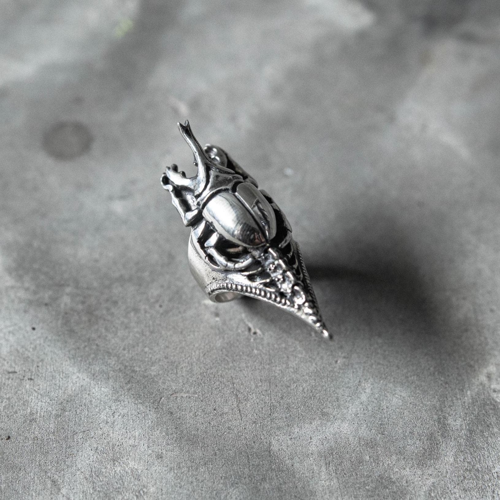 The Scarab Spine Ring merges ancient symbolism with futuristic craftsmanship — a bold fusion of gothic, biomechanical, and Egyptian-inspired design. Featuring a sculpted German silver scarab beetle with dark oxidized detailing for maximum contrast, the ring is set on a 925 sterling silver band shaped like a spine and clawed tail. Every curve and joint captures the tension between life and decay, nature and machine — a wearable relic that feels both primal and otherworldly.