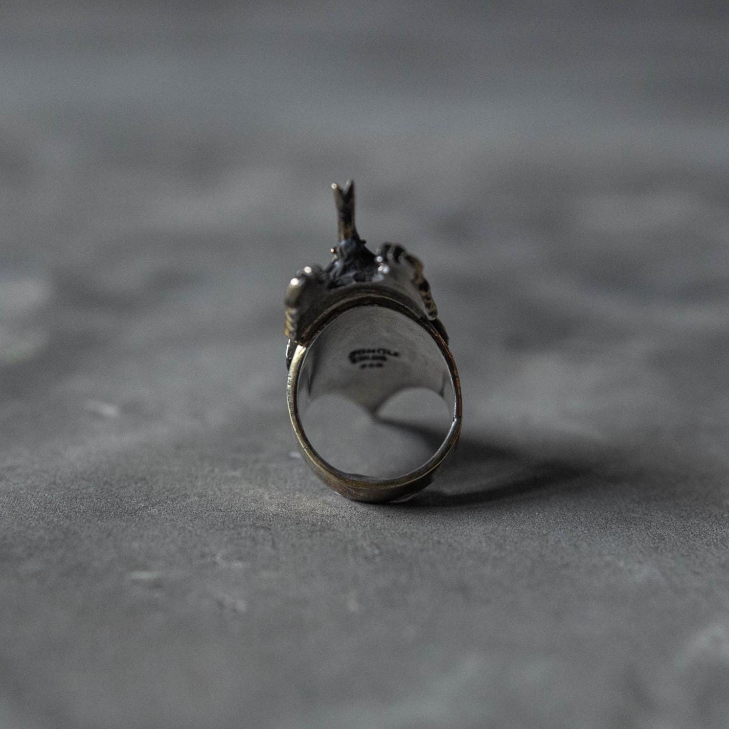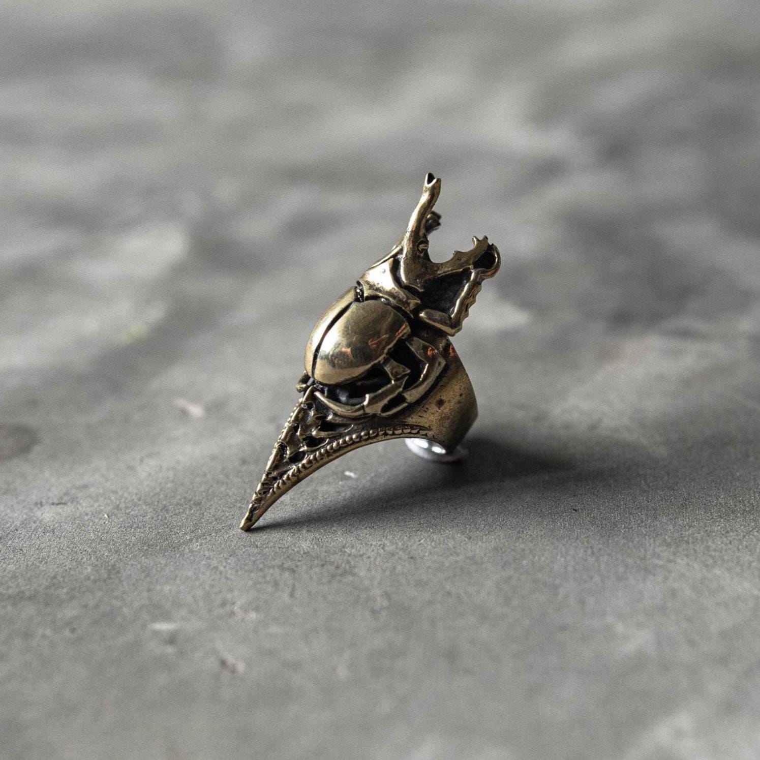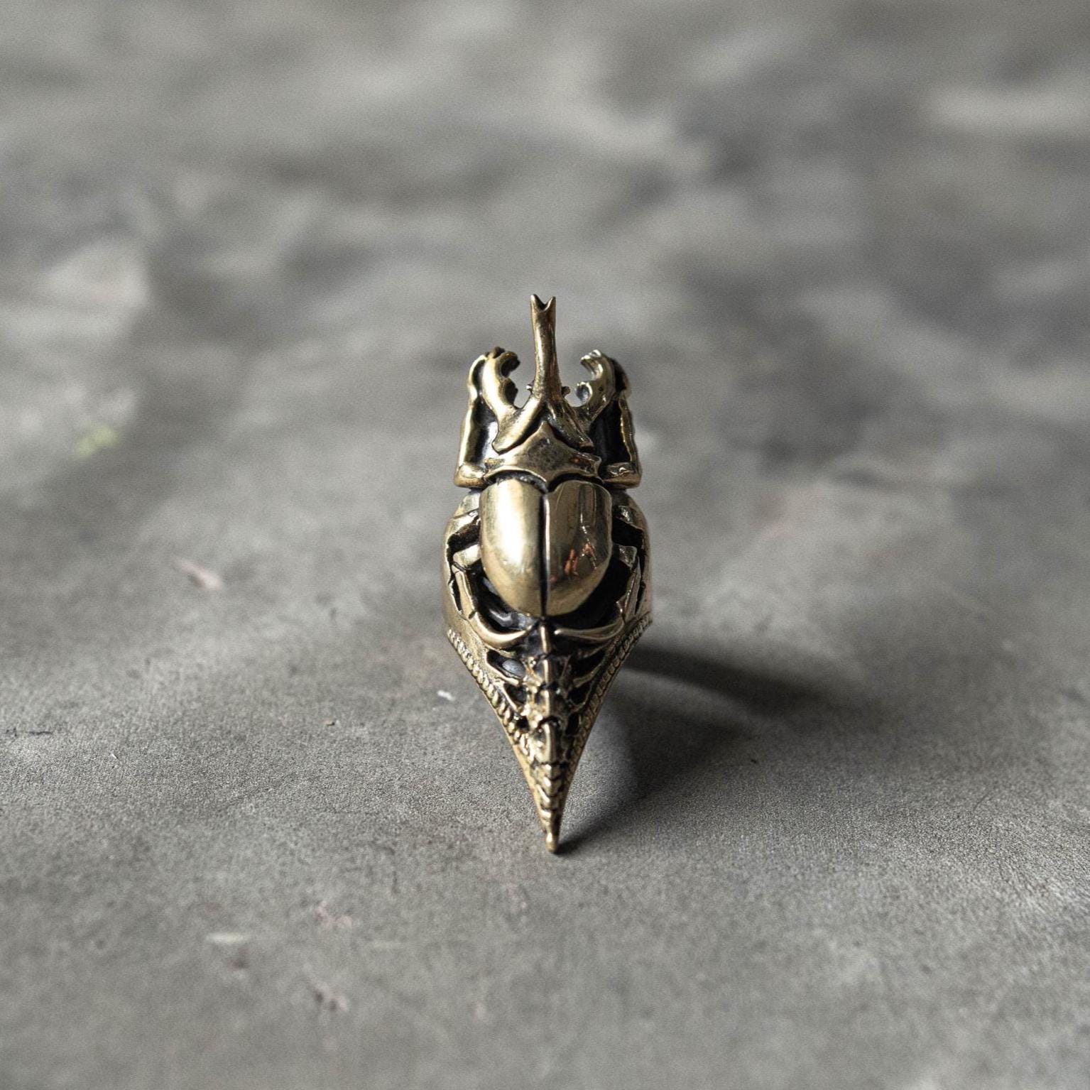 The Golden Scarab Spine Ring merges ancient mythology with modern craftsmanship — a powerful fusion of Egyptian symbolism, gothic design, and biomechanical artistry. Featuring a sculpted brass scarab beetle with dark oxidized detailing for depth and contrast, this ring is set on a sterling silver band under a spine and clawed tail. Its intricate form captures the meeting point of nature and machine — a wearable relic that feels both mystical and industrial.