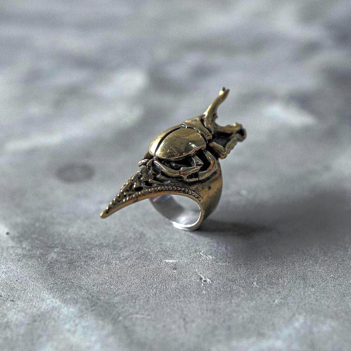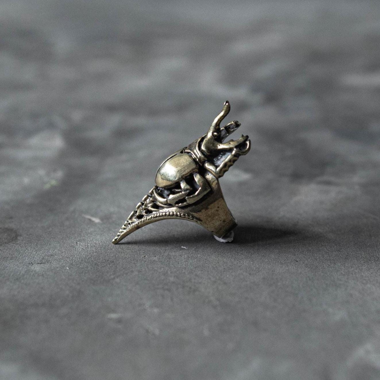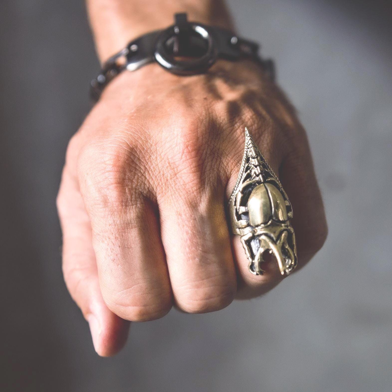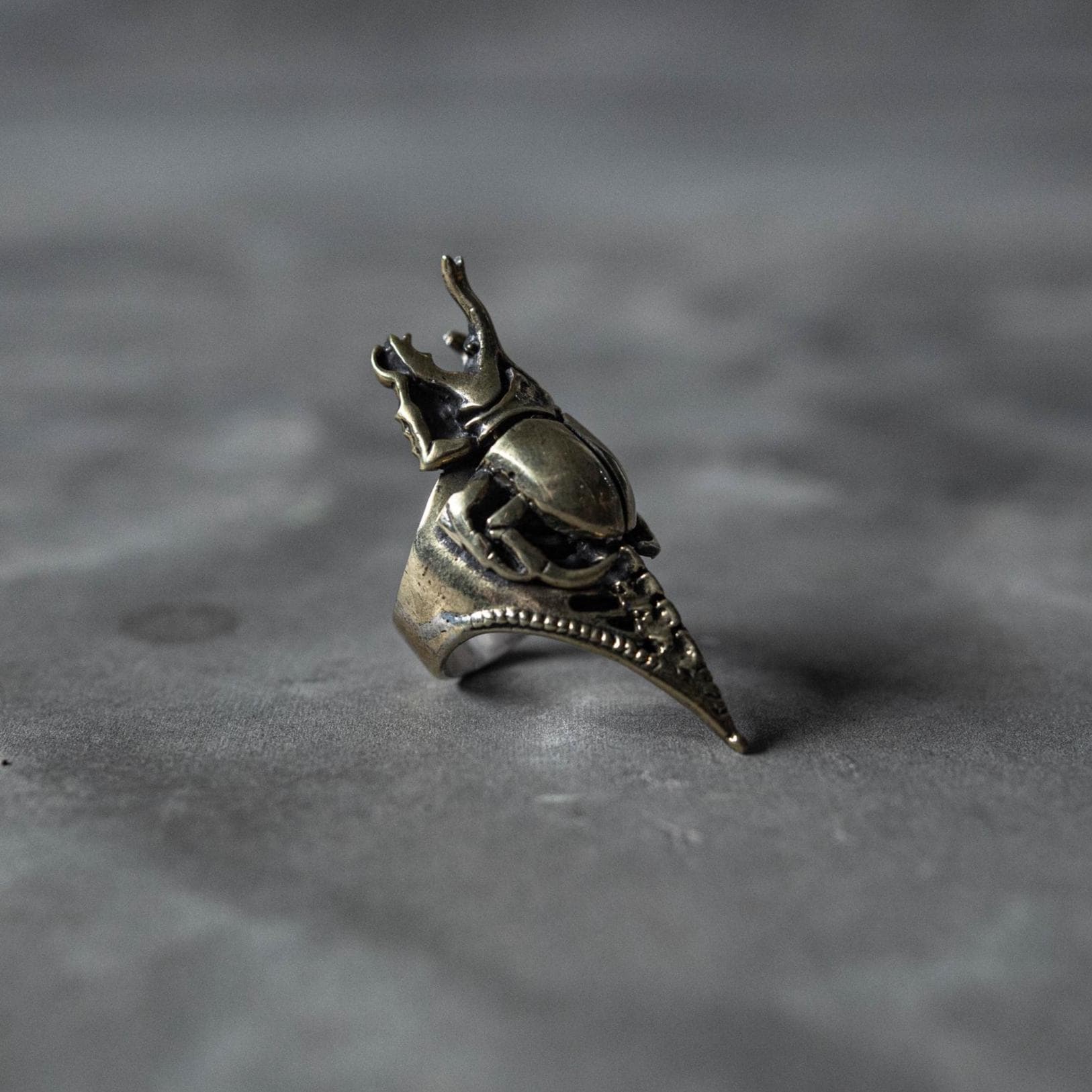 If you have a specific deadline, contact us before purchasing and we’ll do our best to meet it.A gothic claw band cast in brass and set with detailed Hercules beetle accents. This statement ring blends talon-inspired forms with dark, organic texture, creating a piece that feels both primal and sculptural. Designed with a strong silhouette and a raw, aged finish, it carries the spirit of armor and relics from a shadowed world.