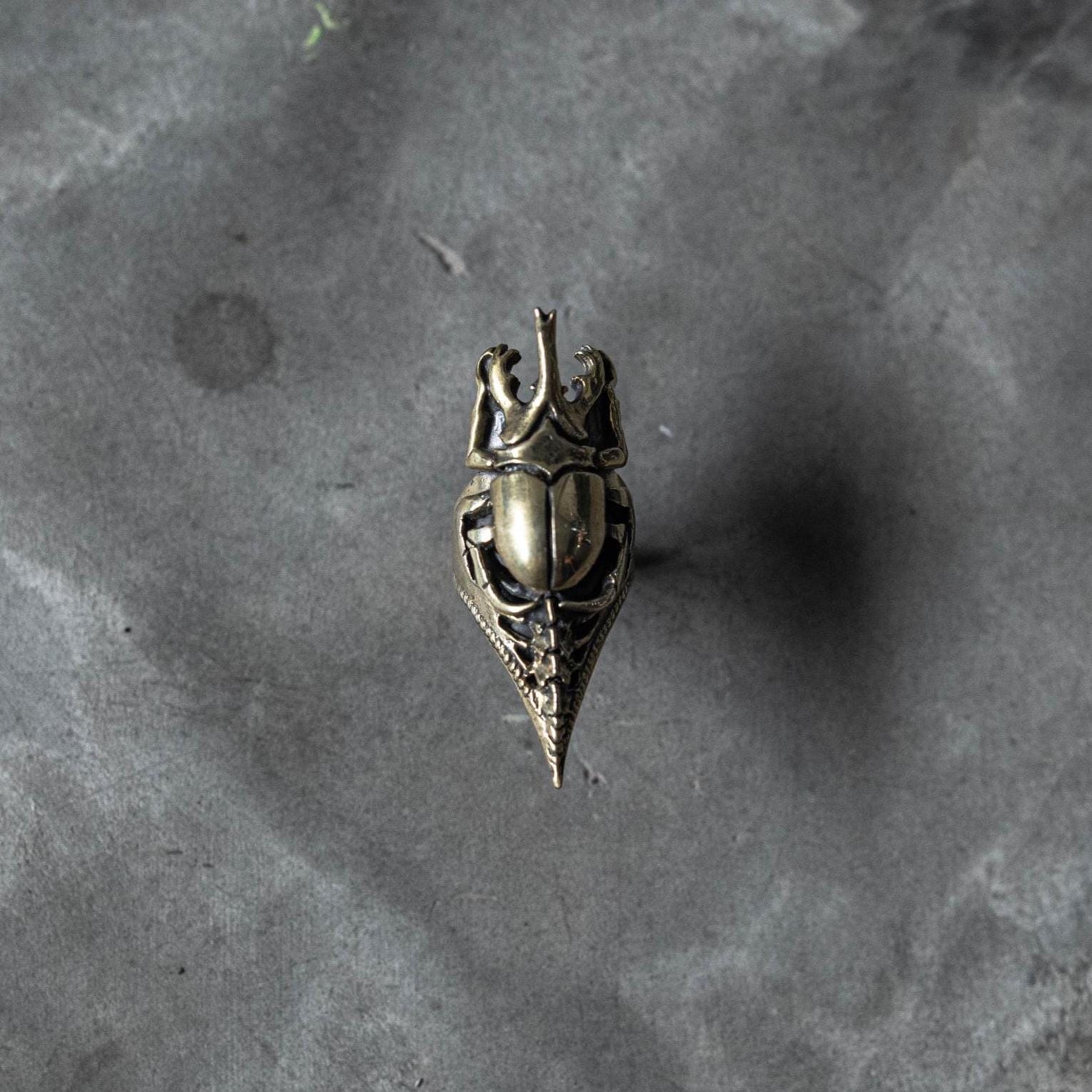 In ancient Egypt, the scarab symbolized rebirth, transformation, and protection — believed to guide the soul through cycles of renewal. The brass scarab’s warm metallic tone echoes that legacy, while the spine-like structure reimagines it through a modern, futuristic lens. The combination of brass and sterling silver creates a striking two-tone contrast — bold yet refined, classic yet avant-garde.