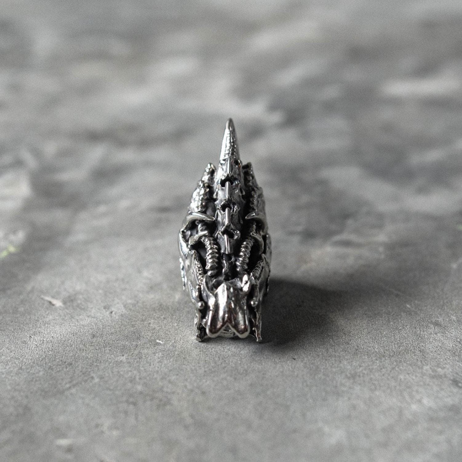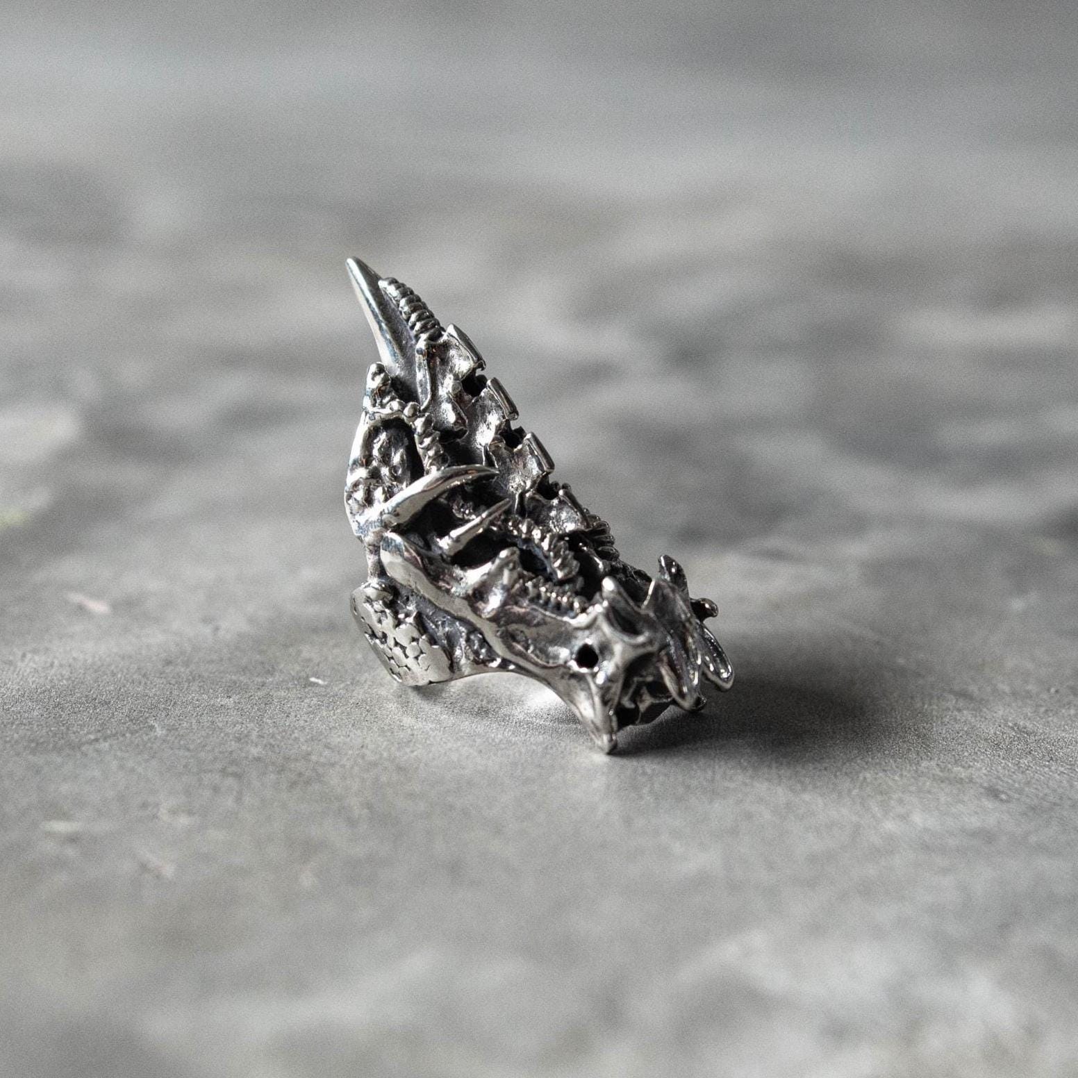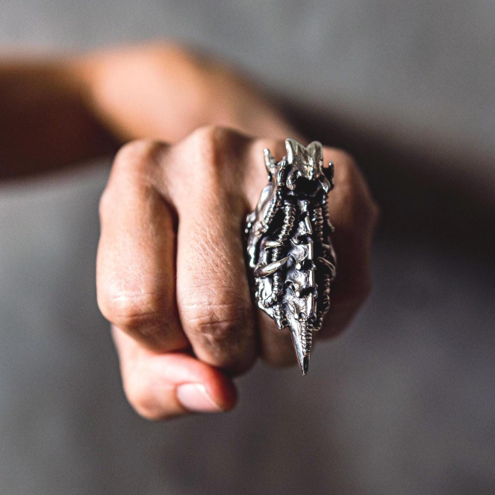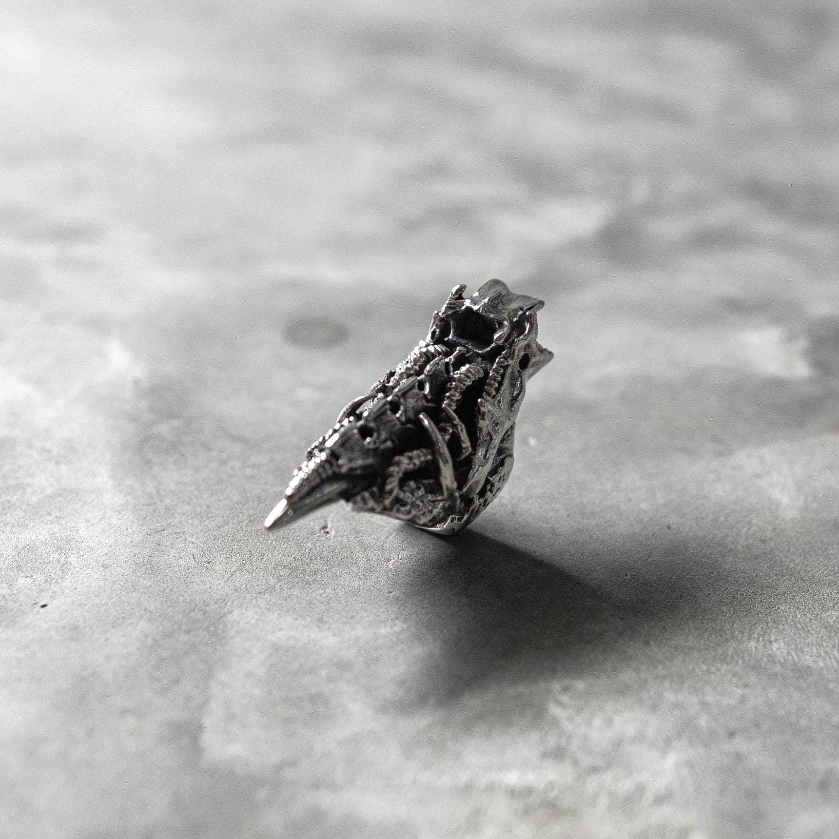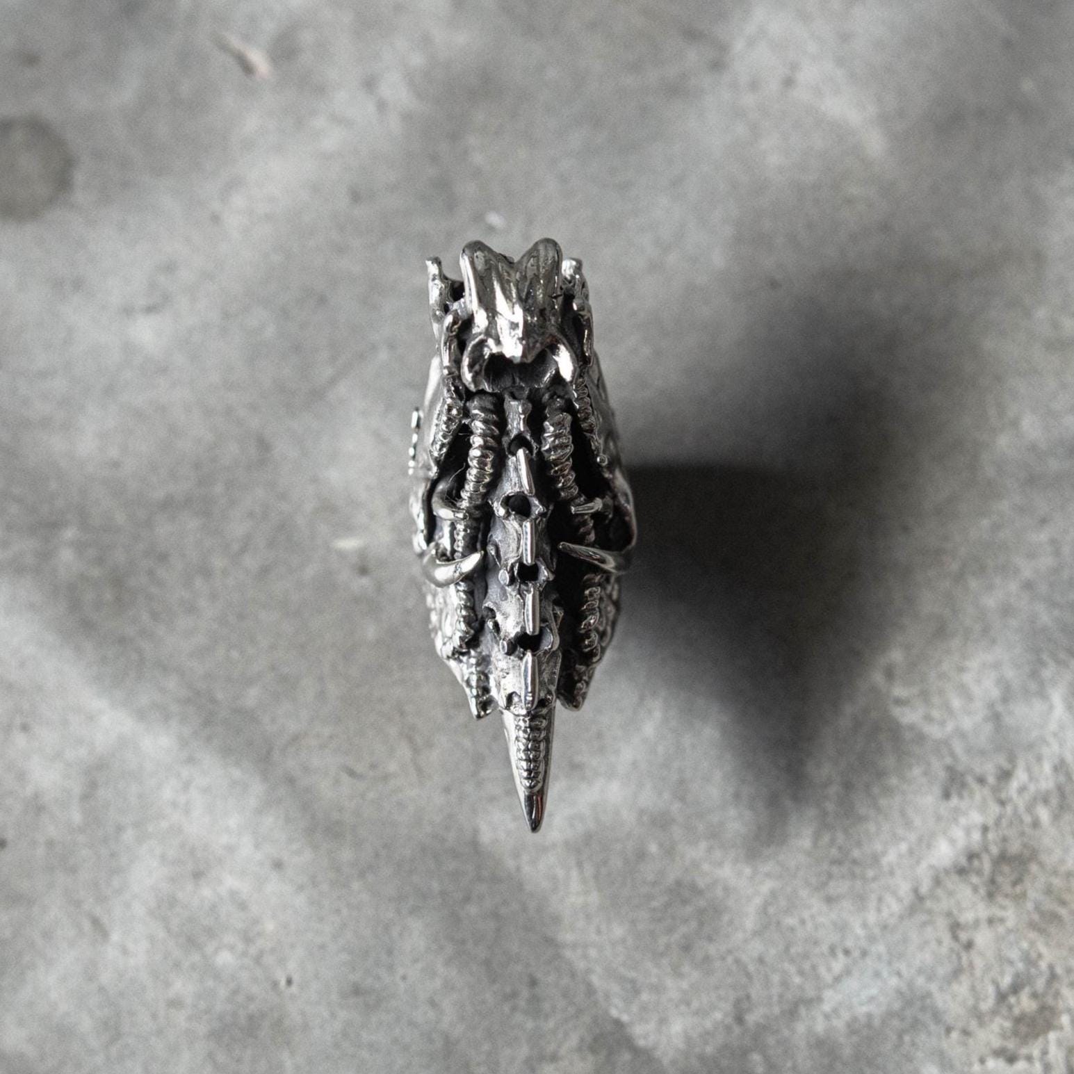 Balancing dark fantasy and science-fiction energy, this piece evokes transformation, evolution, and power — ideal for lovers of gothic, fantasy, and biomechanical jewelry who appreciate both intricate texture and bold form.