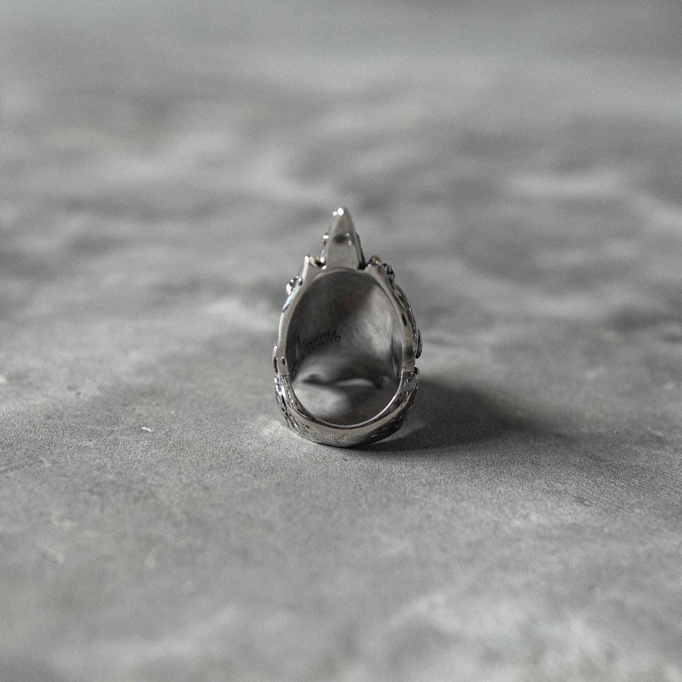 The Spinal Colony Ring merges organic form with industrial precision — a sculptural piece inspired by H.R. Giger’s biomechanical aesthetic. Crafted from German silver for deep black oxidized line detailing and lined with solid 925 sterling silver for comfort and longevity, this ring is both raw and refined. Its structure combines spines, jawbone forms, and claw-like ridges that seem to emerge from living metal, giving it the look of something forged between nature and machine.