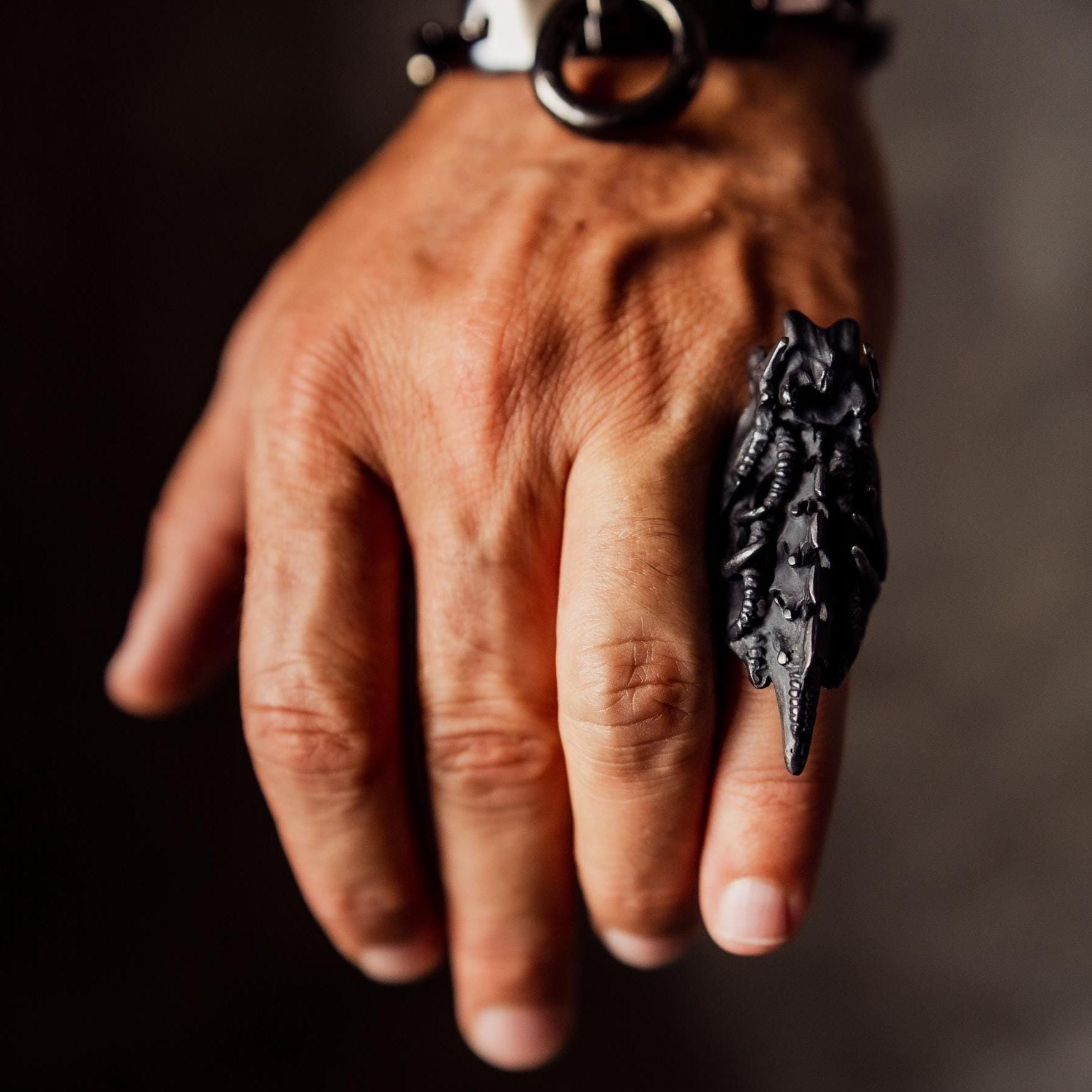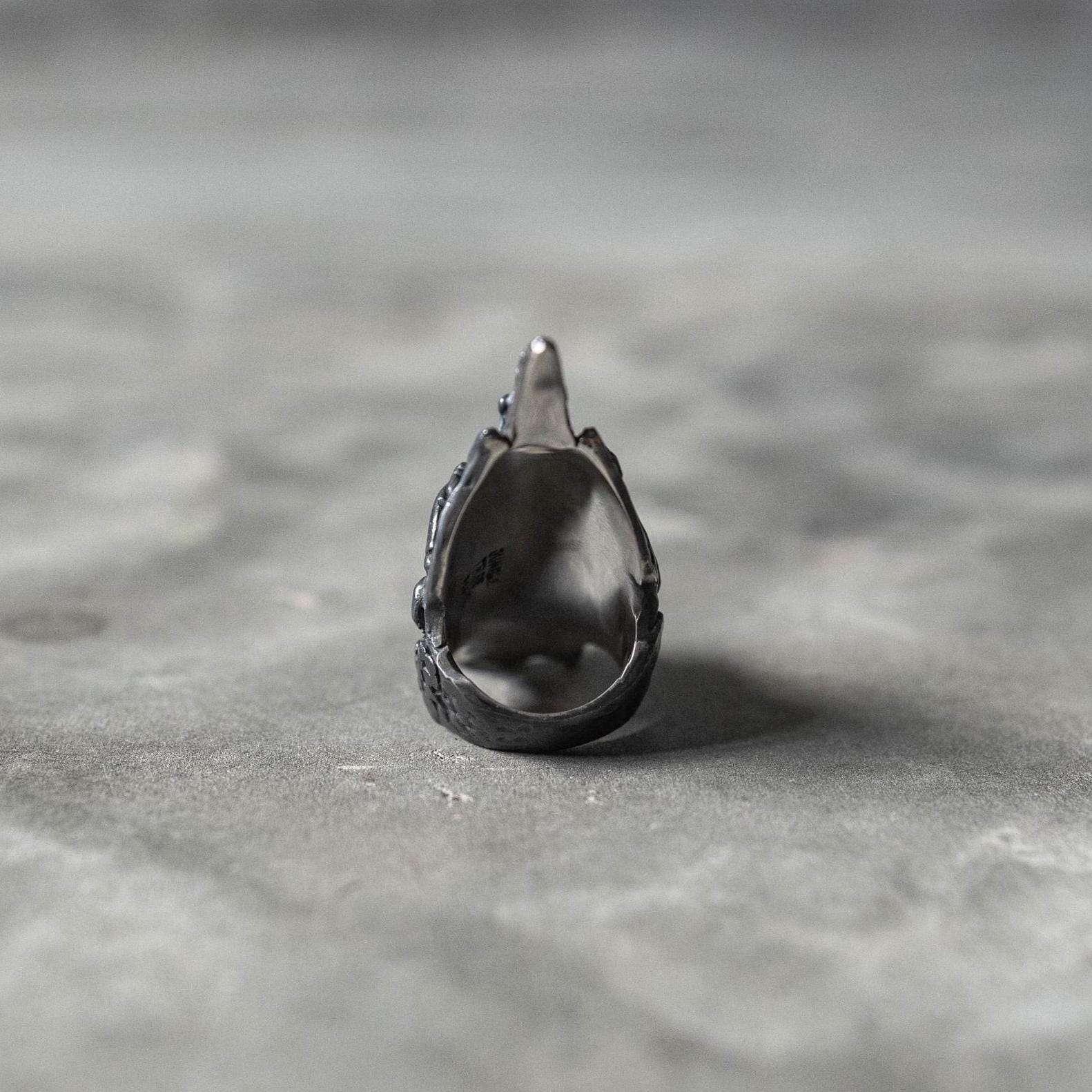 The Spinal Colony Ring merges organic form with industrial precision — a sculptural piece inspired by H.R. Giger’s biomechanical aesthetic. Crafted from German silver for deep black oxidized line detailing and lined with solid 925 sterling silver for comfort and longevity, this ring is both raw and refined. Its structure combines spines, jawbone forms, and claw-like ridges that seem to emerge from living metal, giving it the look of something forged between nature and machine.