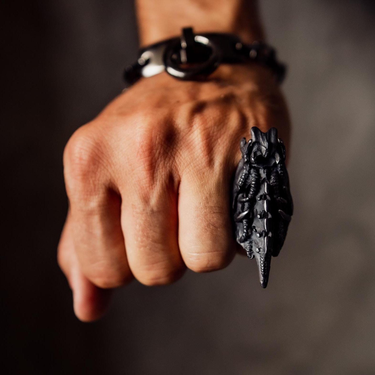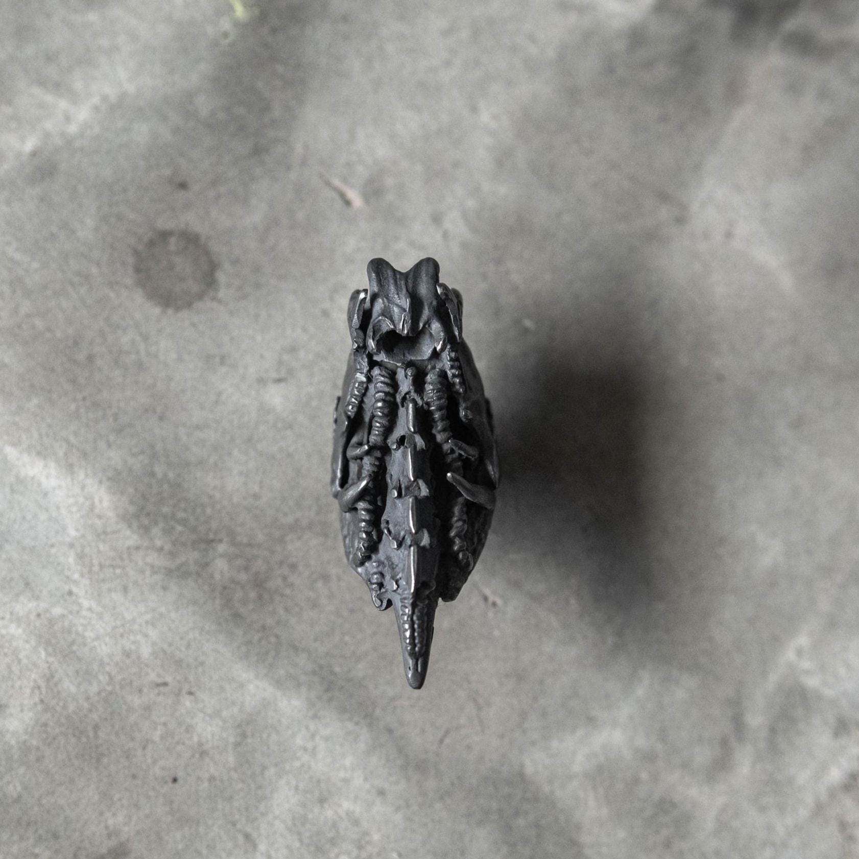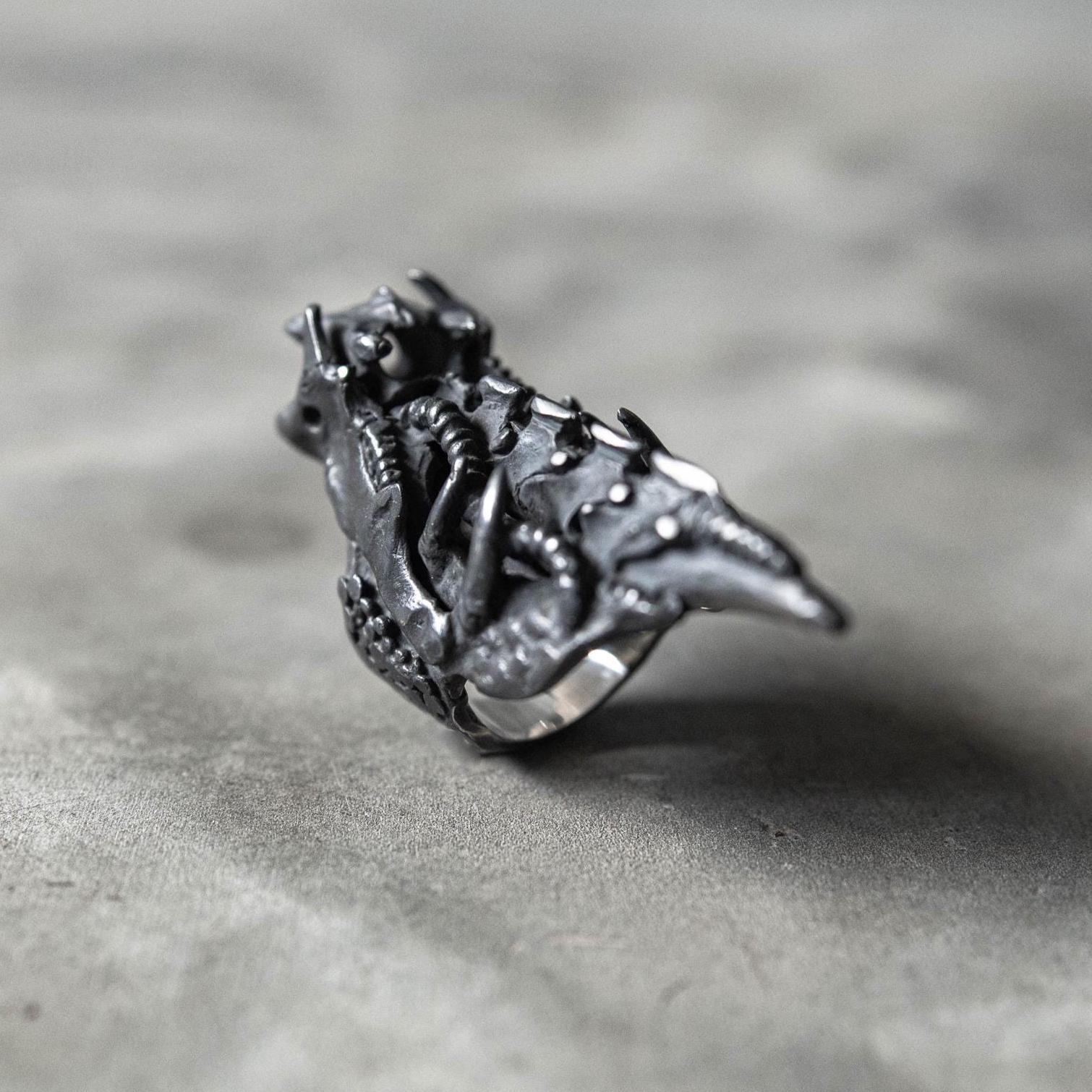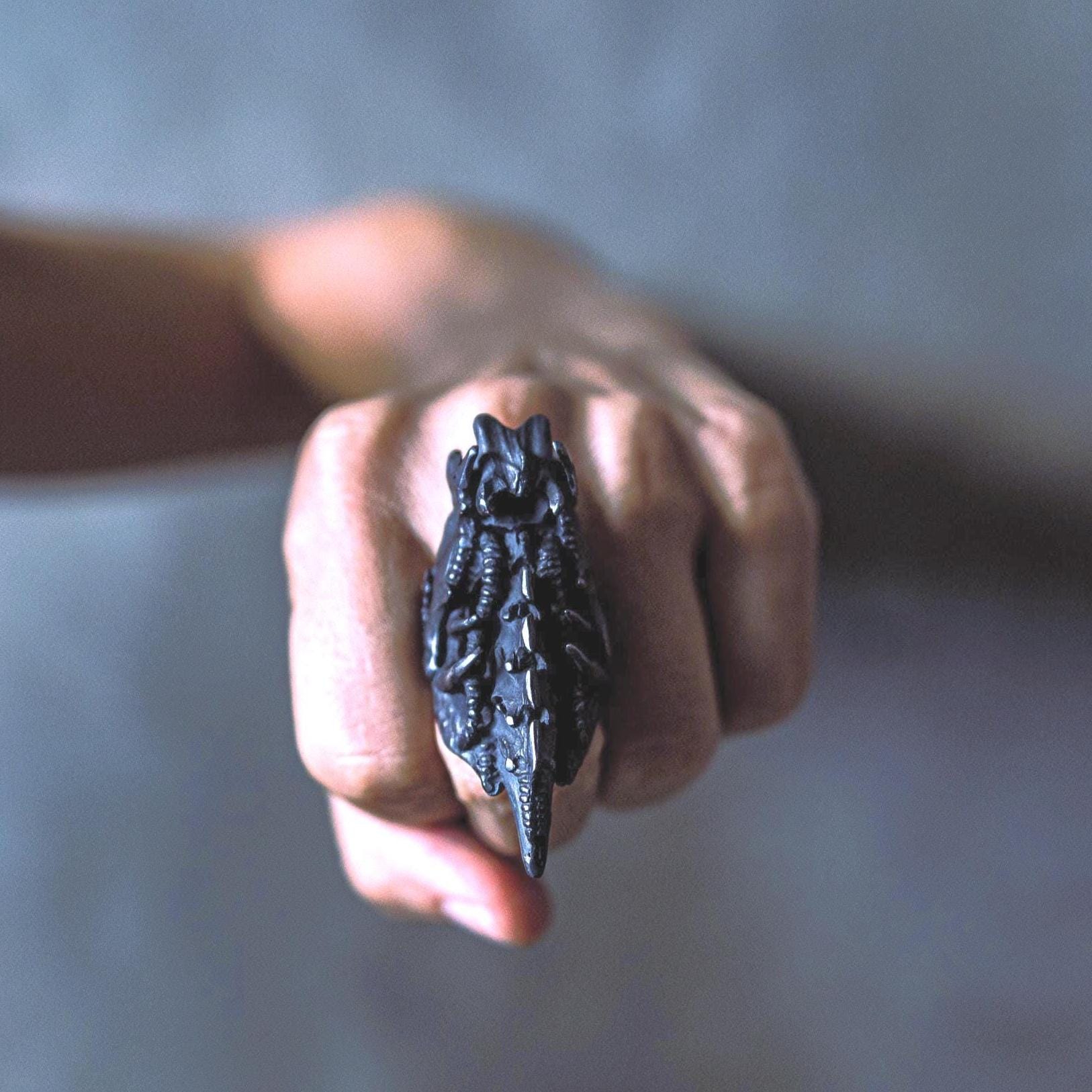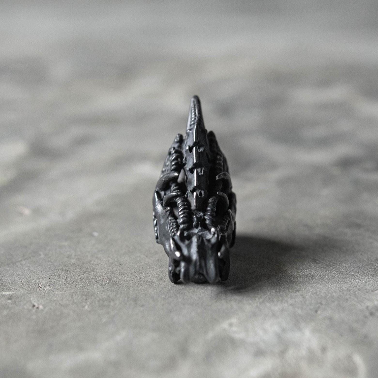 Balancing dark fantasy and science-fiction energy, this piece evokes transformation, evolution, and power — ideal for lovers of gothic, fantasy, and biomechanical jewelry who appreciate both intricate details and bold form.