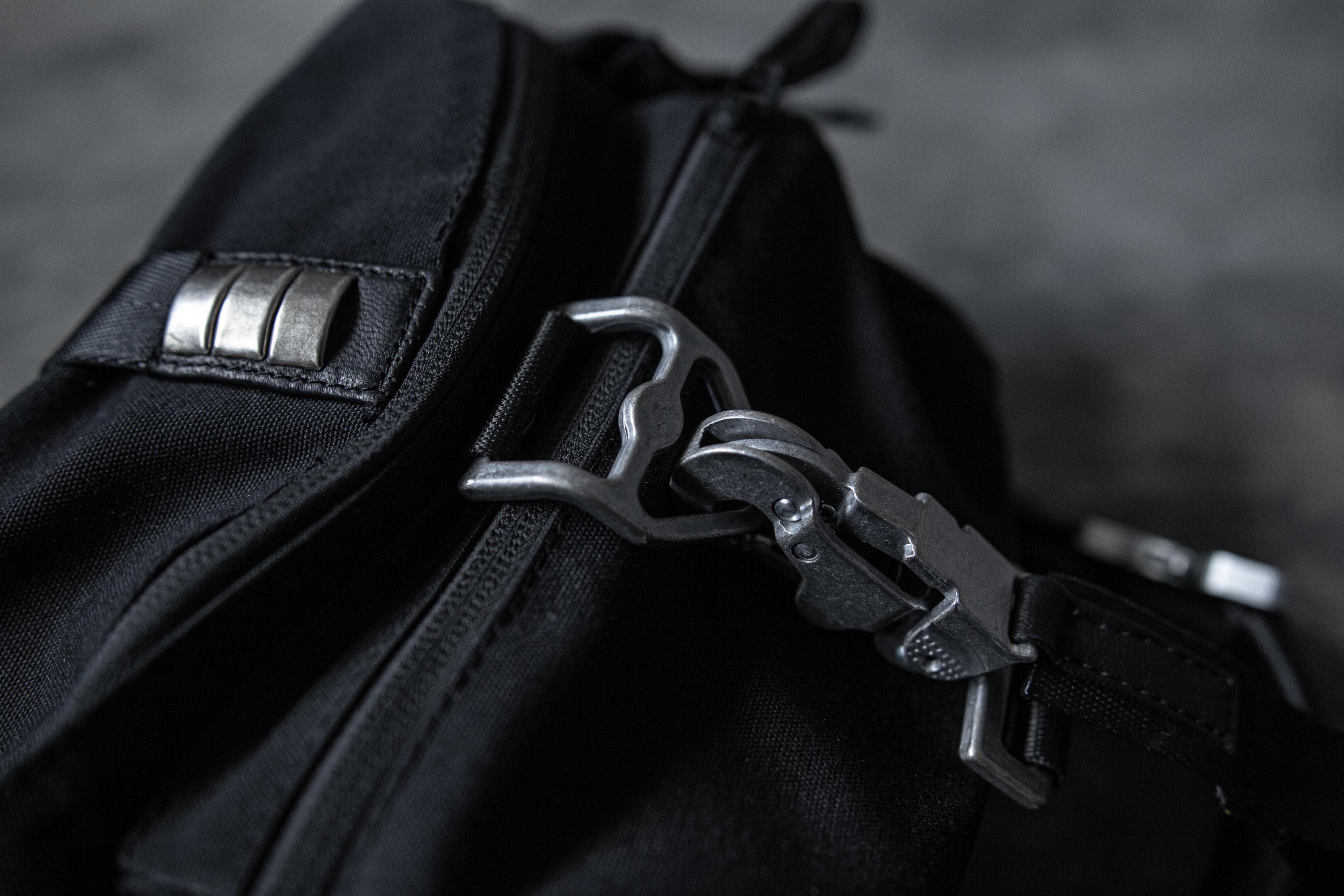 • Brushed Silver-toned lock clasp + hardware for industrial precision