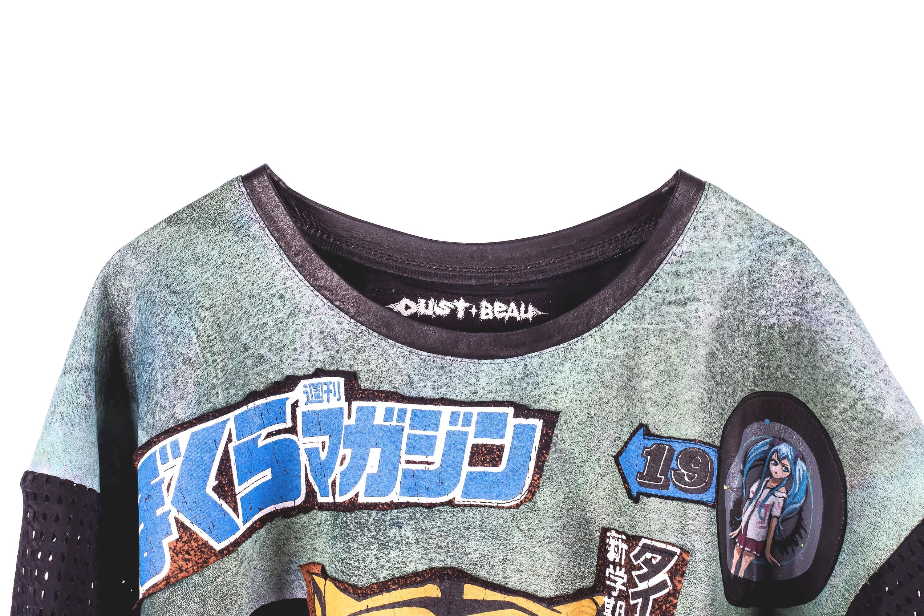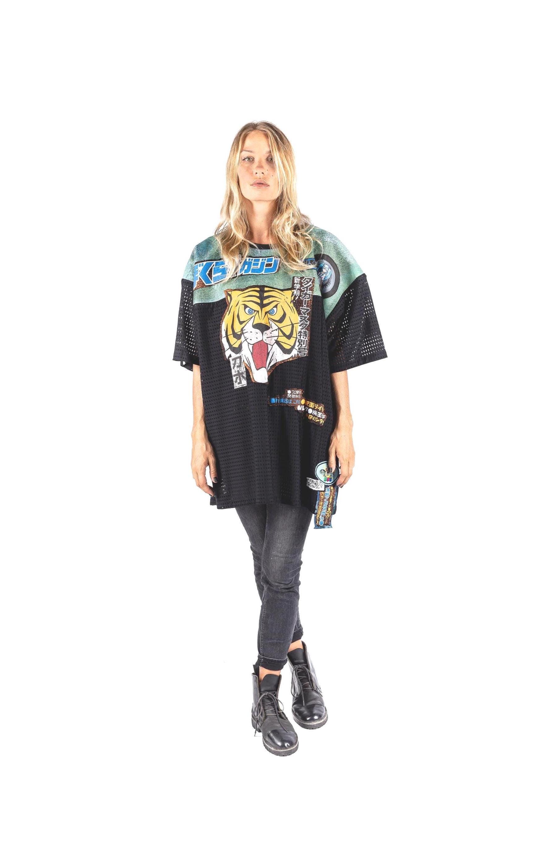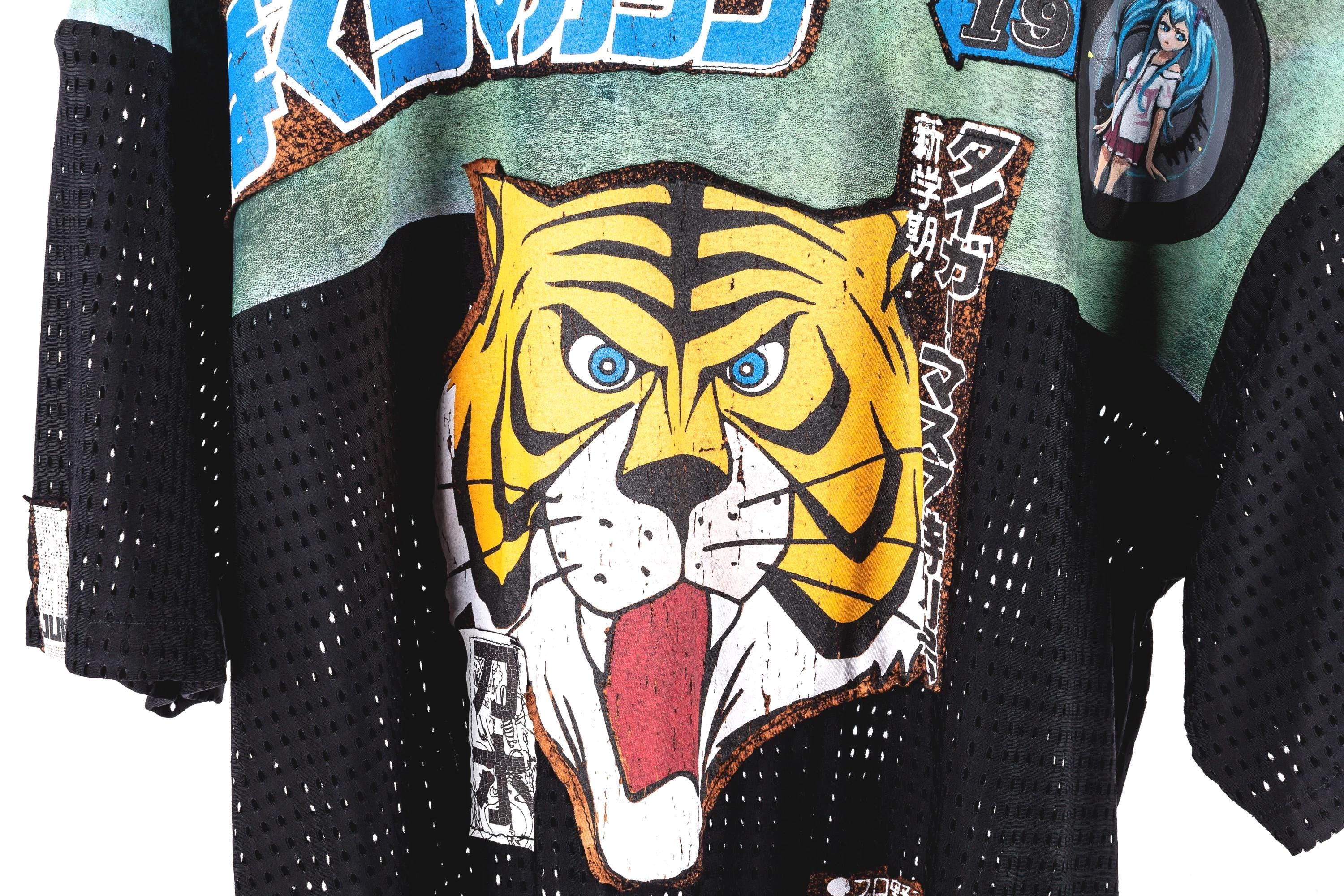 This handmade unisex oversized t-shirt by Dust & Beau is a one-of-a-kind fusion of anime energy, street sports aesthetics, and playful chaos. The upper yoke is crafted from a manipulated and processed leather panel in a sea-foam blue-green palette, contrasted with a black sports mesh body that sets the stage for a fierce Japanese tiger mascot front and center. Lightweight, breathable, and visually loaded, this piece blends athletic comfort with alt-fashion art.