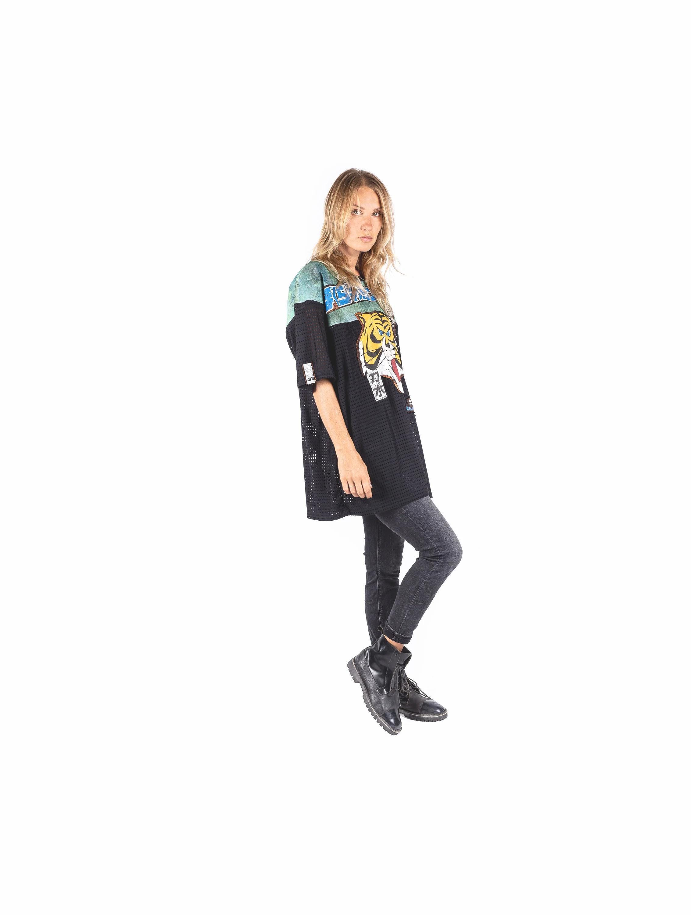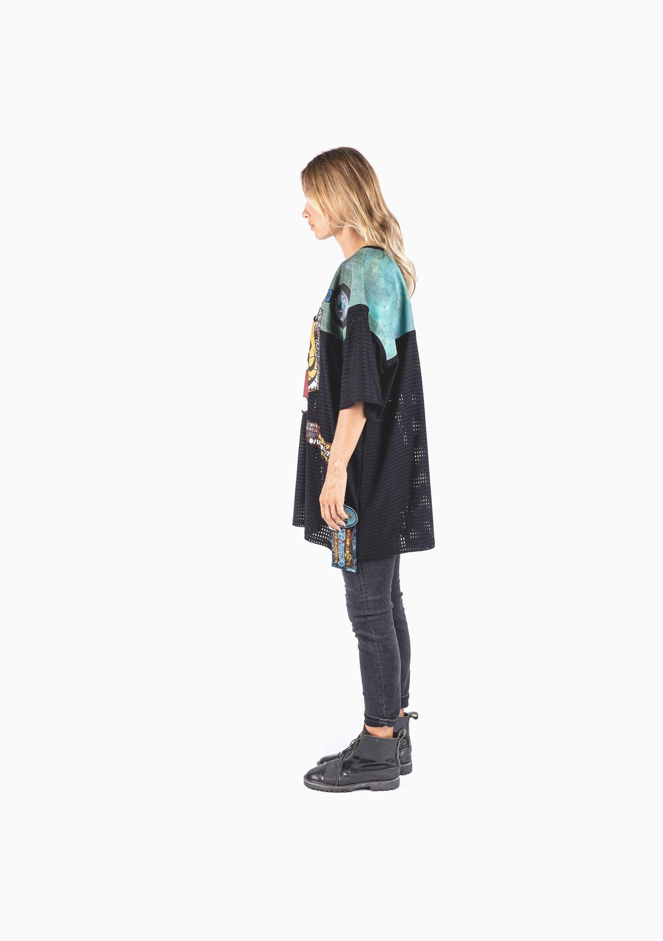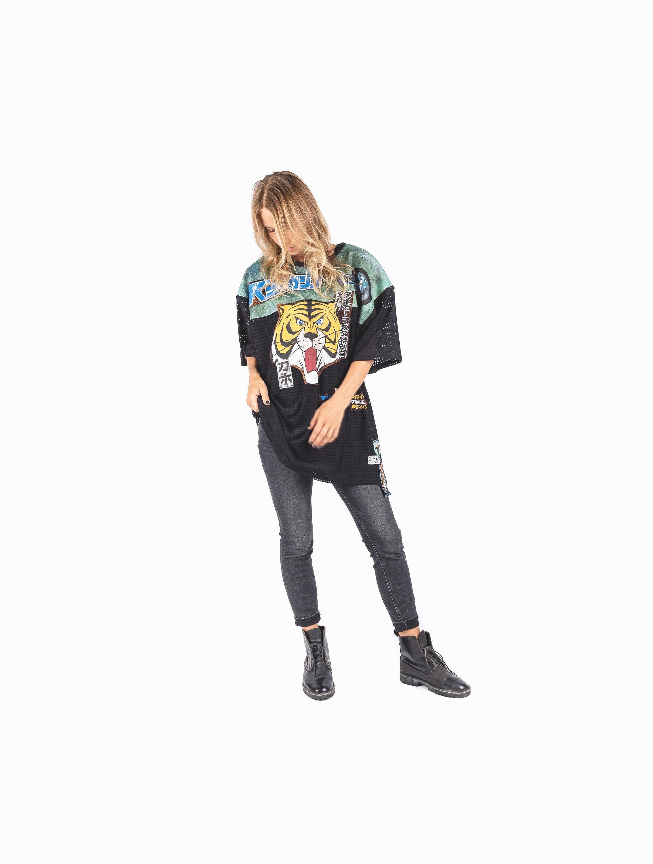 This handmade unisex oversized t-shirt by Dust & Beau is a one-of-a-kind fusion of anime energy, street sports aesthetics, and playful chaos. The upper yoke is crafted from a manipulated and processed leather panel in a sea-foam blue-green palette, contrasted with a black sports mesh body that sets the stage for a fierce Japanese tiger mascot front and center. Lightweight, breathable, and visually loaded, this piece blends athletic comfort with alt-fashion art.