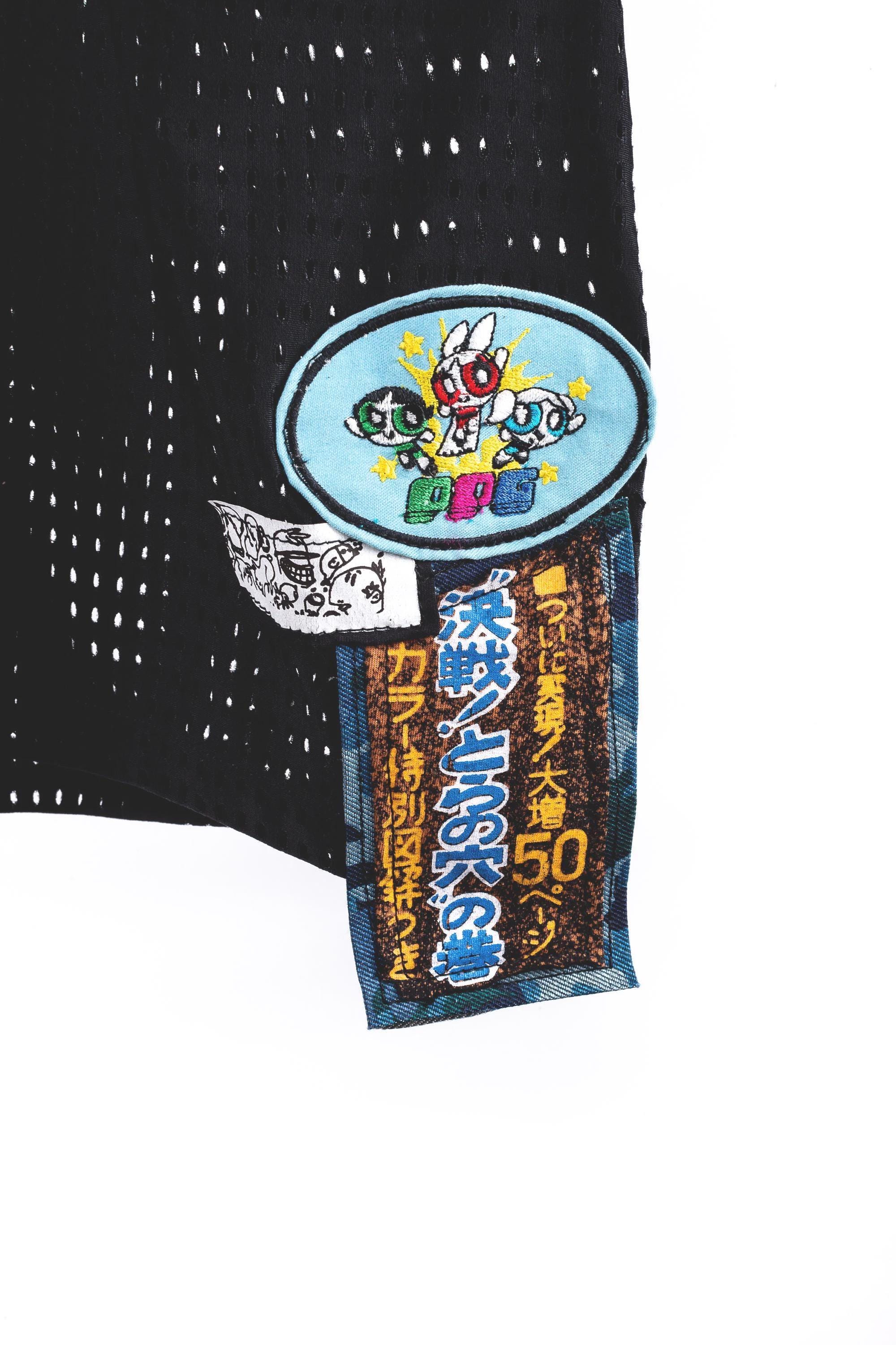 We began by processing and treating the leather yoke to create its oceanic blue-green tones, letting the textures shift and flow like waves. From there, we added a hand-painted anime character with electric blue hair, then scattered obscure Japanese kanji patches across the body to amplify the collage effect. And because we love the unexpected, we stitched on an embroidered Powerpuff Girls patch — a hit of cute absurdity layered onto an otherwise tough and masculine silhouette. As always, each element was assembled, painted, and stitched by hand, making this tee fully one of a kind.