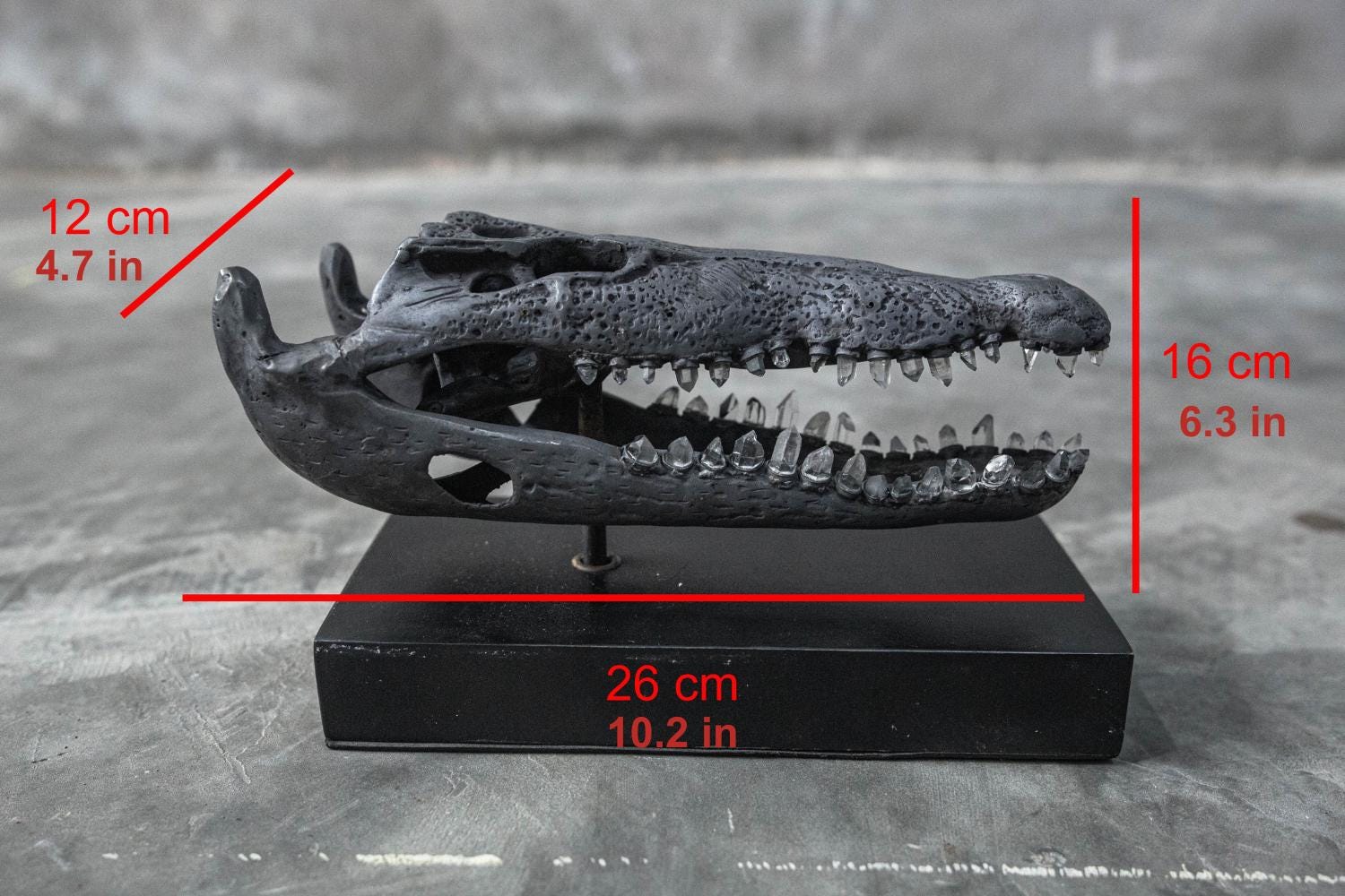 The crocodile skull is cast in solid bronze and finished with a dark, oxidized patina that enhances its intricate skeletal details. Quartz crystal teeth are embedded within the jaw, catching light and adding a subtle, ethereal shimmer. Quartz is often associated with clarity, protection, and energy amplification — and scientifically valued for its natural piezoelectric properties, the ability to generate an electric charge under pressure. Mounted on a minimalist black base, this piece evokes both primal strength and modern design sensibility.
