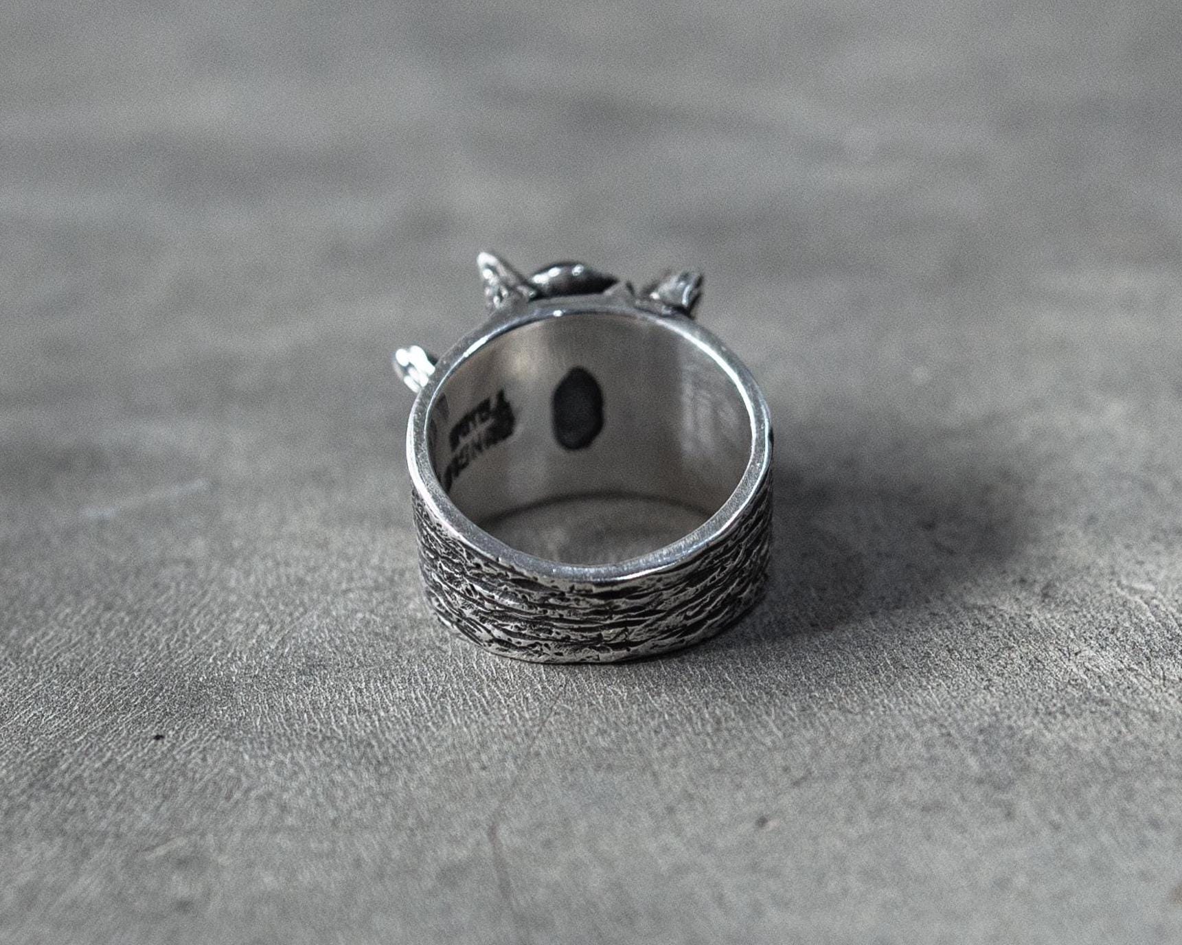 Handcrafted sterling silver ring with spiked crown bezel and wide textured band