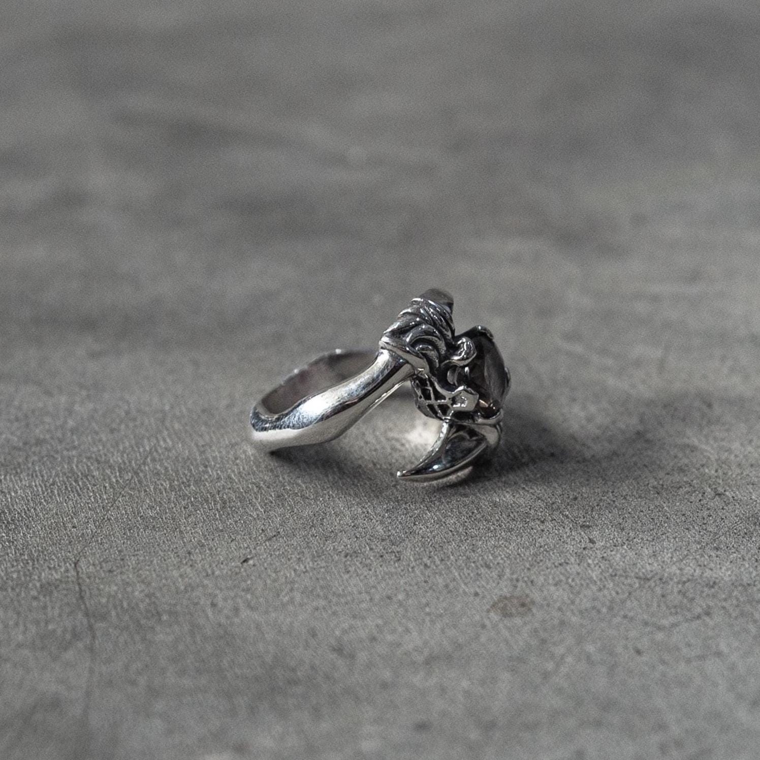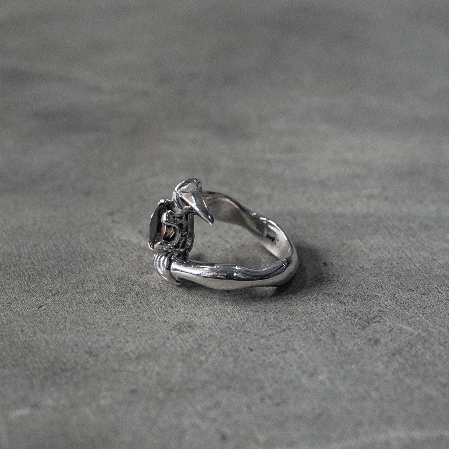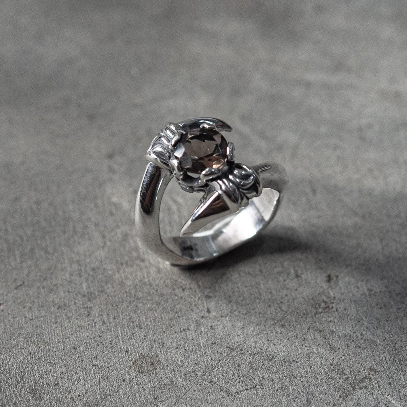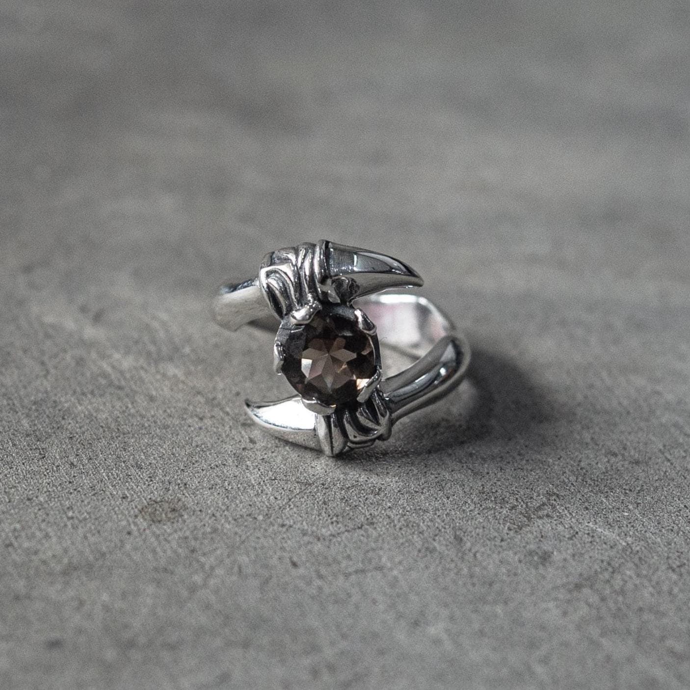 The Smoky Quartz Claw Ring is a bold statement piece handcrafted from solid 925 sterling silver and set with a faceted smoky quartz gemstone. Its claw-style prong setting gives the stone a fierce, sculptural silhouette, while the polished silver band adds contrast and balance — a refined piece that captures both strength and sophistication.