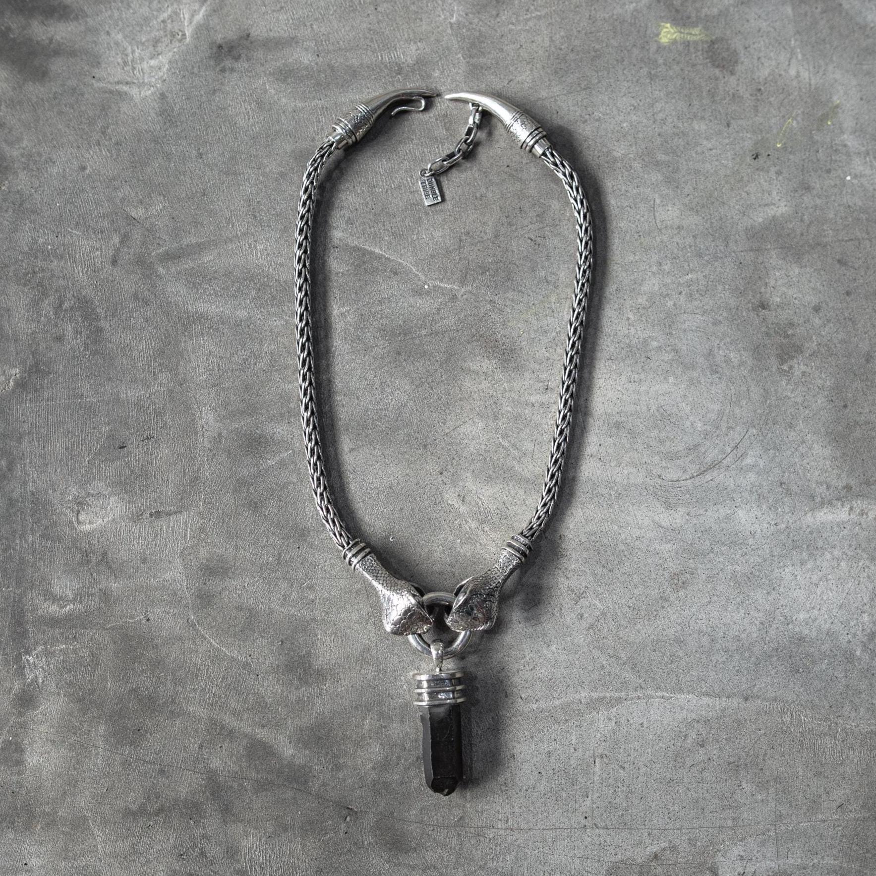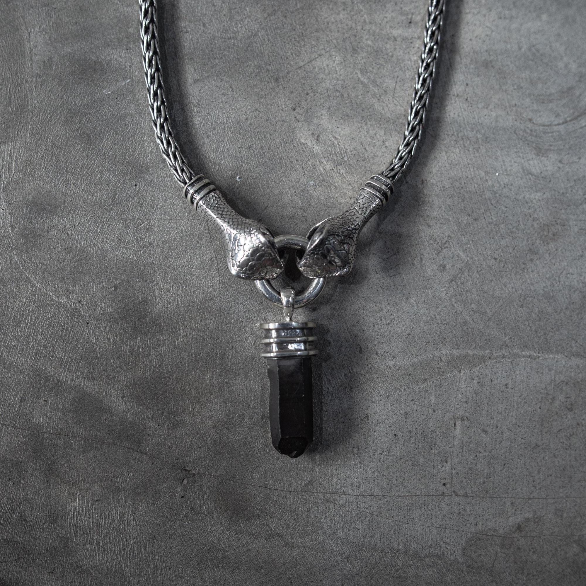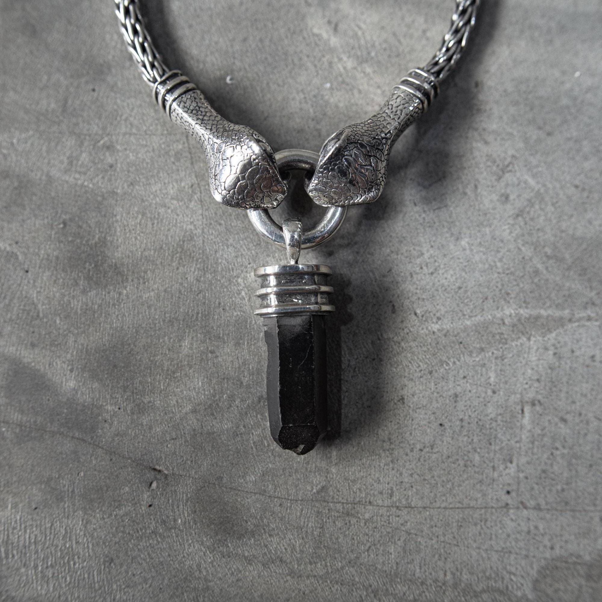 This handcrafted Silver Snake Necklace brings together two serpent heads gripping a solid ring — a symbol of duality, protection, and the quiet power that comes from holding your own center. It channels dark elegance and primal strength. Featuring a black quartz crystal gripped by sculpted claw-like ends, this pendant hangs from a heavy braided silver chain that gives it a bold, gothic edge. Its raw yet refined construction makes it the perfect statement piece for those who embrace alternative fashion, shadowy aesthetics, and strong symbolic design.