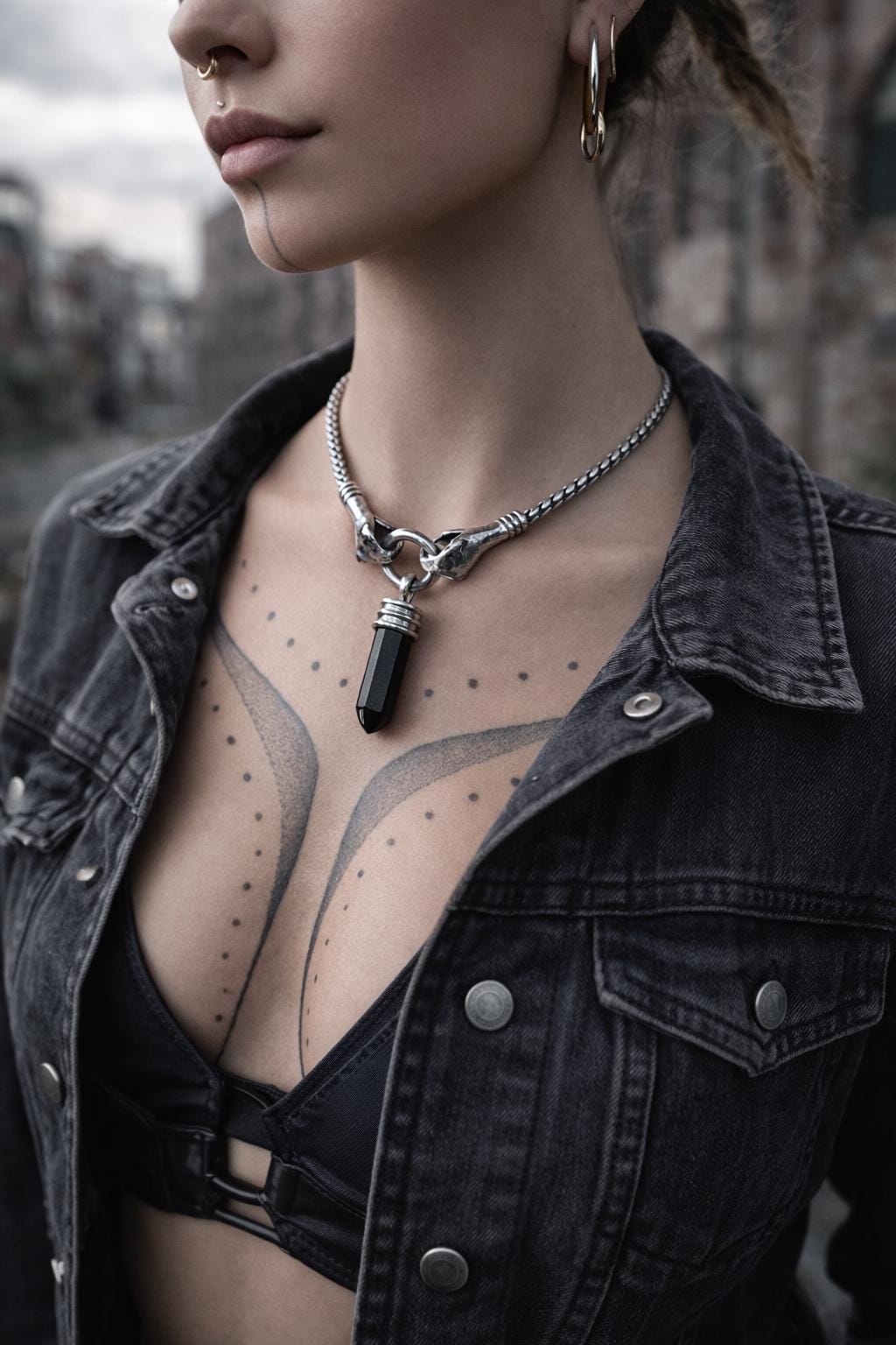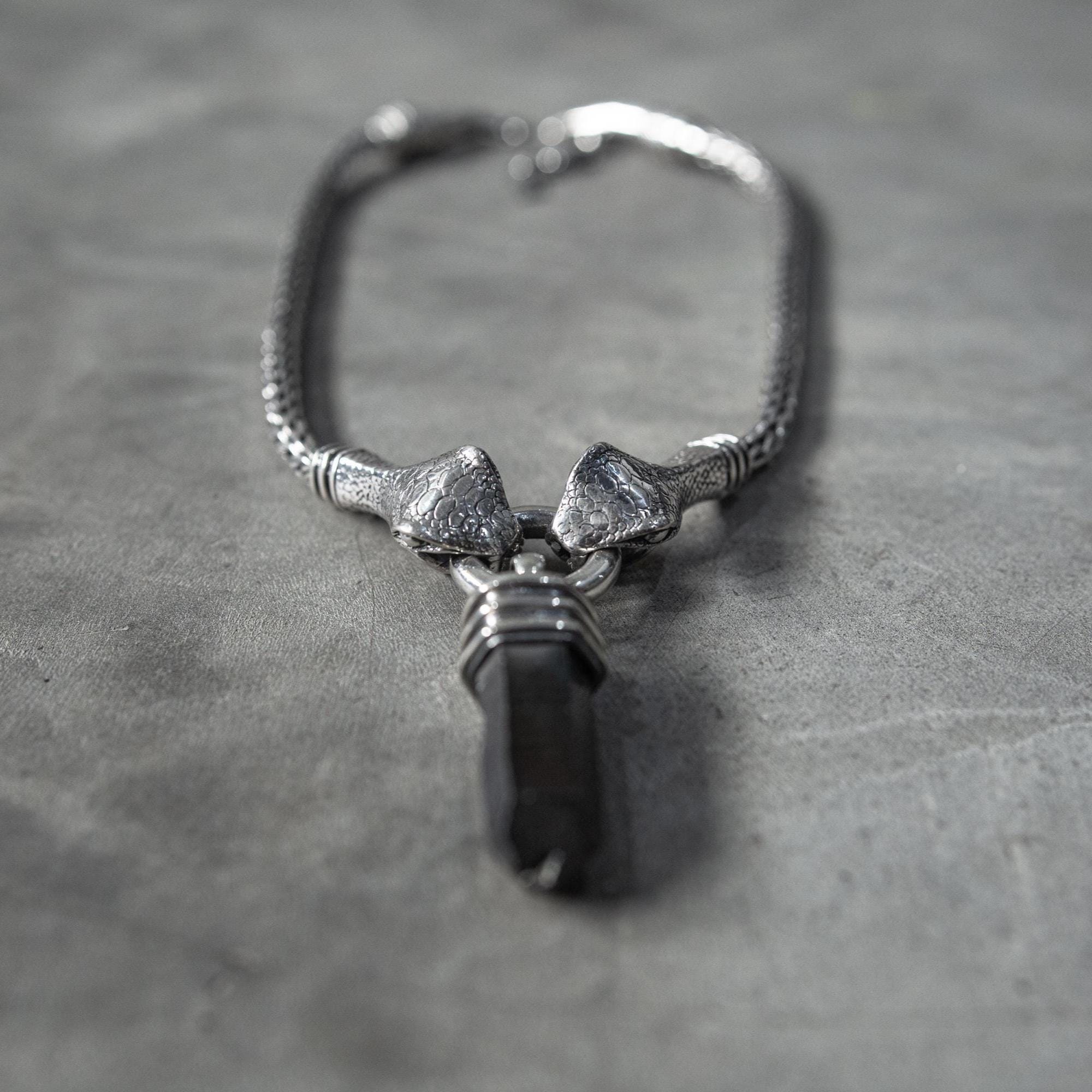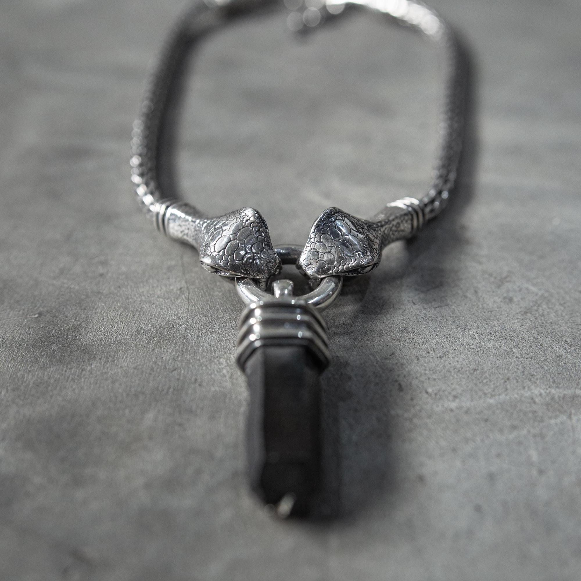 This handcrafted Silver Snake Necklace brings together two serpent heads gripping a solid ring — a symbol of duality, protection, and the quiet power that comes from holding your own center. It channels dark elegance and primal strength. Featuring a black quartz crystal gripped by sculpted claw-like ends, this pendant hangs from a heavy braided silver chain that gives it a bold, gothic edge. Its raw yet refined construction makes it the perfect statement piece for those who embrace alternative fashion, shadowy aesthetics, and strong symbolic design.