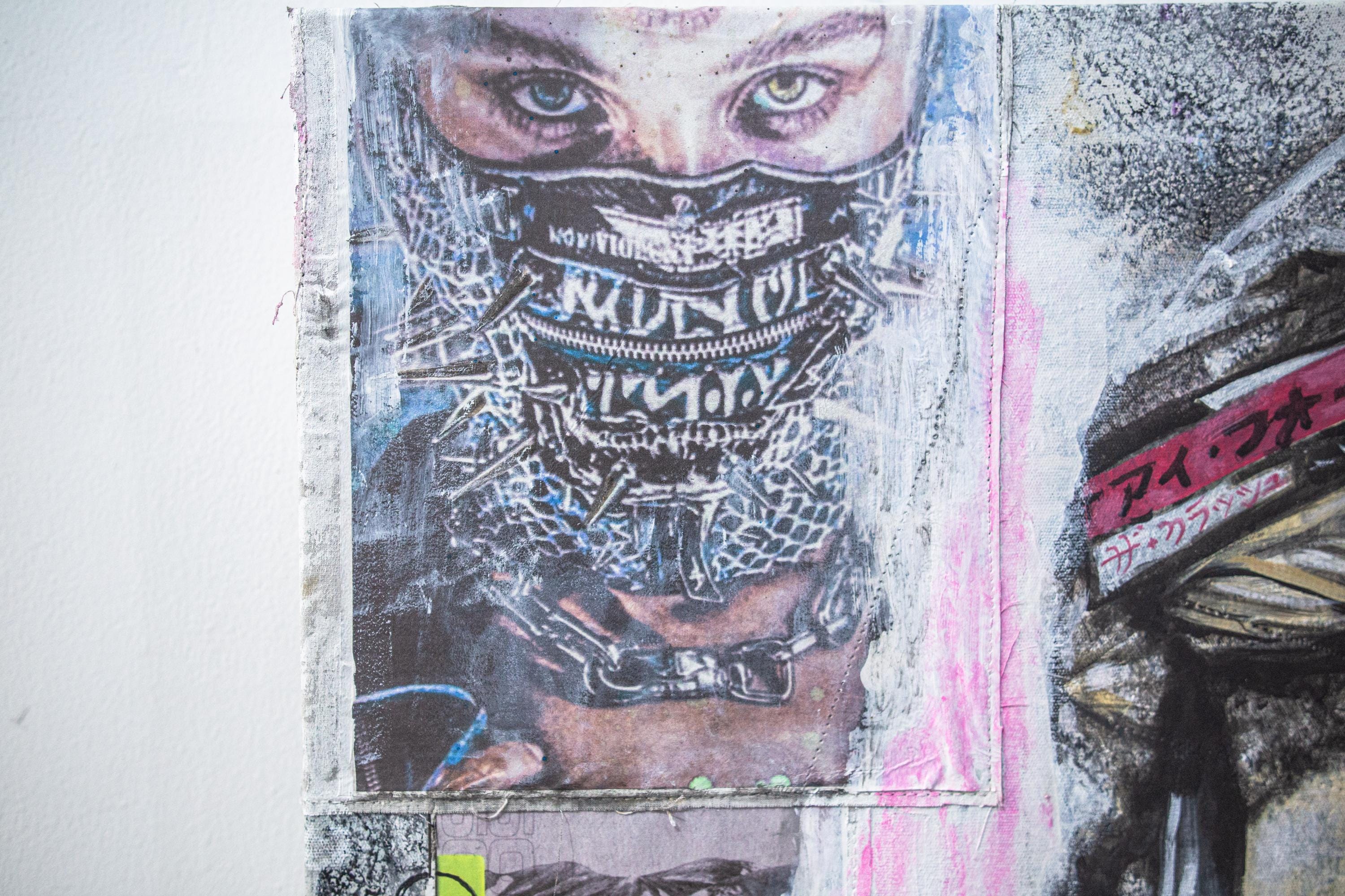 We created this piece using acrylic paint, mixed-media collage, spray paint overlays, hand-cut elements, and layered texture work to give it that worn-wall, street-level depth. The Japanese text, masked portrait, and gold-tear details were added in passes to bring the whole thing into a neo-punk, cyber-street mythology. High-resolution scans are captured for archival-quality giclée prints.