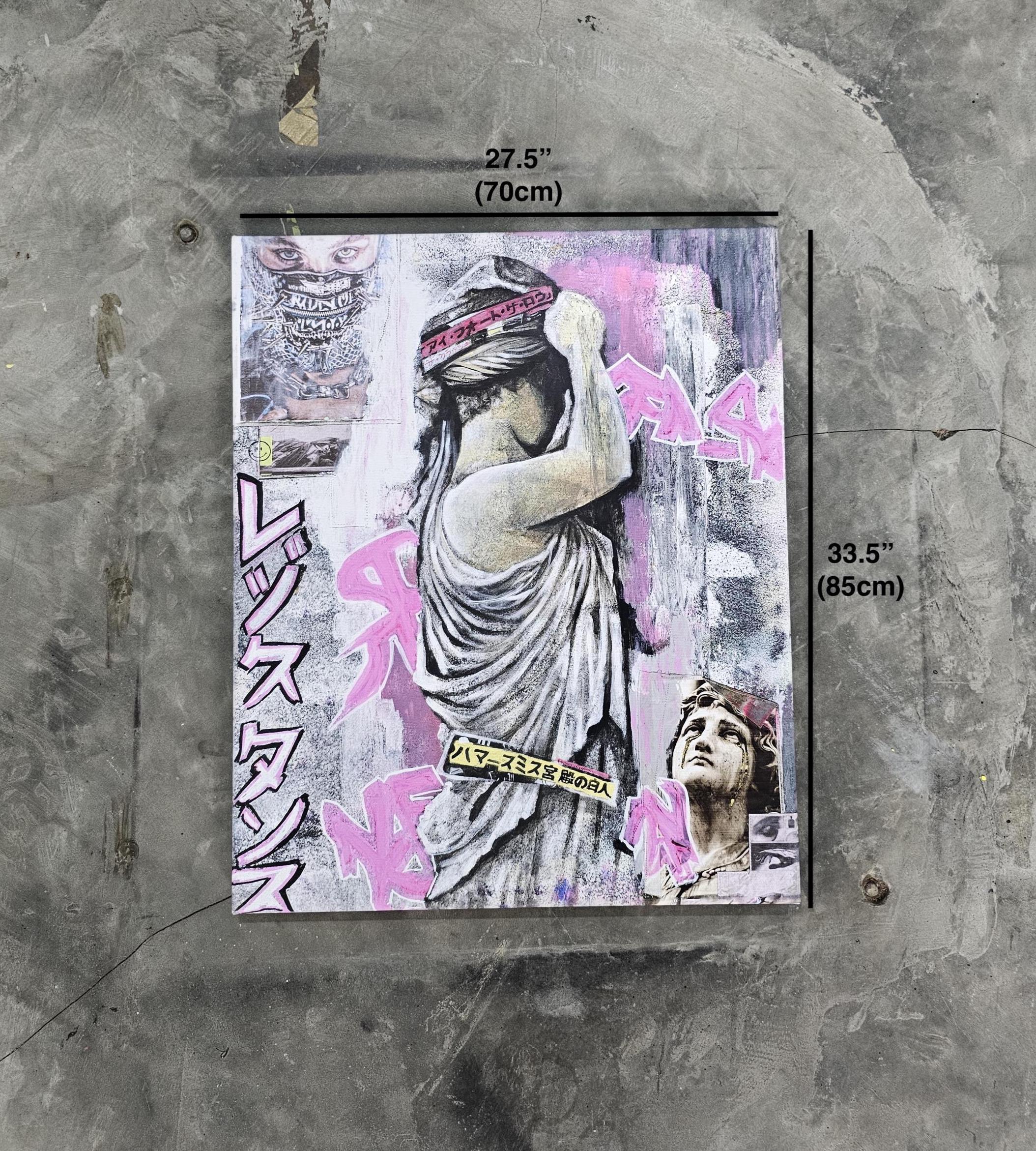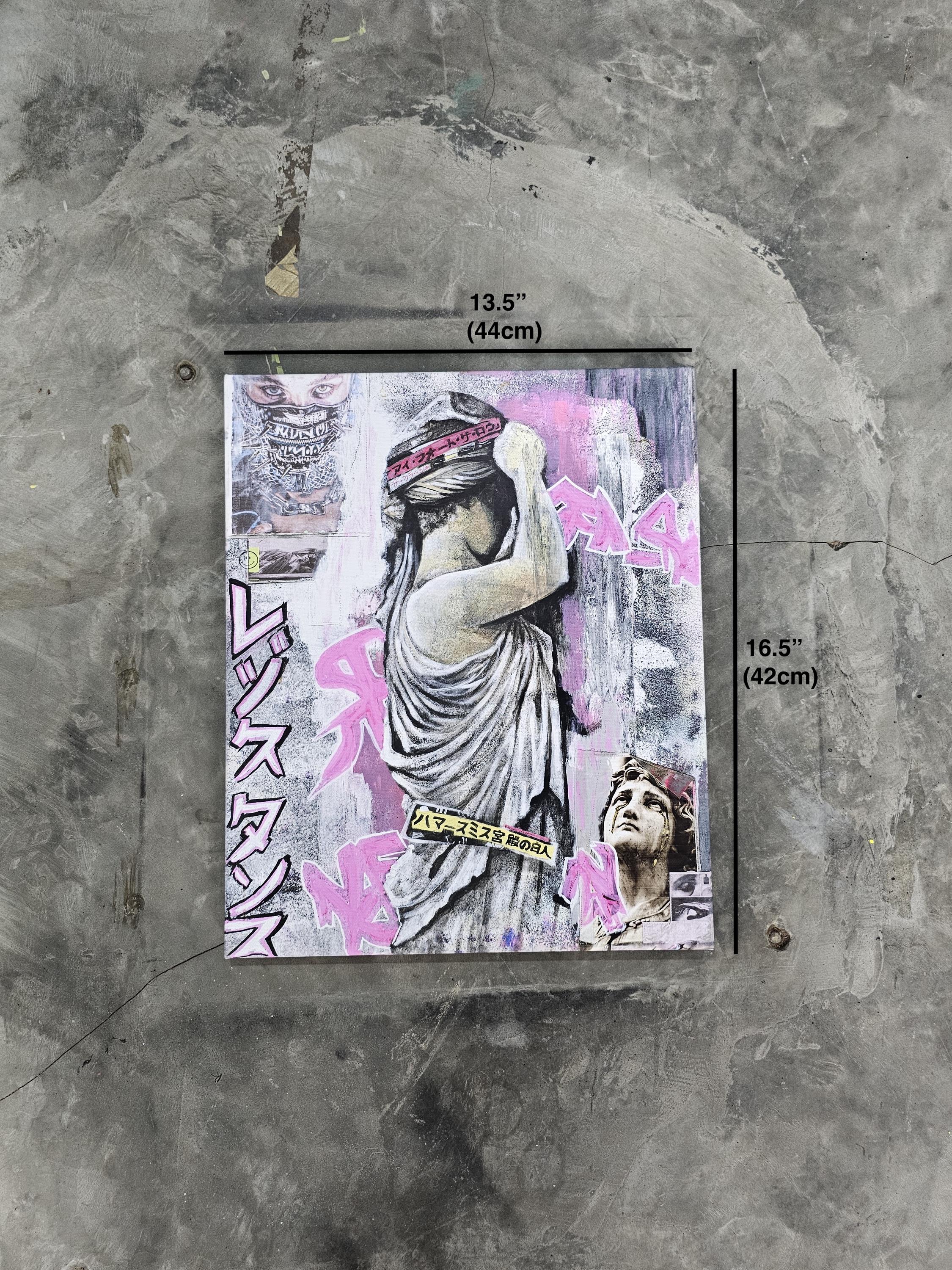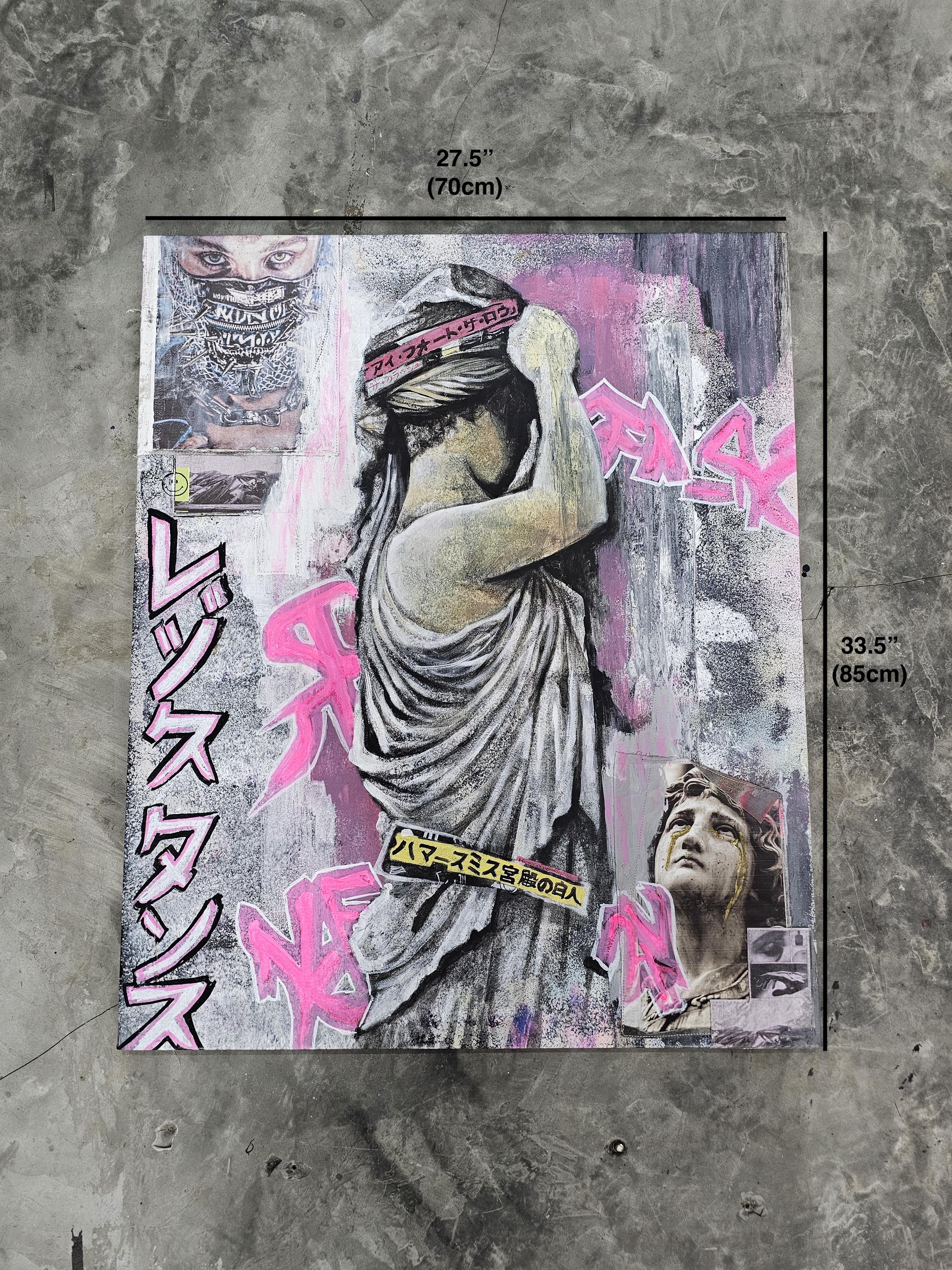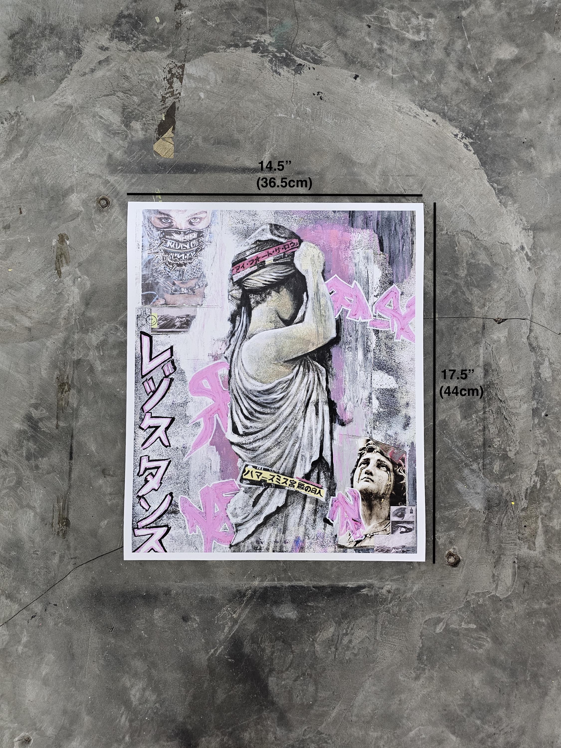 Imperial Resistance is a Dust & Beau original, built from a collision of worlds we love — ancient sculpture, cyberpunk energy, and raw street protest grit. We took a classical Greek figure and dropped her straight into an urban riot of neon pink tags, distressed textures, and Japanese typography.