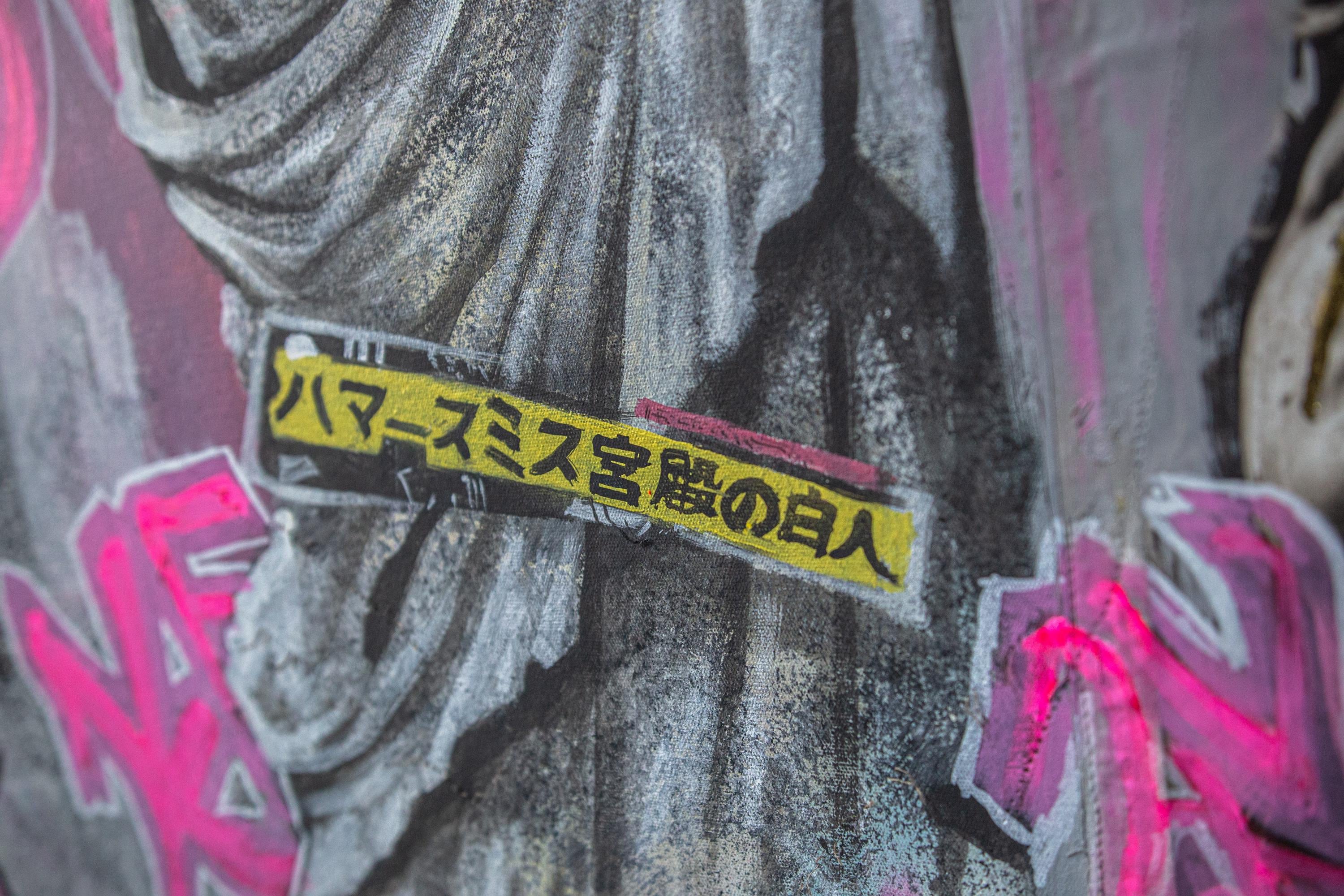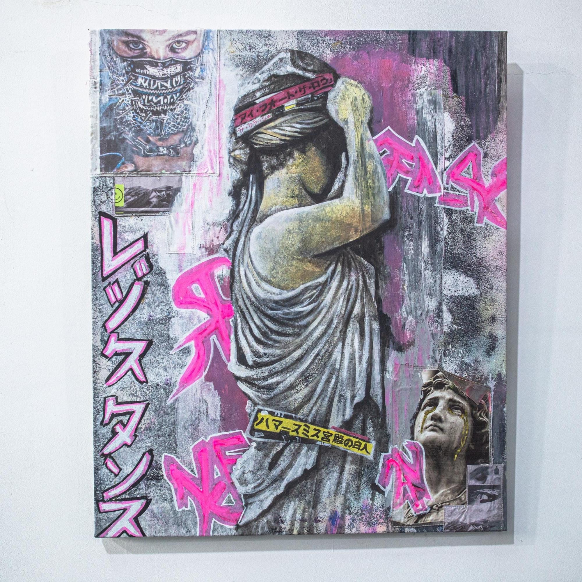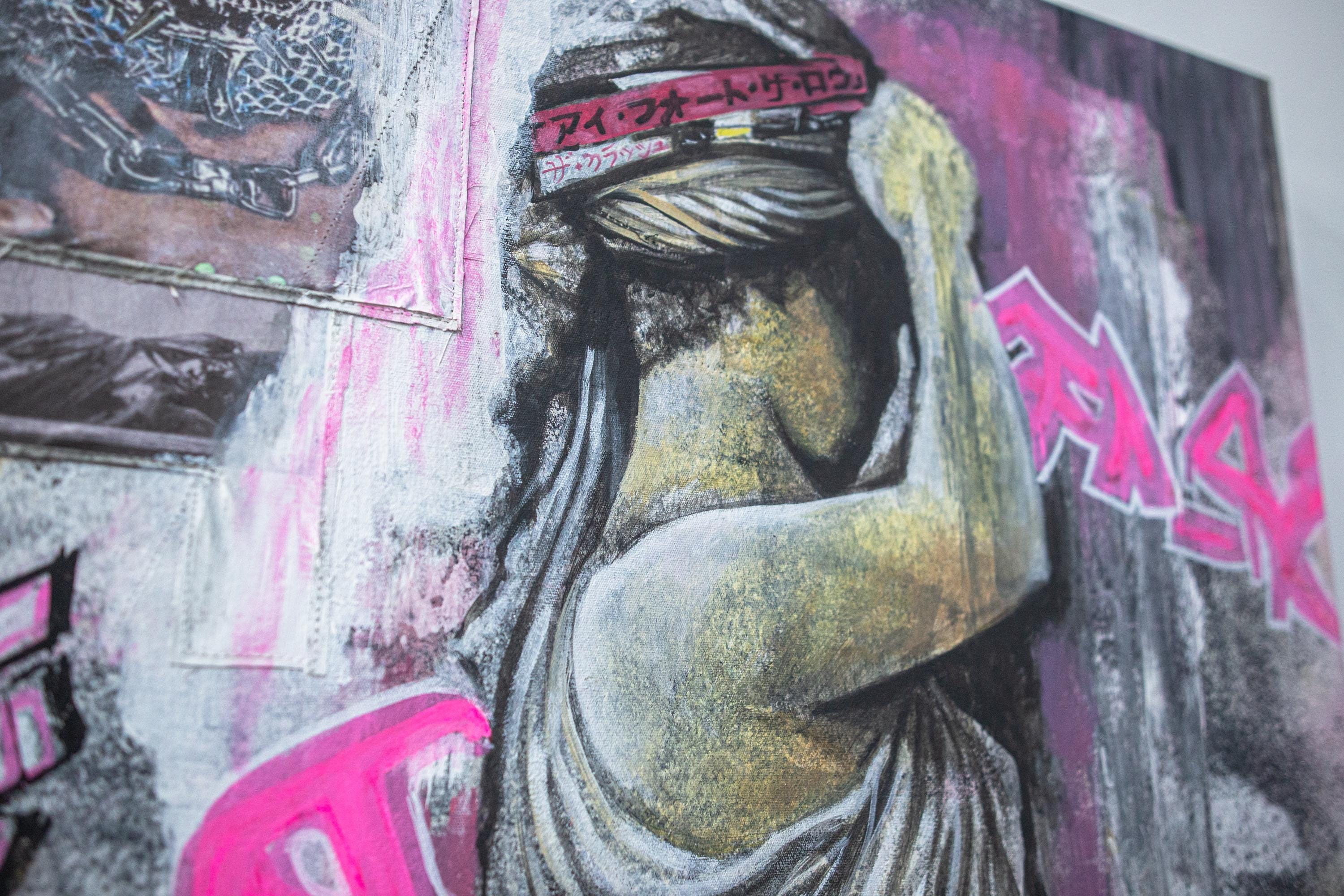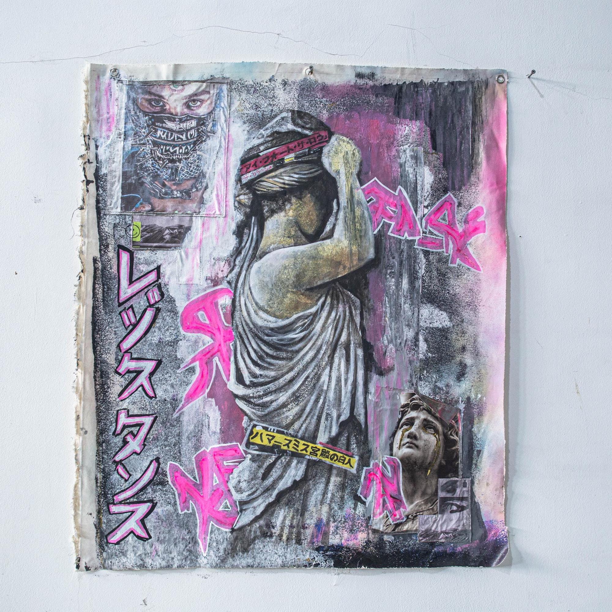Imperial Resistance is a Dust & Beau original, built from a collision of worlds we love — ancient sculpture, cyberpunk energy, and raw street protest grit. We took a classical Greek figure and dropped her straight into an urban riot of neon pink tags, distressed textures, and Japanese typography.