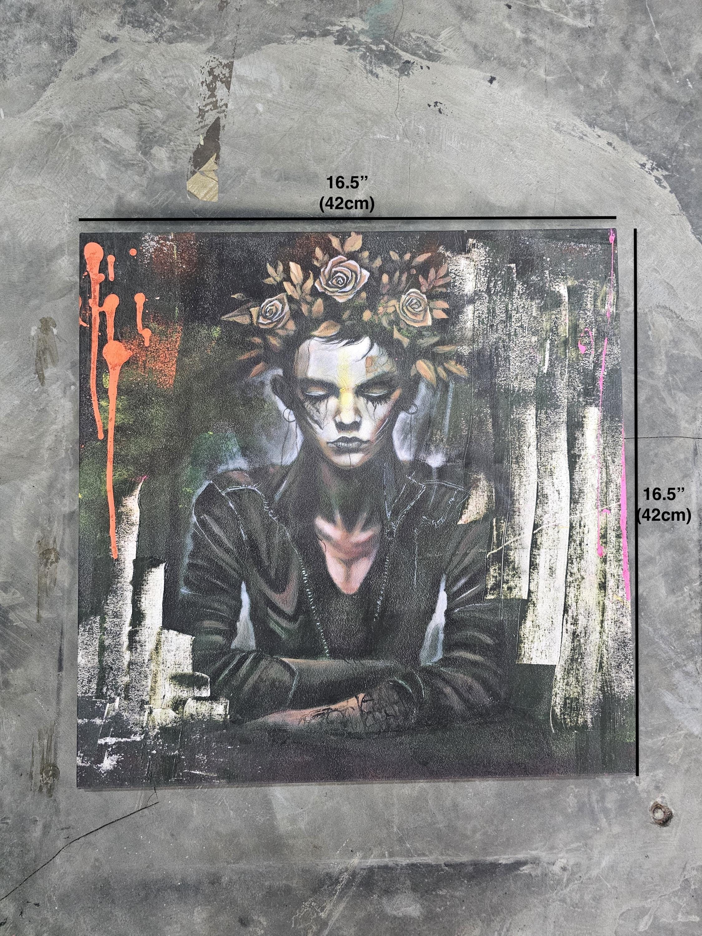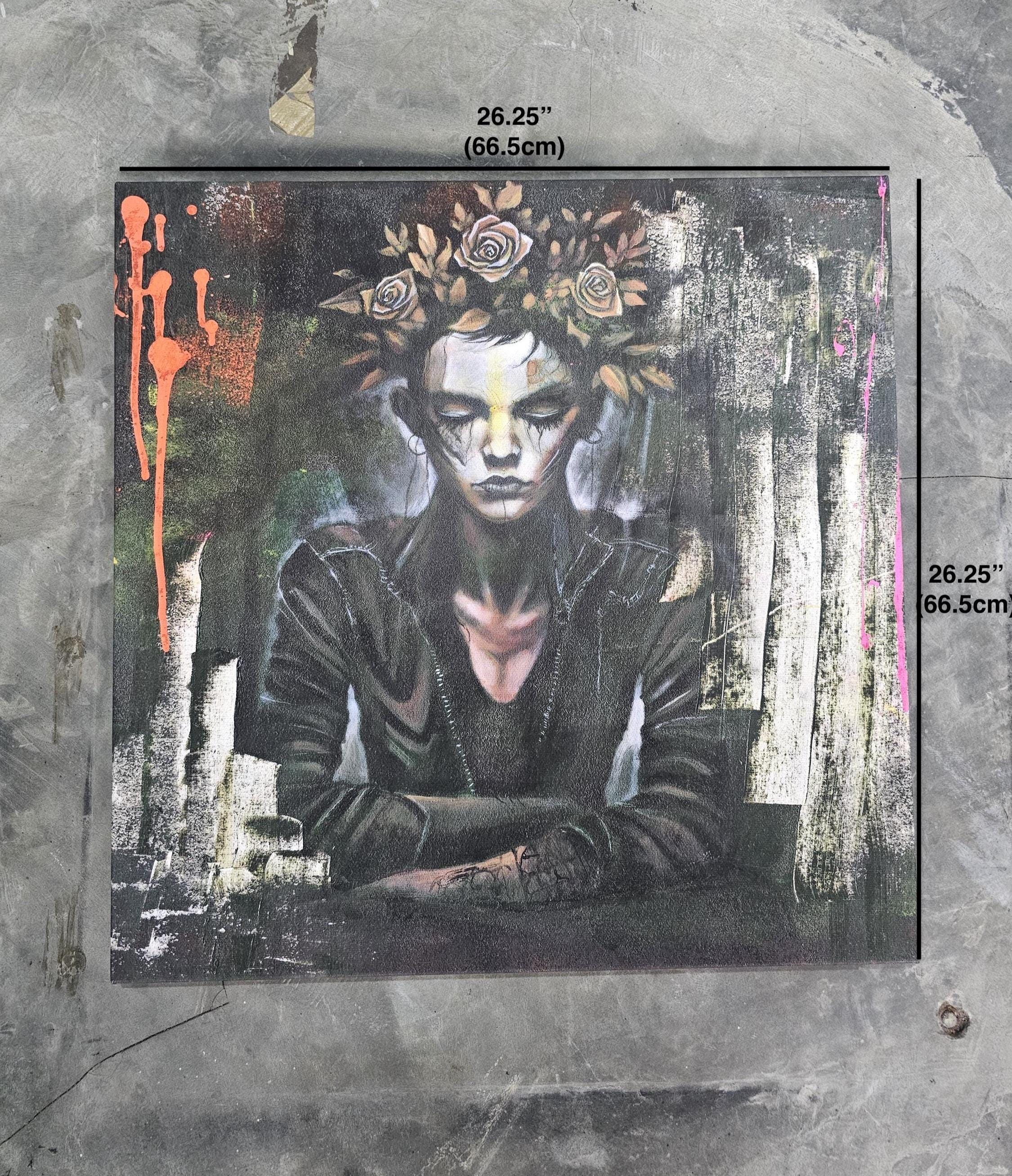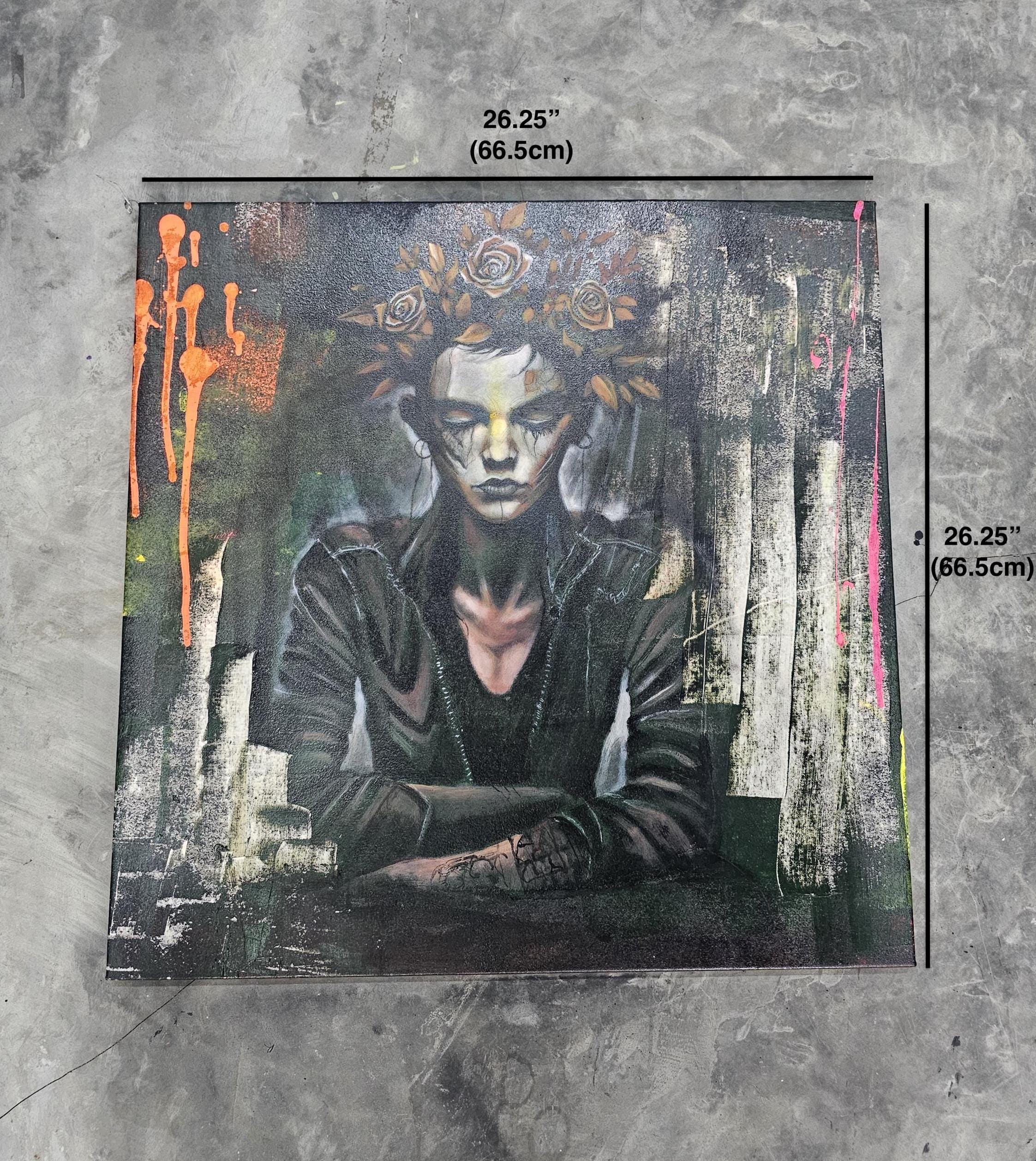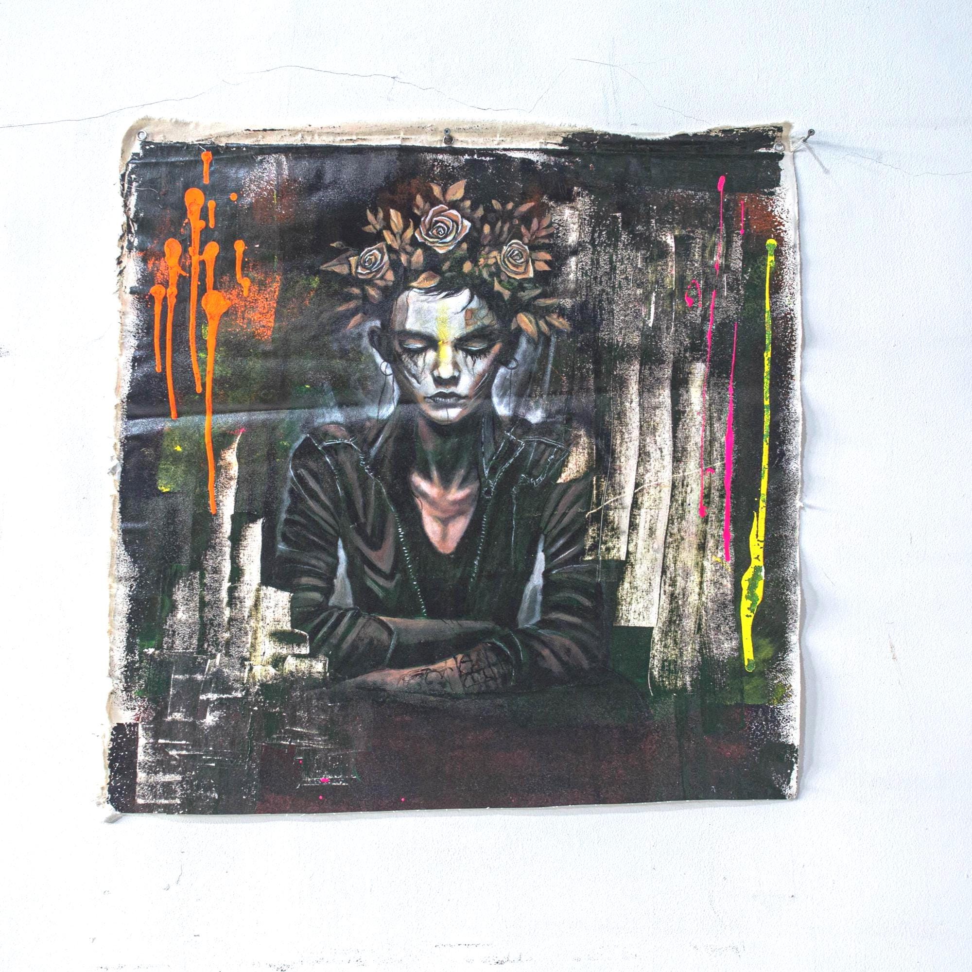“Crown of Silence” is a Dust & Beau original, capturing stillness amid chaos — a figure adorned with a crown of roses, eyes closed in defiance or serenity. The portrait fuses street-art energy and gothic introspection, rendered in layered paint and textured strokes of decay and rebirth. Electric hues of orange and pink pierce through dark, muted tones, echoing inner conflict and transformation.