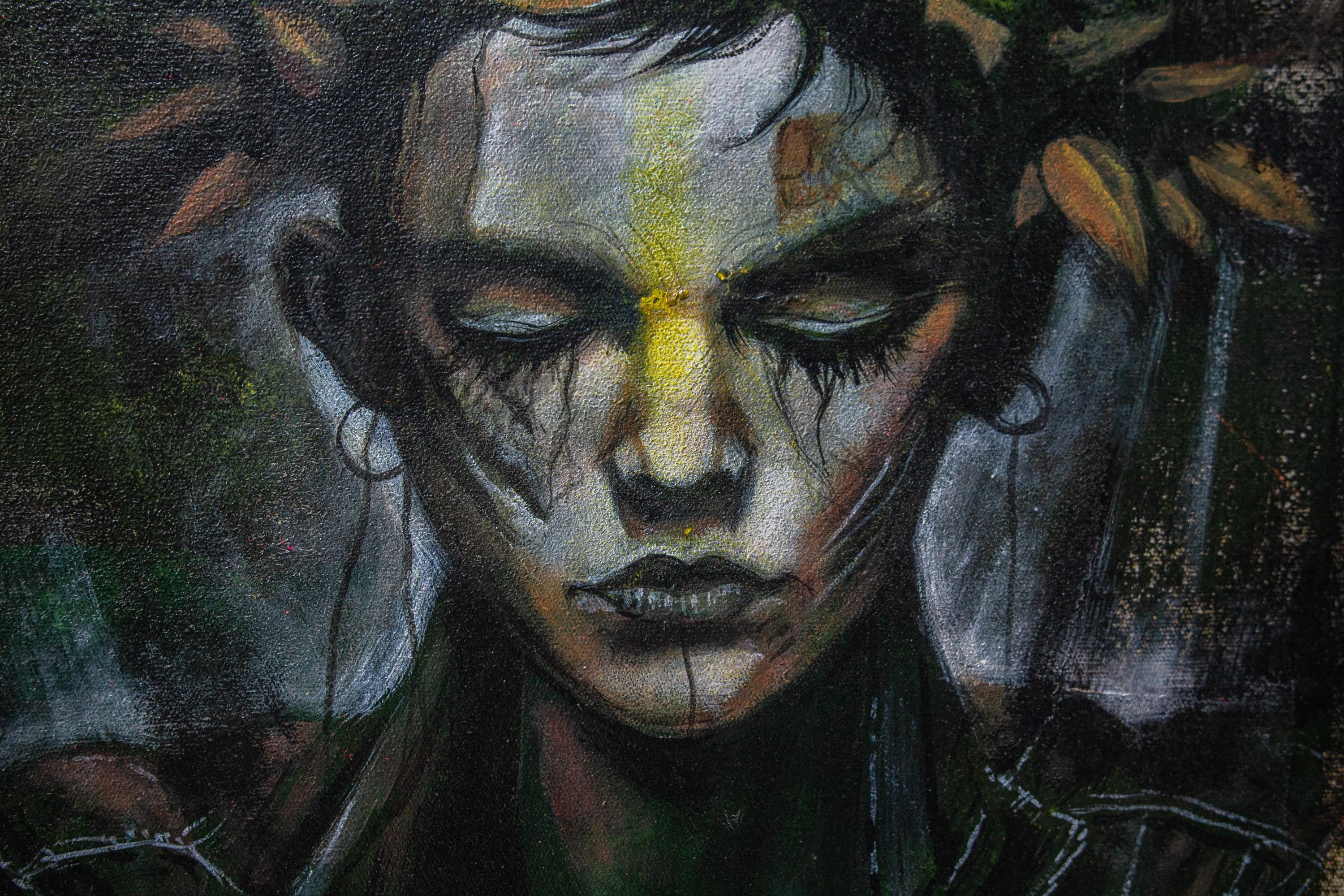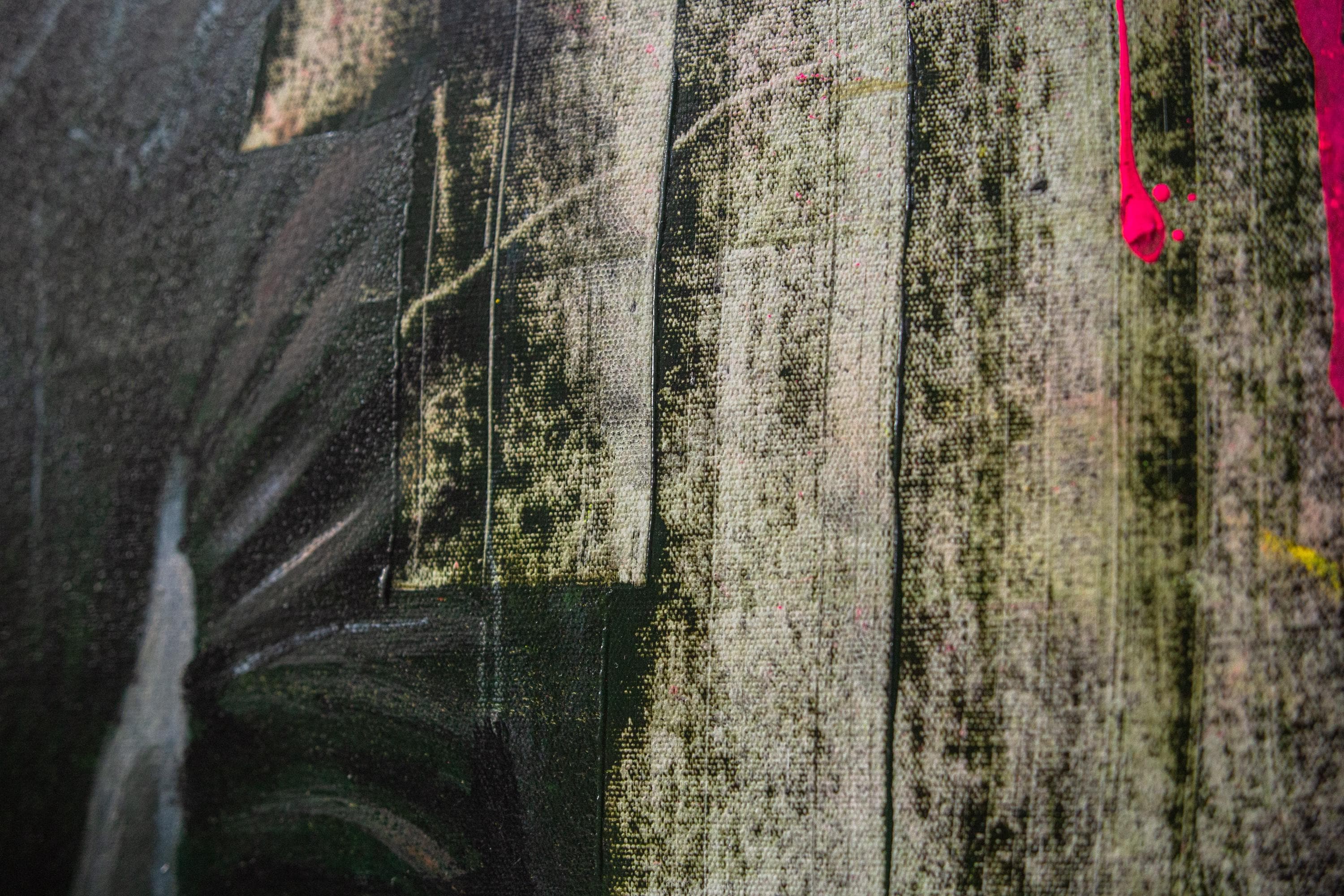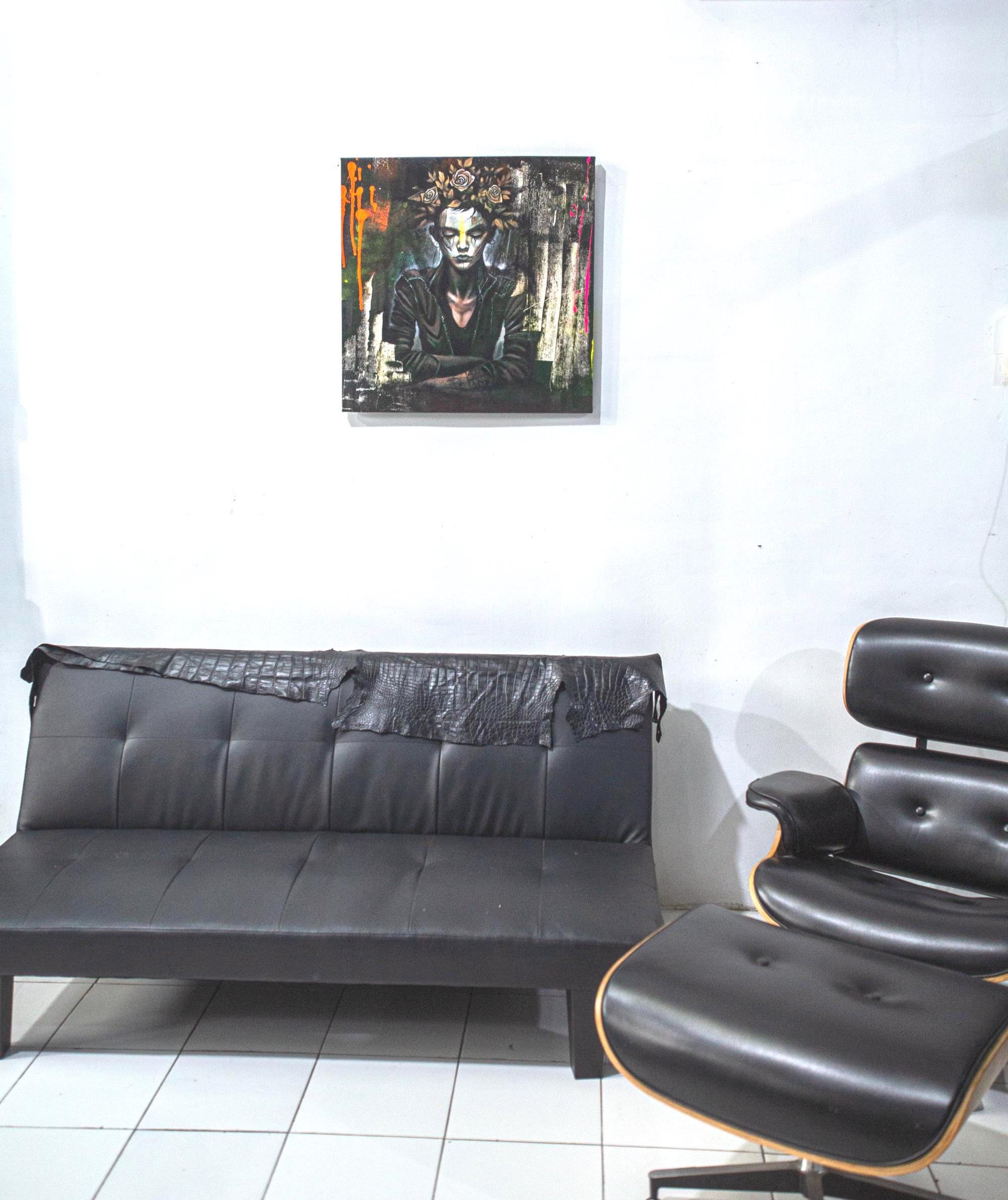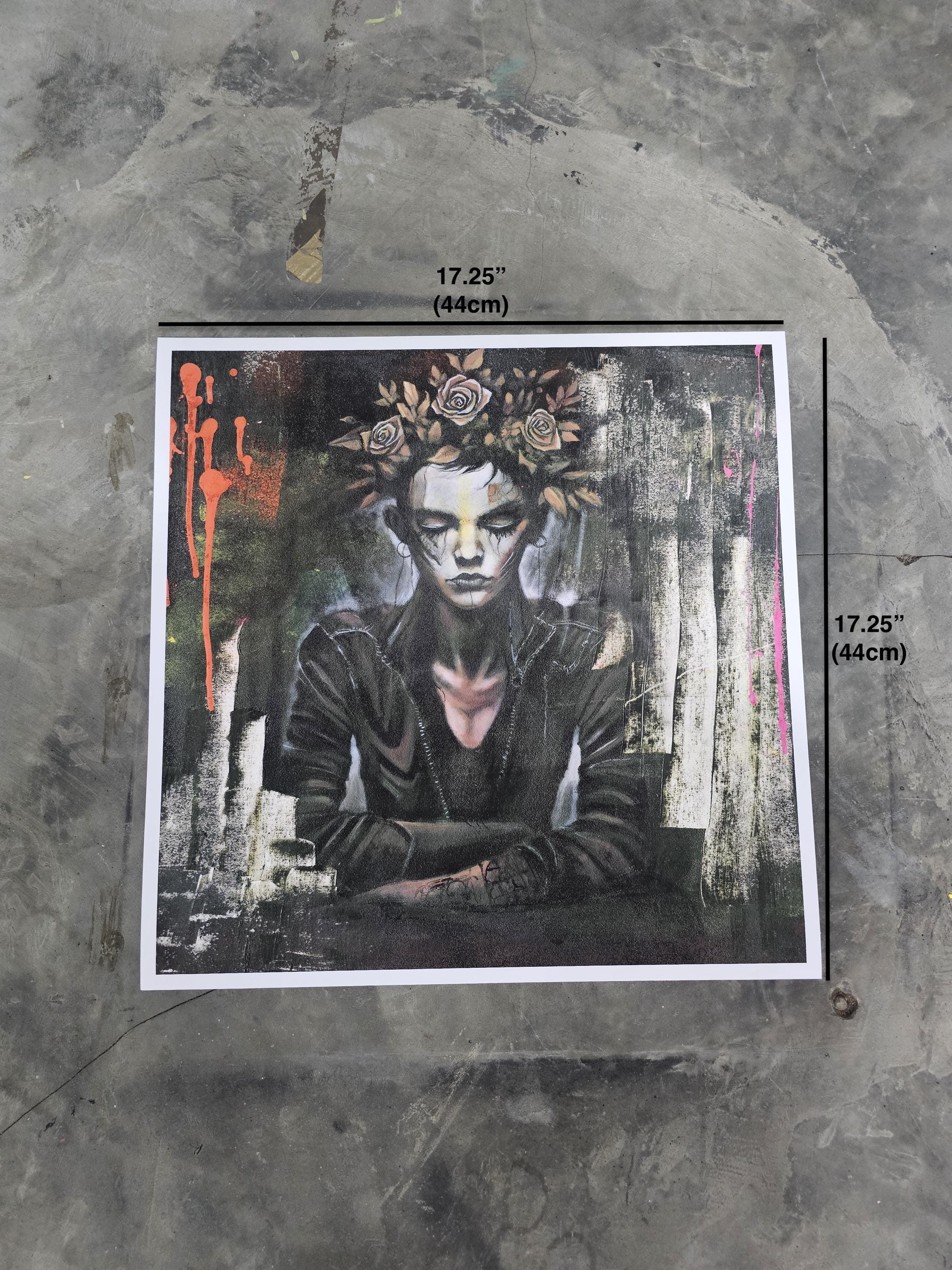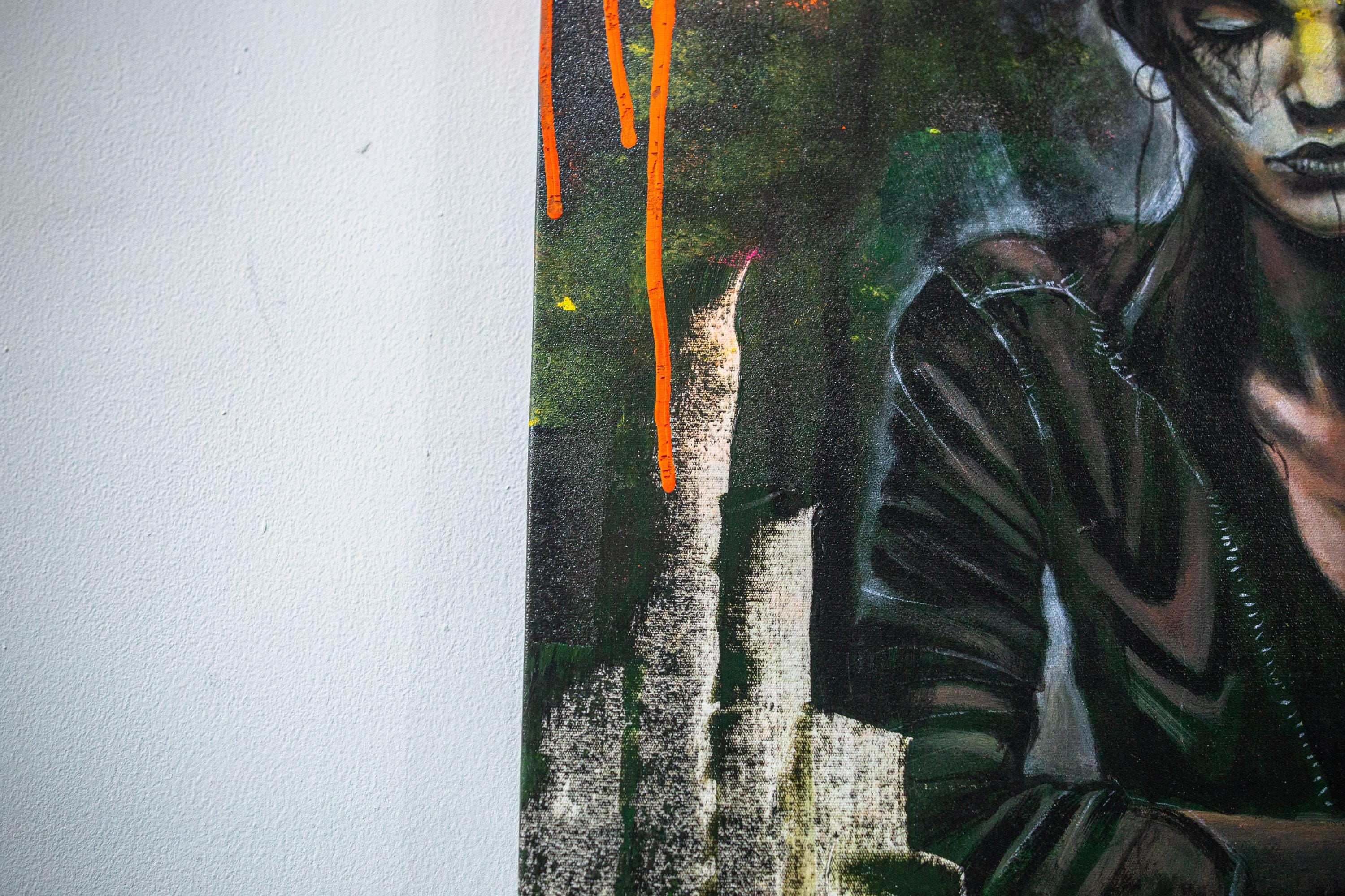 “Crown of Silence” is a Dust & Beau original, capturing stillness amid chaos — a figure adorned with a crown of roses, eyes closed in defiance or serenity. The portrait fuses street-art energy and gothic introspection, rendered in layered paint and textured strokes of decay and rebirth. Electric hues of orange and pink pierce through dark, muted tones, echoing inner conflict and transformation.