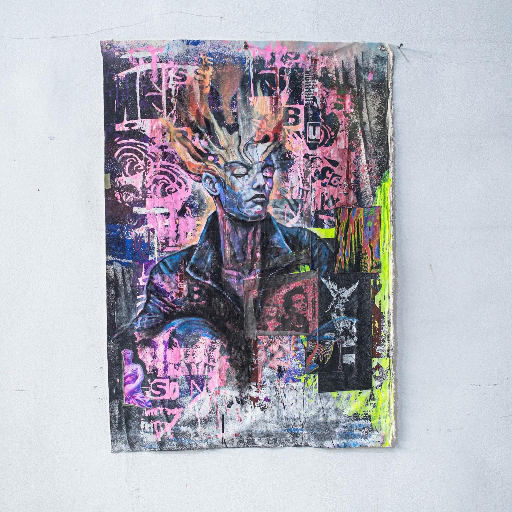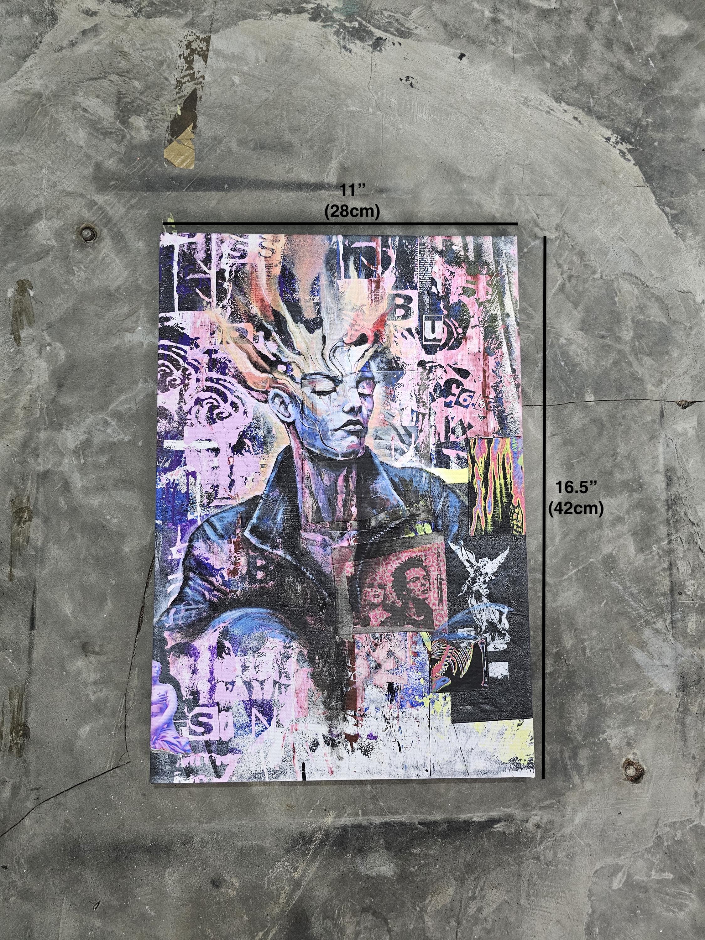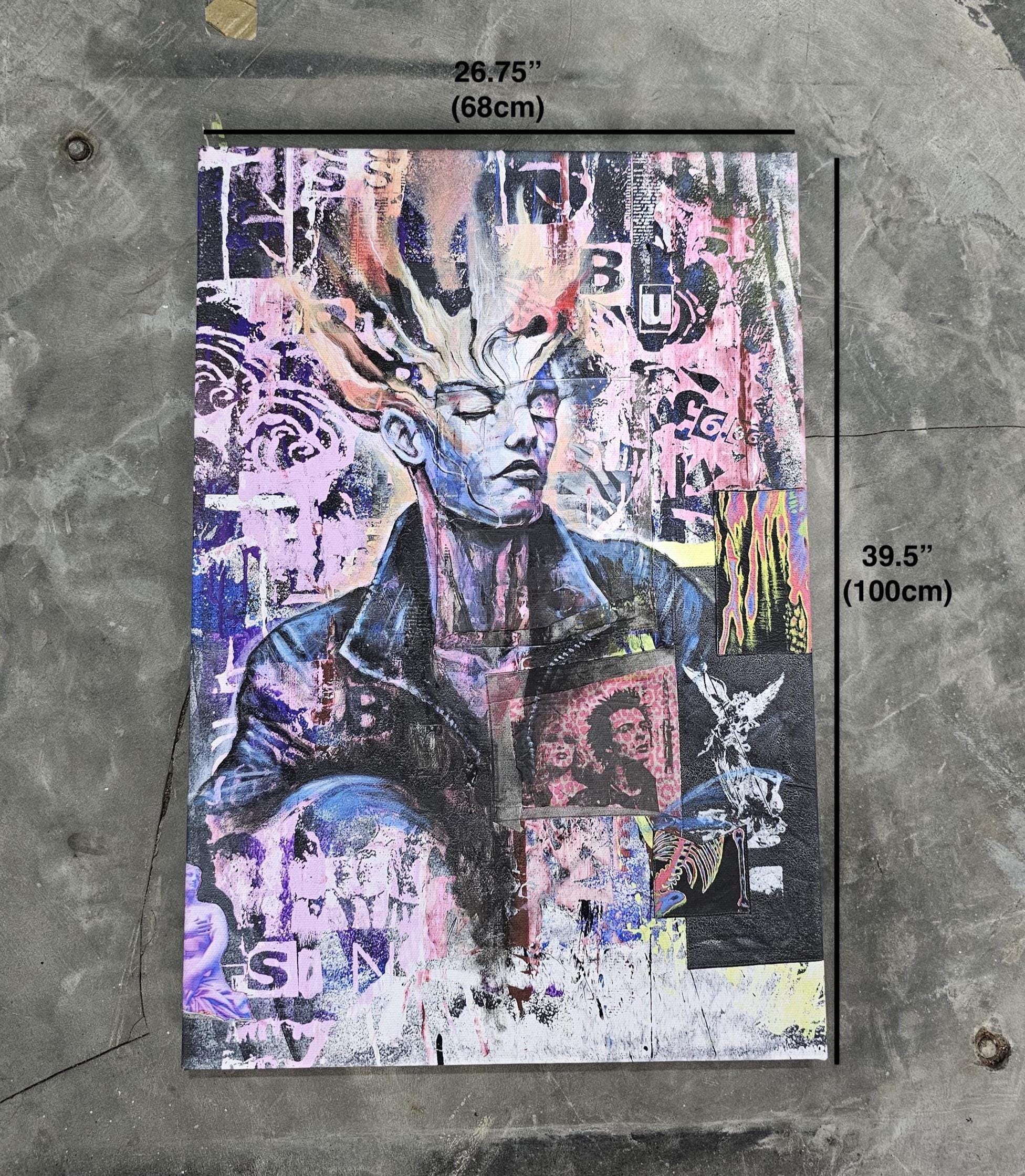 Created using acrylic paint, spray paint, silkscreen passes, stitched leather fragments, heat-pressed fabric graphics, and layered collage techniques. Textures were built up over multiple sessions to create ridges, shadows, and distressed surfaces that echo the feeling of an urban wall layered with years of posters, paint, and ghosts. Prints are captured in high resolution and reproduced as archival giclées on canvas or fine-art paper.
