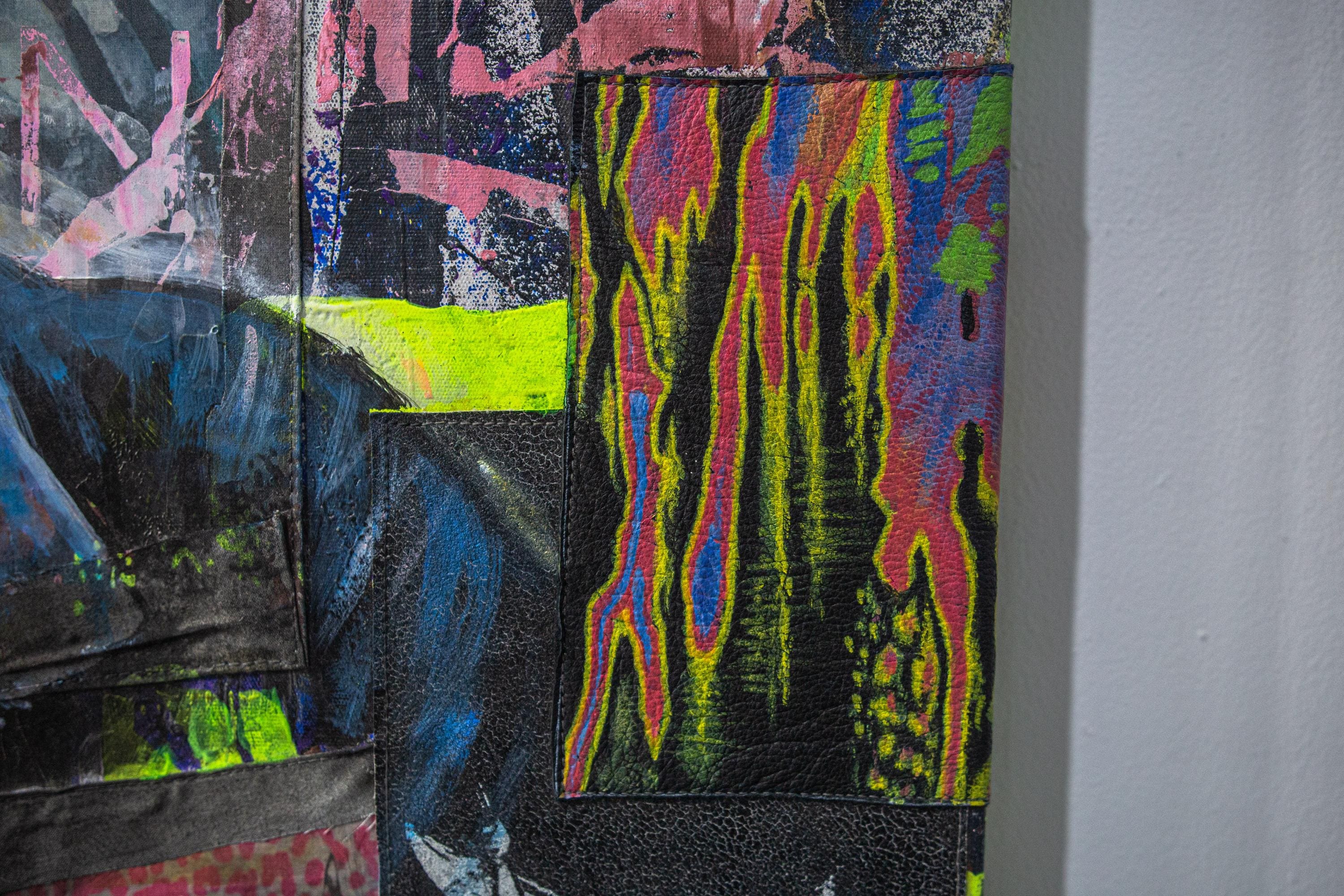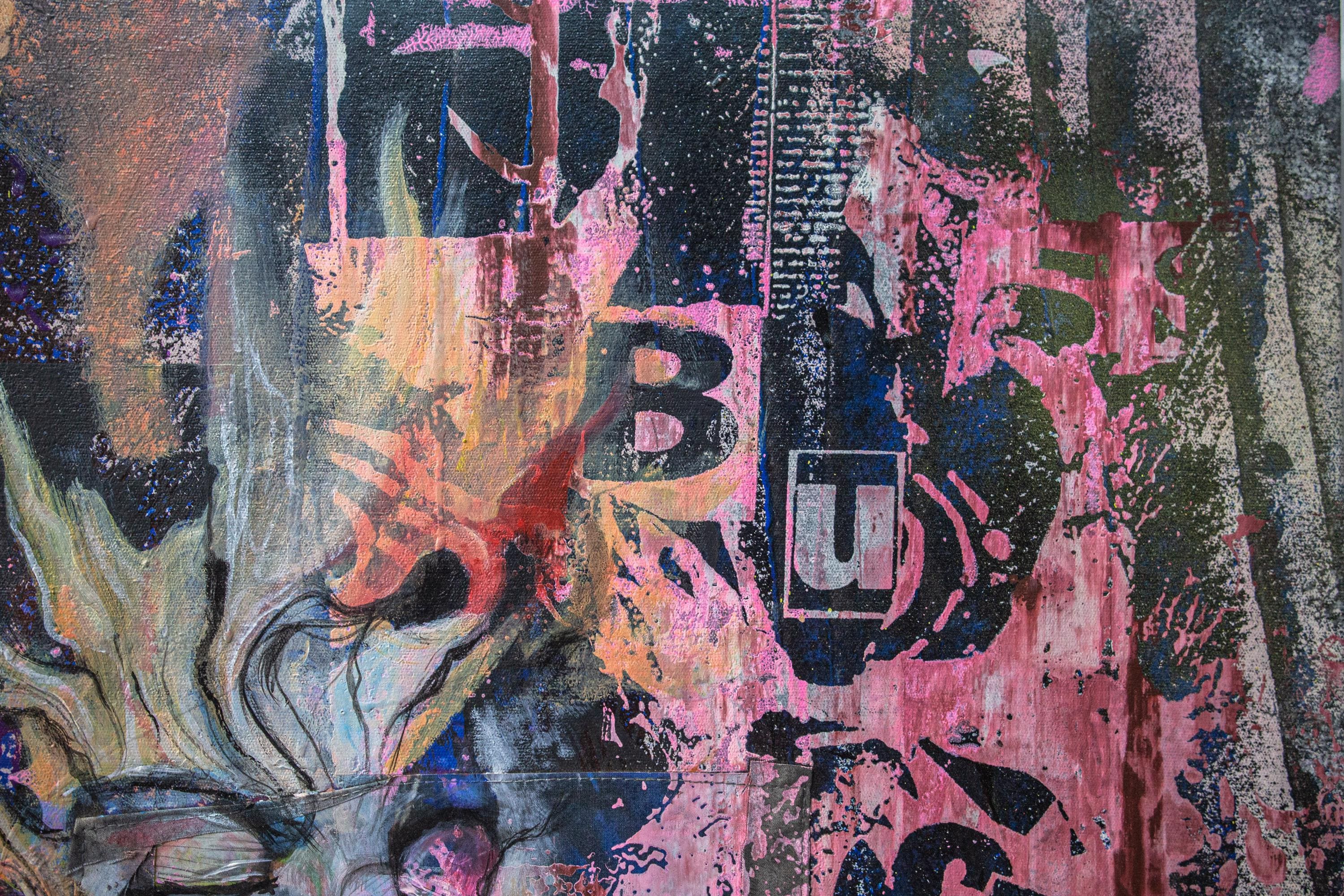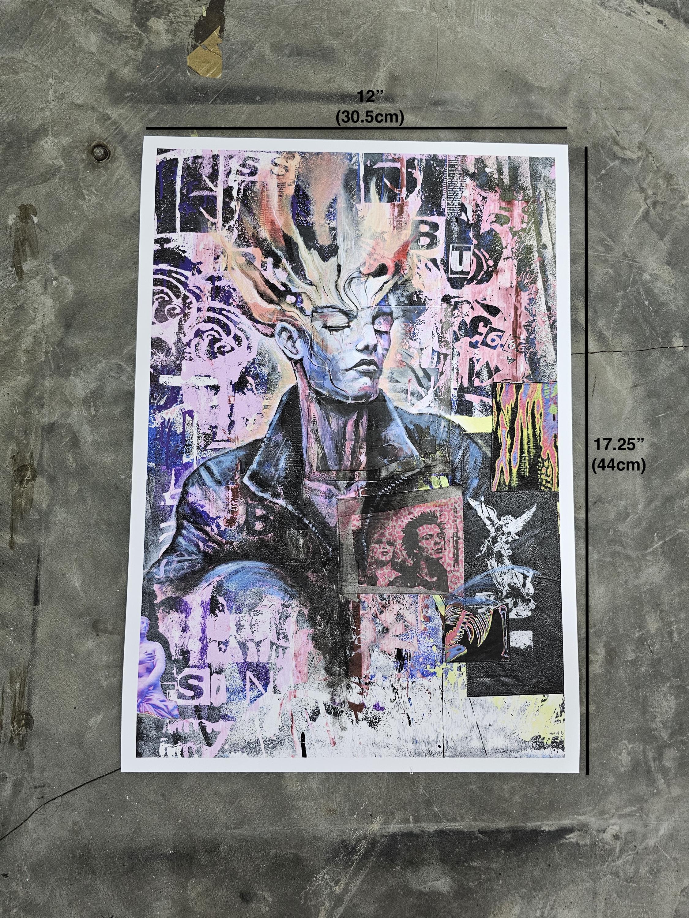 Created using acrylic paint, spray paint, silkscreen passes, stitched leather fragments, heat-pressed fabric graphics, and layered collage techniques. Textures were built up over multiple sessions to create ridges, shadows, and distressed surfaces that echo the feeling of an urban wall layered with years of posters, paint, and ghosts. Prints are captured in high resolution and reproduced as archival giclées on canvas or fine-art paper.
