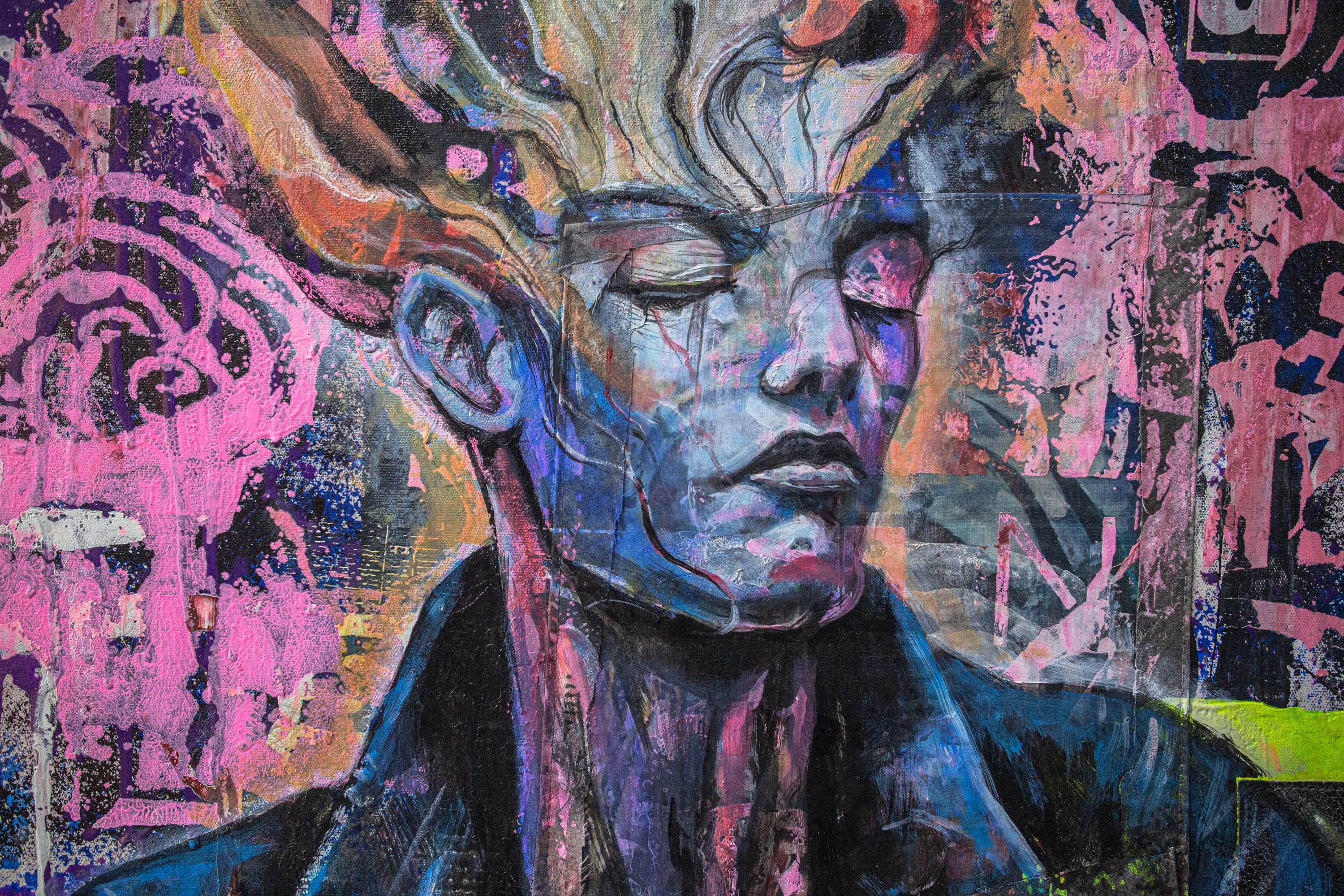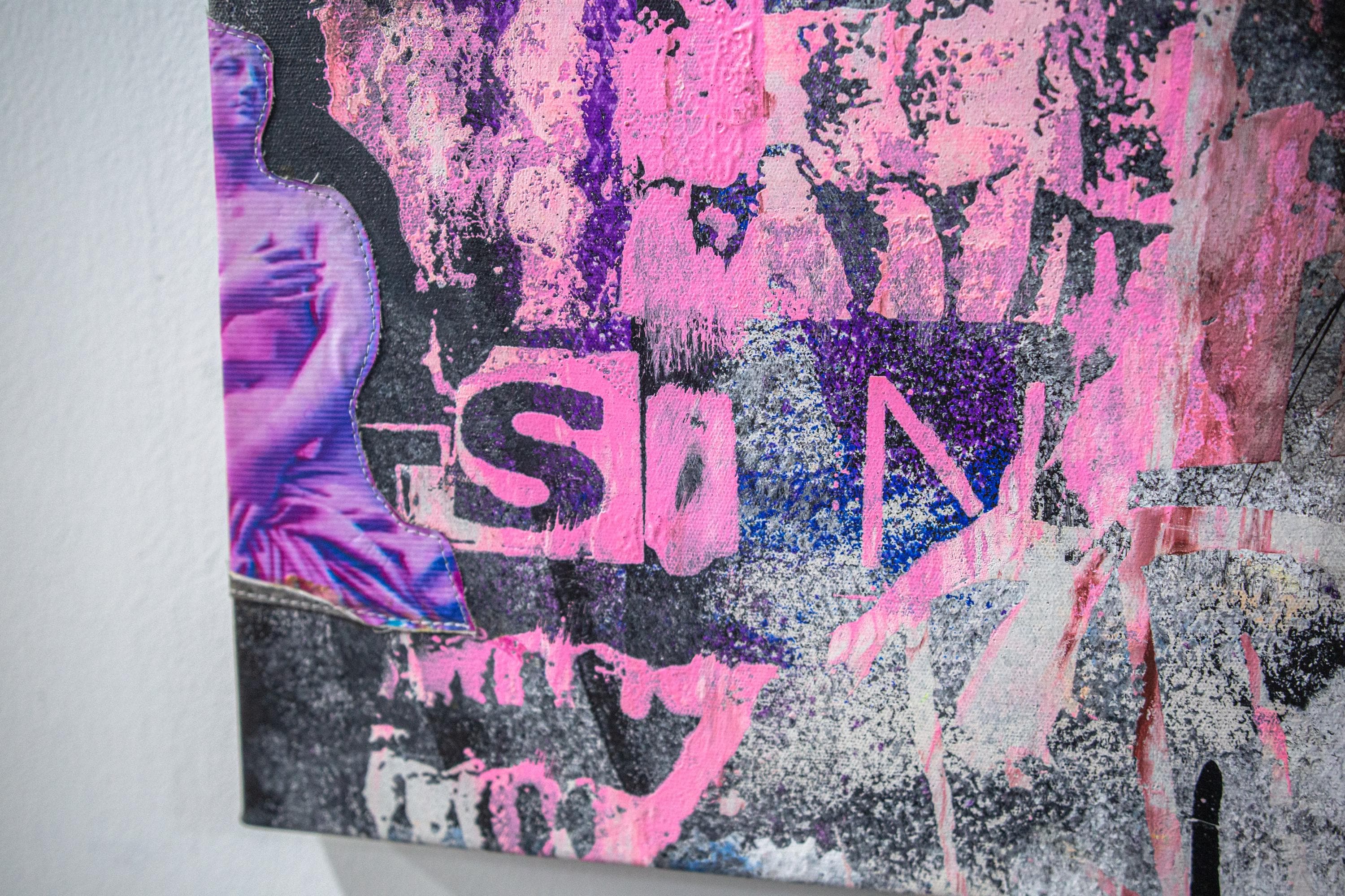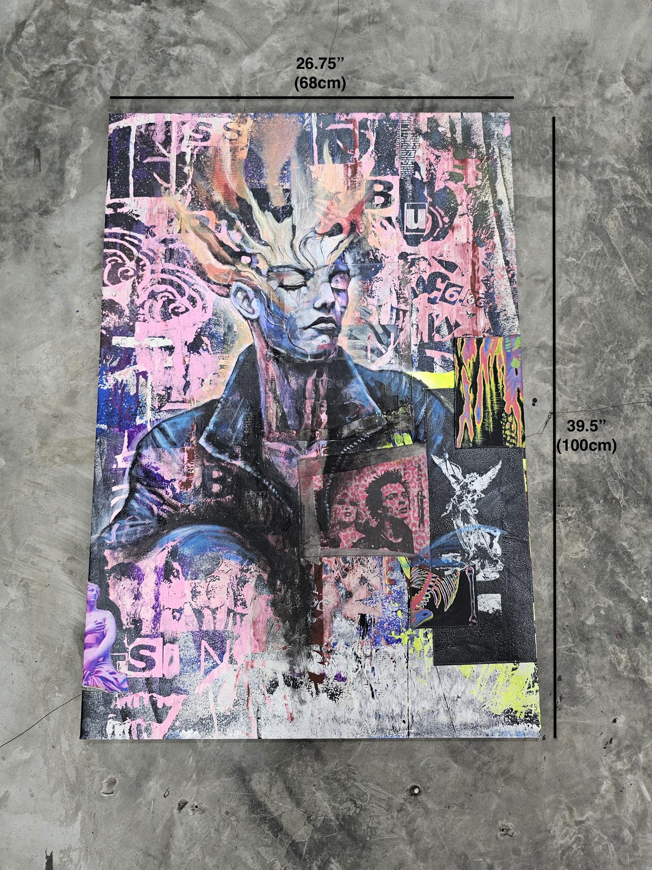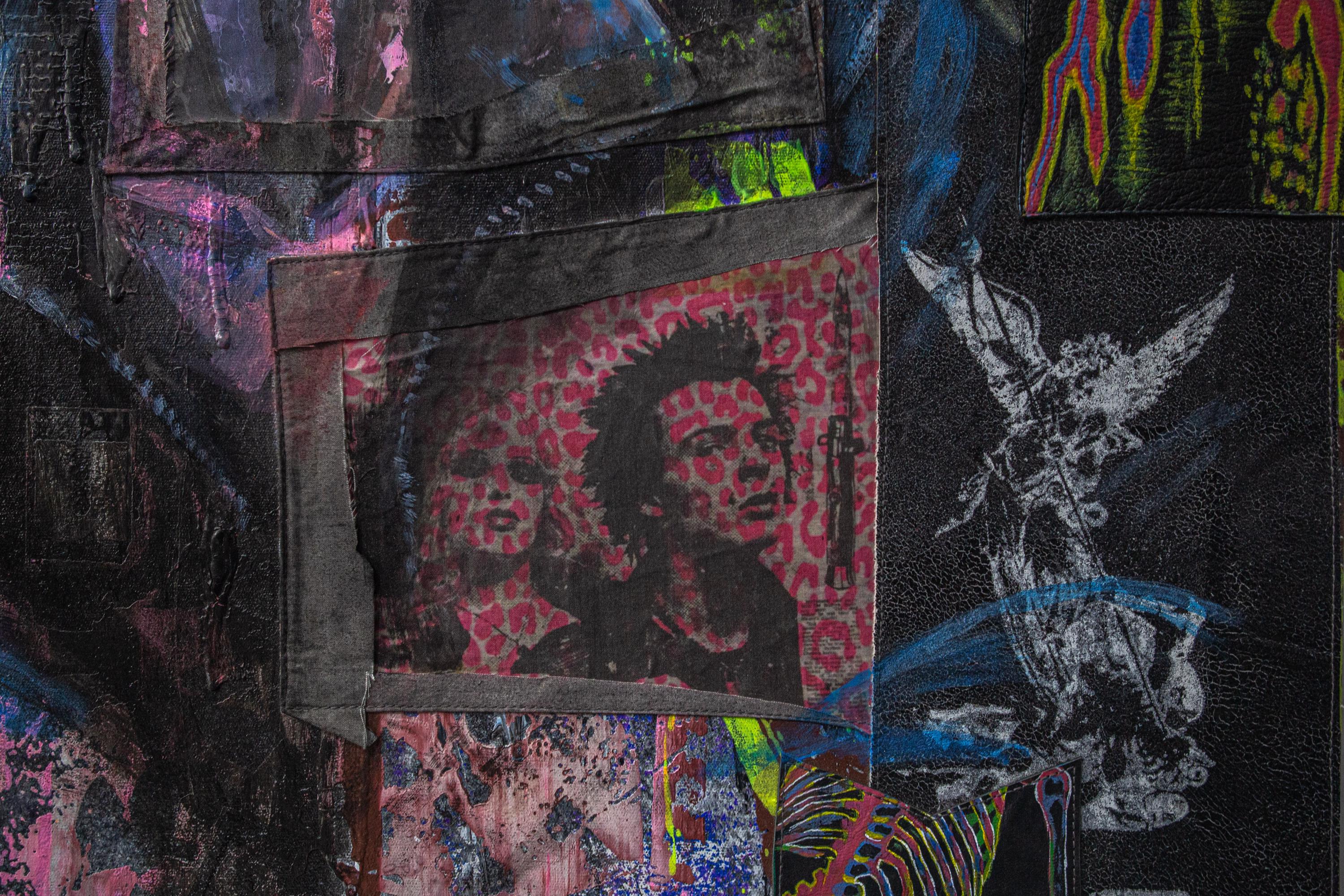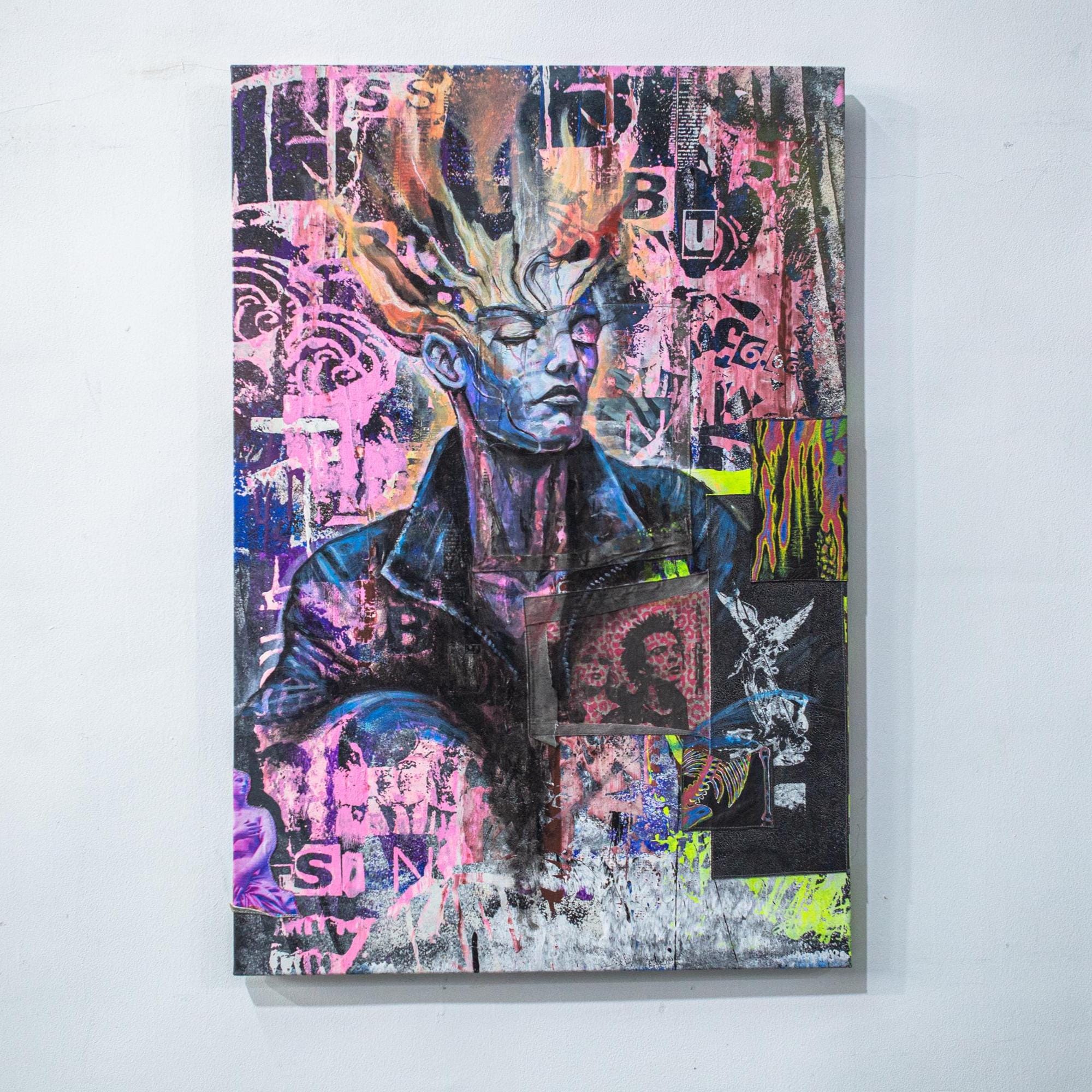 Voltage Chaos is a Dust & Beau original built from layers of mixed-media chaos — a collision of silkscreen textures, stitched leather cut-outs, heat-pressed fabric imagery, and street-art color bursts. The central figure sits between divinity and decay, rendered in shadowed tones while neon pinks, electric yellows, and layered graffiti textures pulse around them like static or prayer signals. The result is a portrait that feels both sacred and unhinged — a shrine to rebellion, identity, and noise.