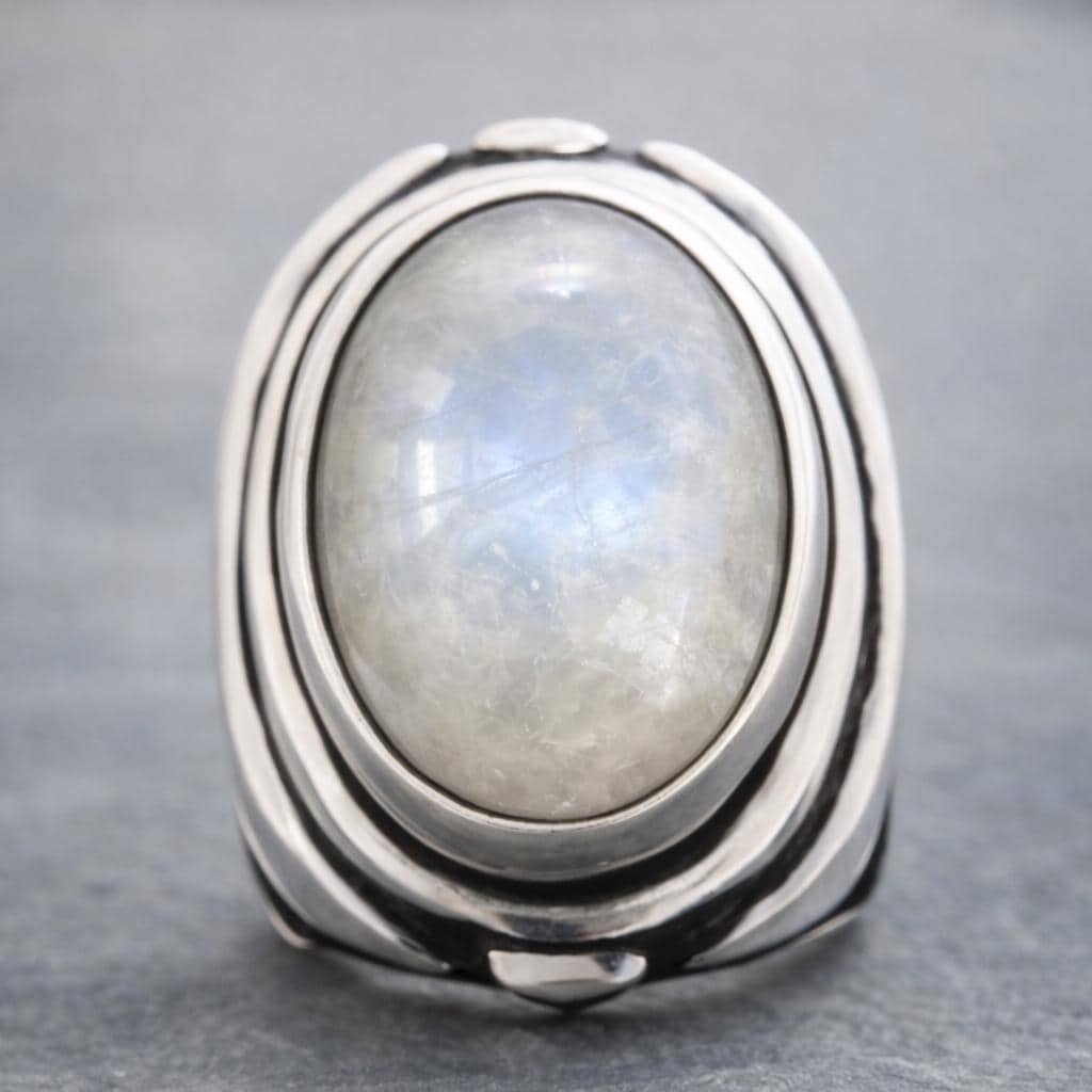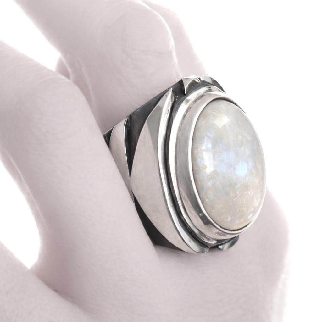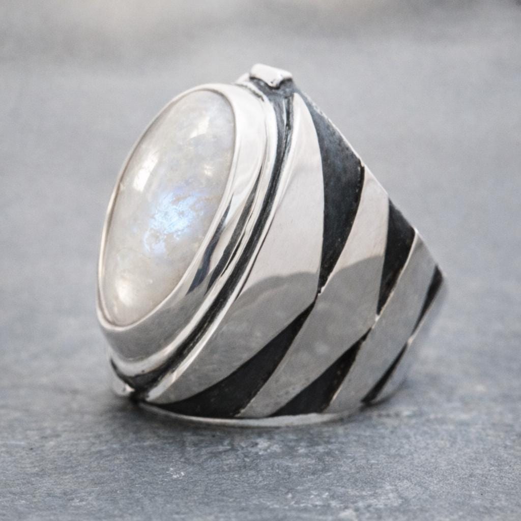 The Moonstone Chevron Ring is handcrafted from solid 925 sterling silver and set with a natural moonstone held in a bold chevron-style setting. Its sculptural band features strong geometric lines with subtle oxidized detailing, creating a powerful silhouette that feels ethereal, intentional, and timeless.