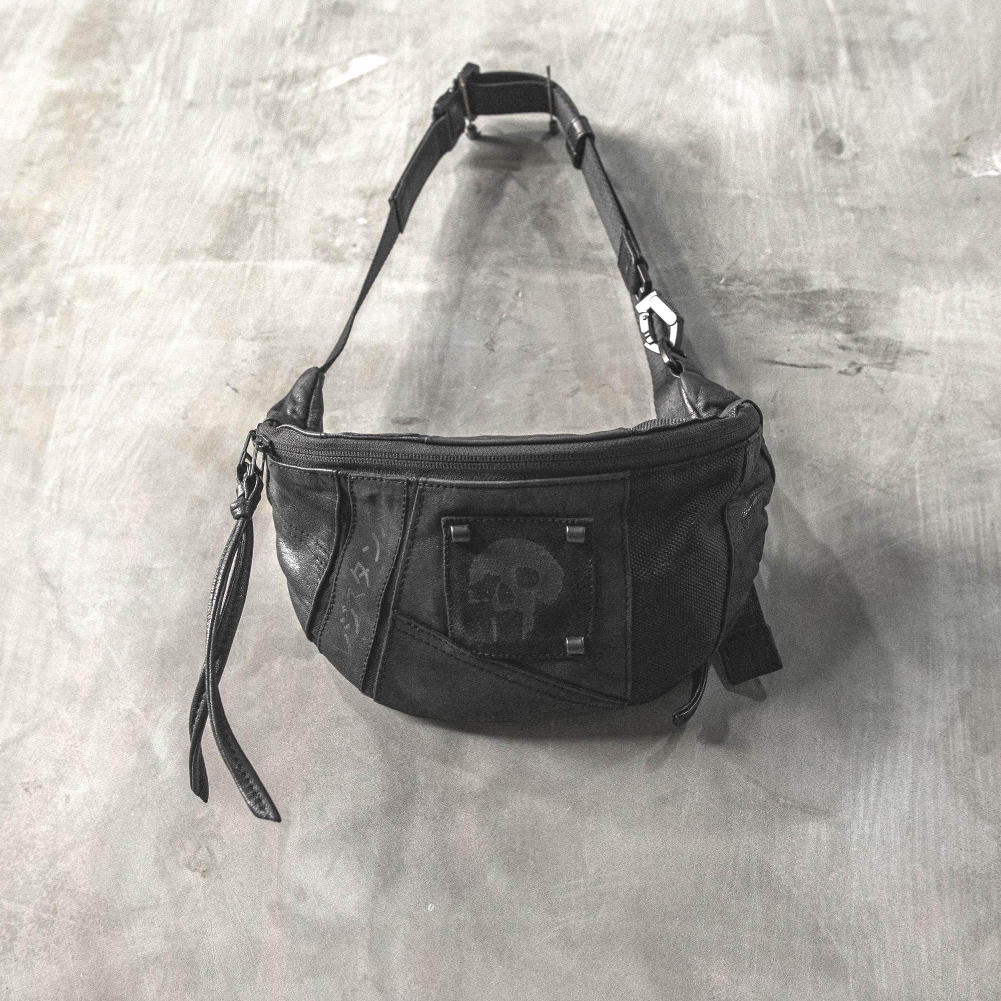 Layered panels of leather and canvas create depth through multiple shades and textures of black, giving the bag a subtle dimensional look while maintaining a clean monochrome aesthetic. A katakana patch reading “Resistance” (抵抗 / Teikō) sits alongside a black-on-black skull patch, adding a quiet rebellious signature.