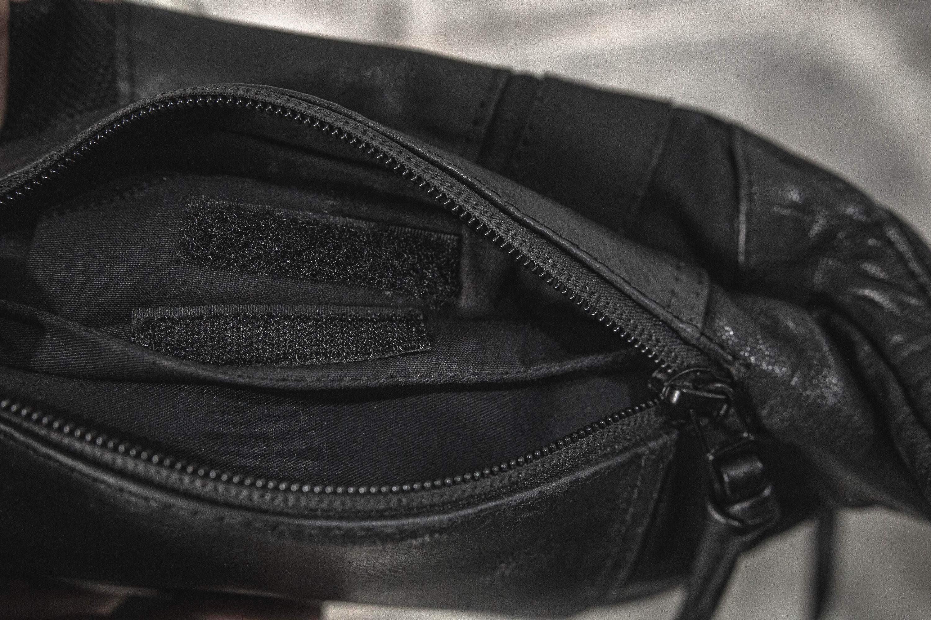 The Blackout Pack is a black leather and durable canvas fanny pack / crossbody waist bag designed for festivals, travel, and everyday carry.