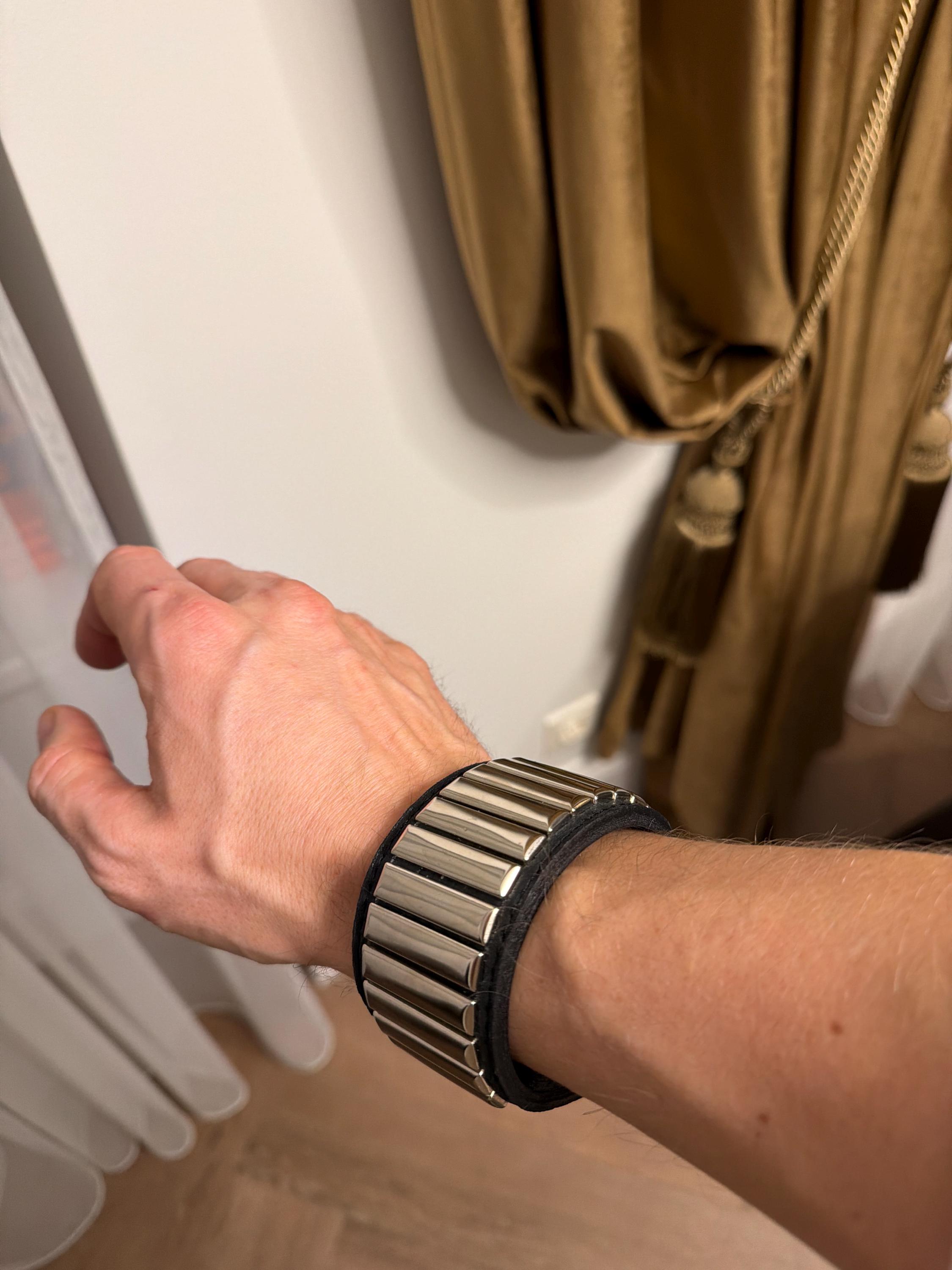 This bracelet is awesome, the genuine leather feels smooth on my skin....and I love the four pin clasp into the leather....very cool....Thank you.