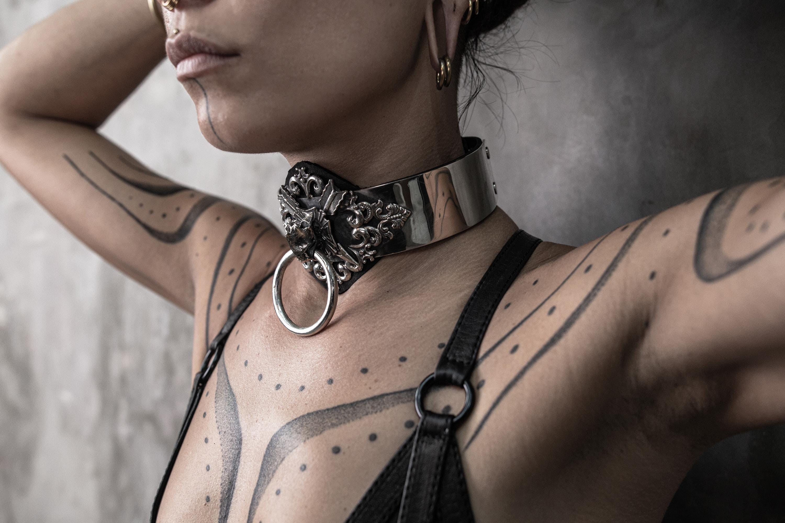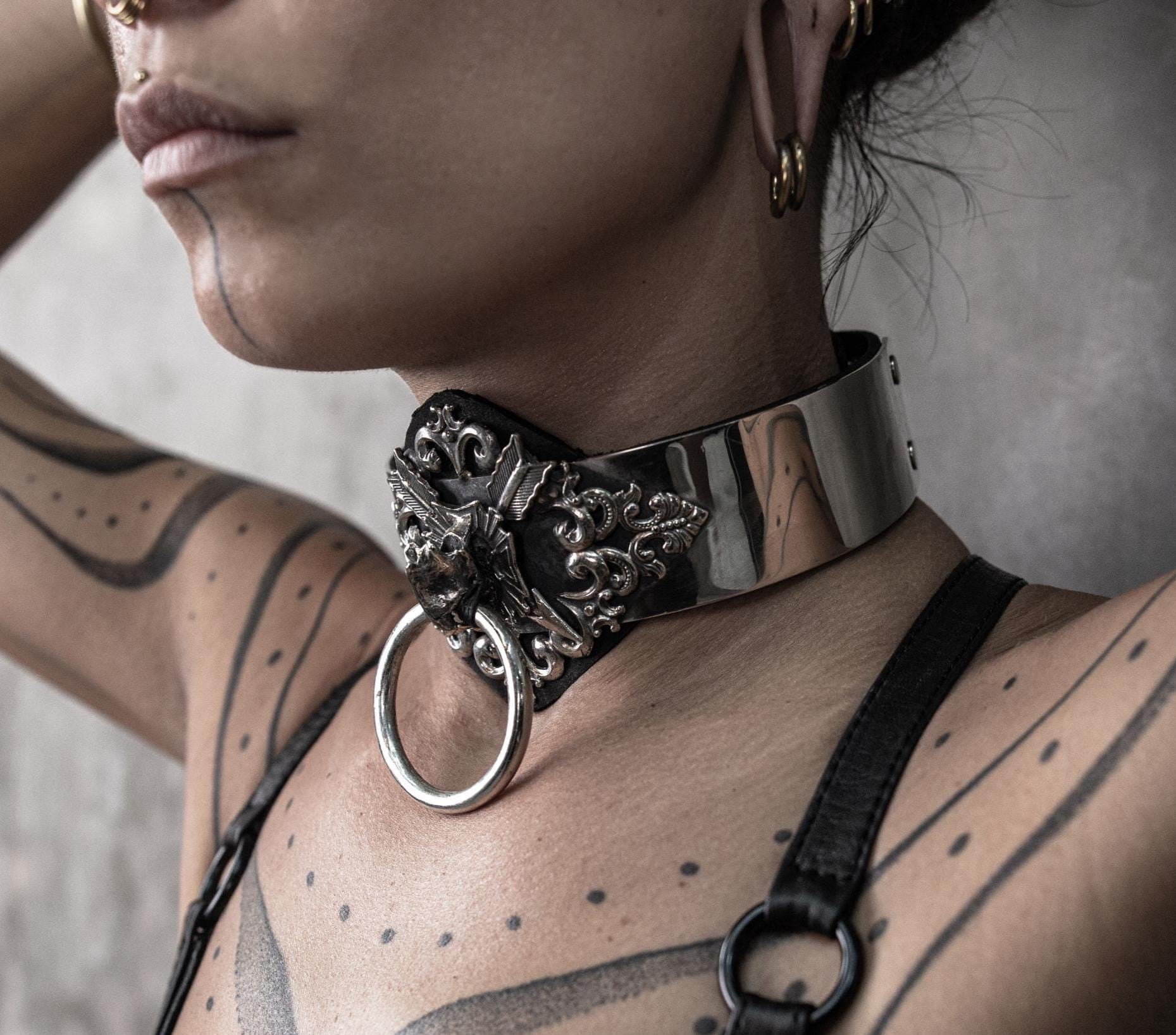 The sinister elegance of Victoriana goth couture. This choker is both a statement piece for the wearer and the Gifter, as either you're making it be known you are owned -OR- you are the Owner. Domme vibes come alive in this HIGHLY ornate stunner piece. When you or your pet isn't wearing this, may we suggest a glass museum case next to your finest whips and floggers ?
