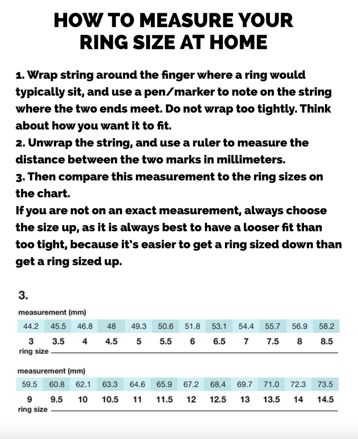 If you do not know your ring size, the last photo includes a chart showing how to measure at home, or you can download a ring sizing app on your phone for guidance.