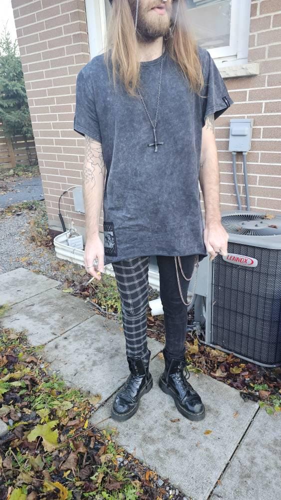 Ultra soft, relaxed fit charcoal tee features a hand sewn patch on the front, with a re-enforced matte charcoal skull charm on the raw hi-lo hem.